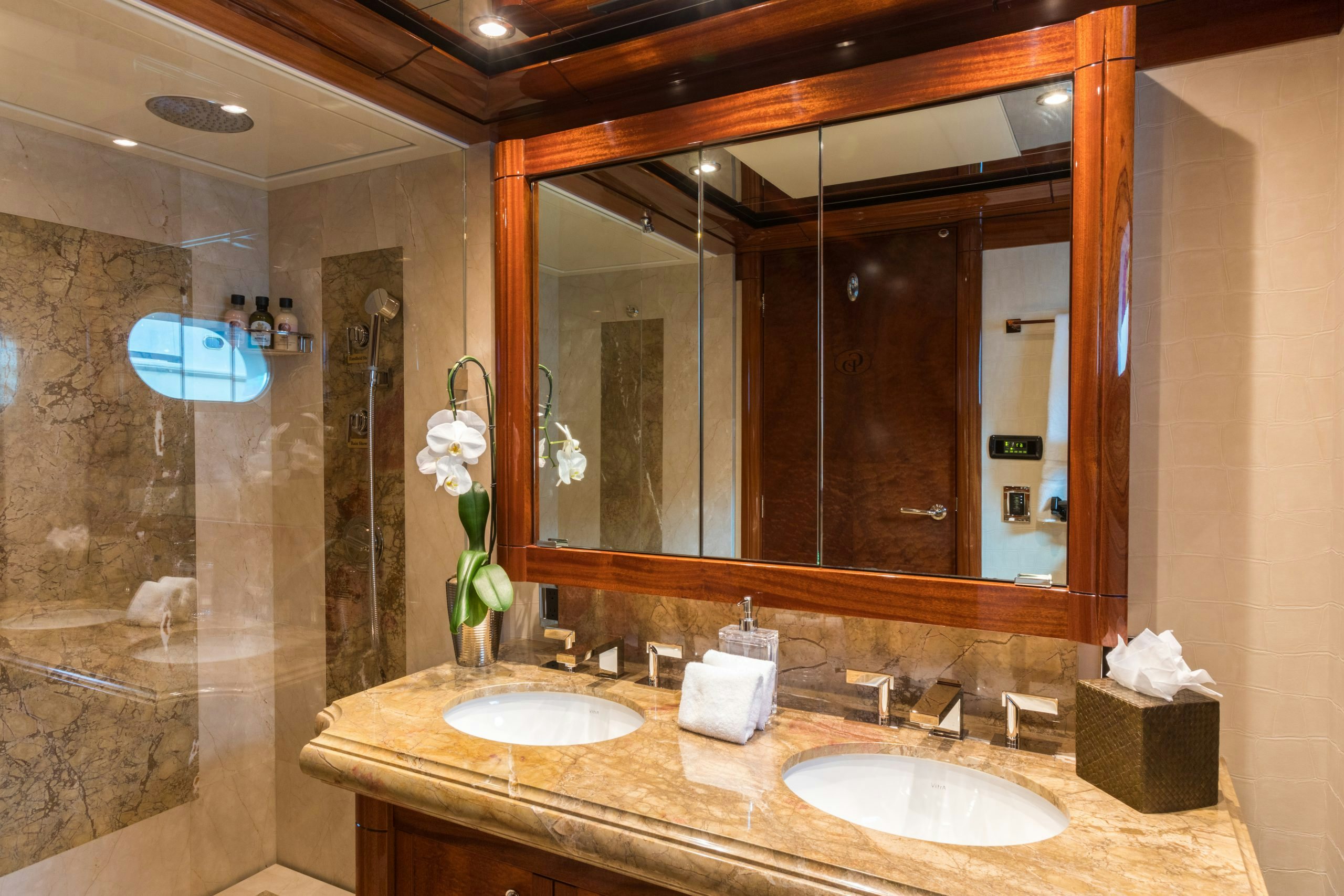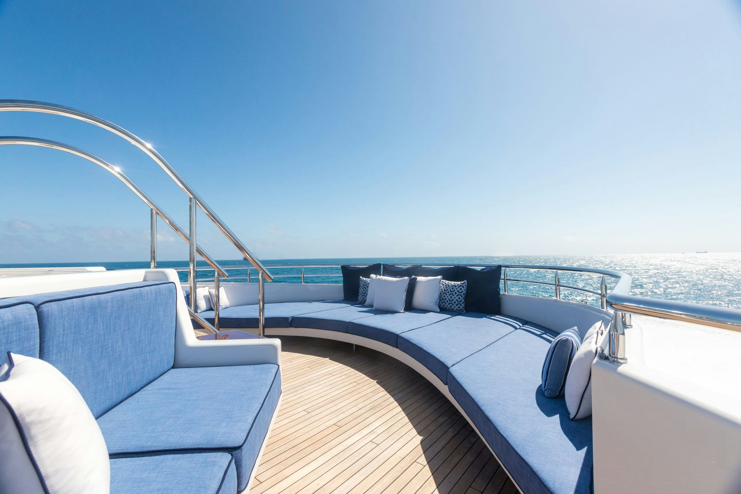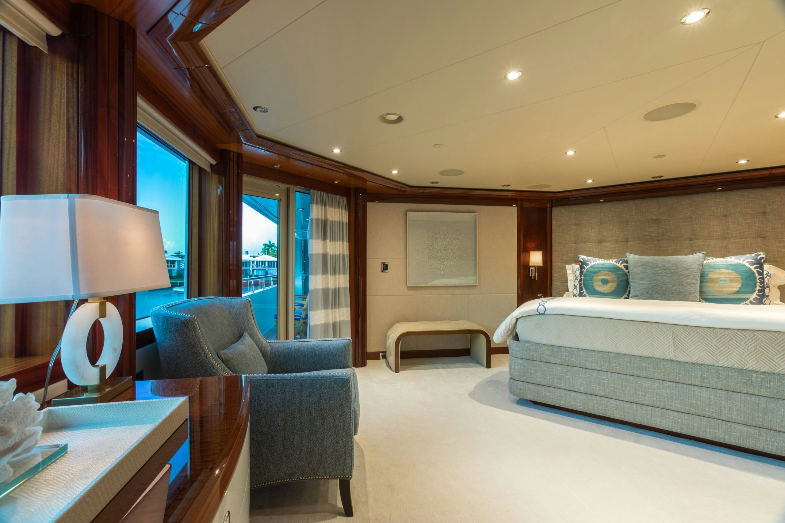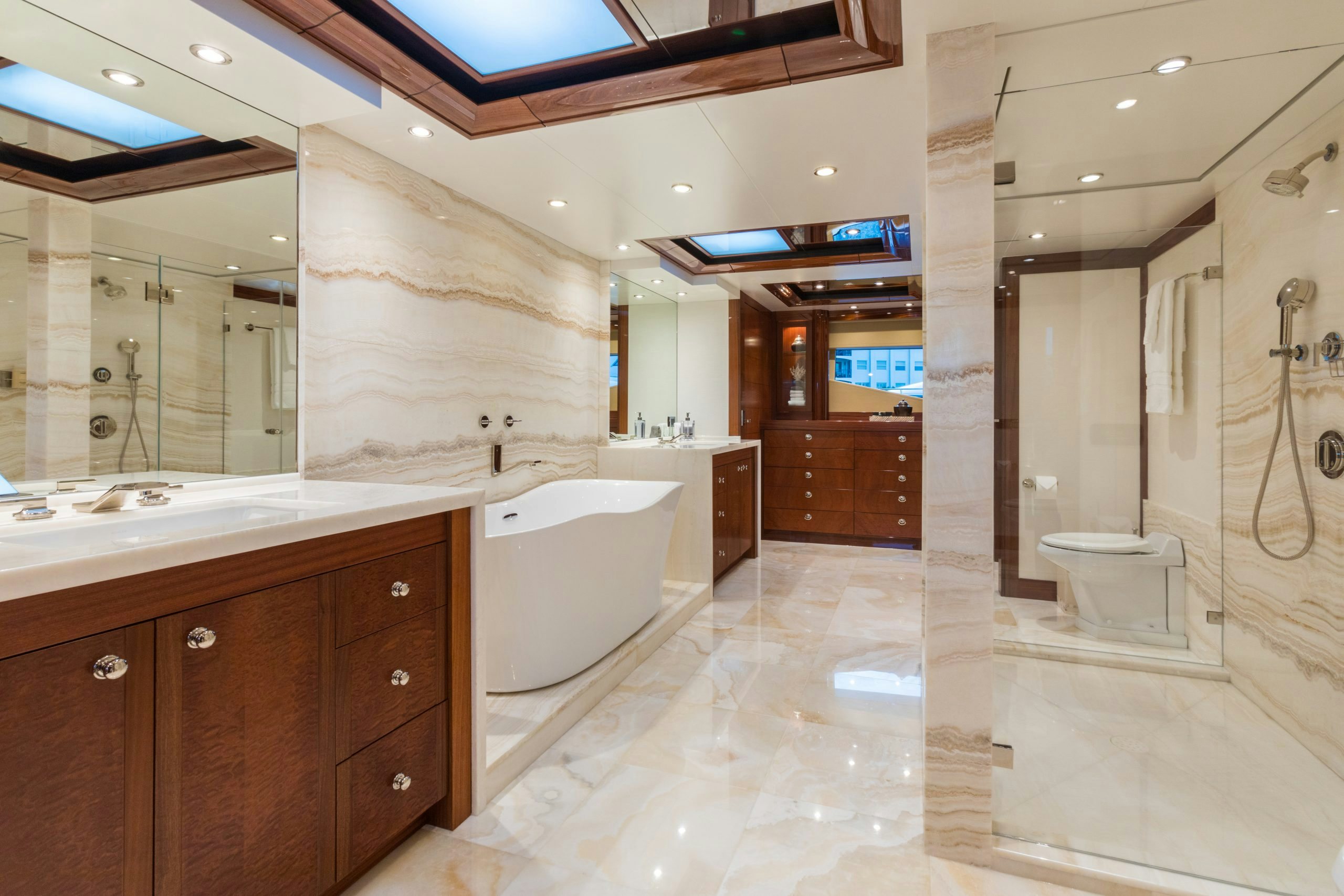 Luxury charter yacht CHASING DAYLIGHT welcomes up to 12 guests in the sumptuous comfort of six staterooms. Each stateroom is beautifully appointed, creating an oasis to rest up for the next day ahead. The superyacht’s king-bed master stateroom is located on the main deck to offer added privacy. On the bridge deck, the motor yacht features a king VIP with a private balcony, which is the ideal place for morning coffee or to read a book. The yacht’s additional staterooms on the lower level include two king-bed staterooms, a convertible twin/queen stateroom and a double-bed stateroom with a Pullman.