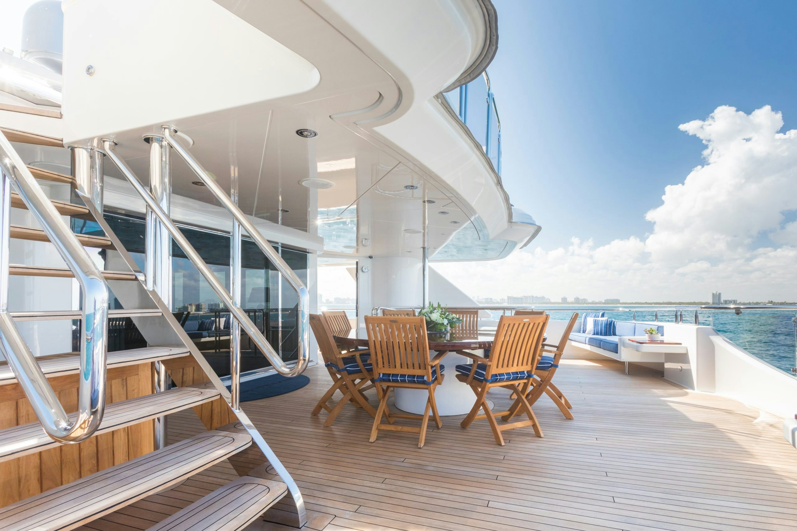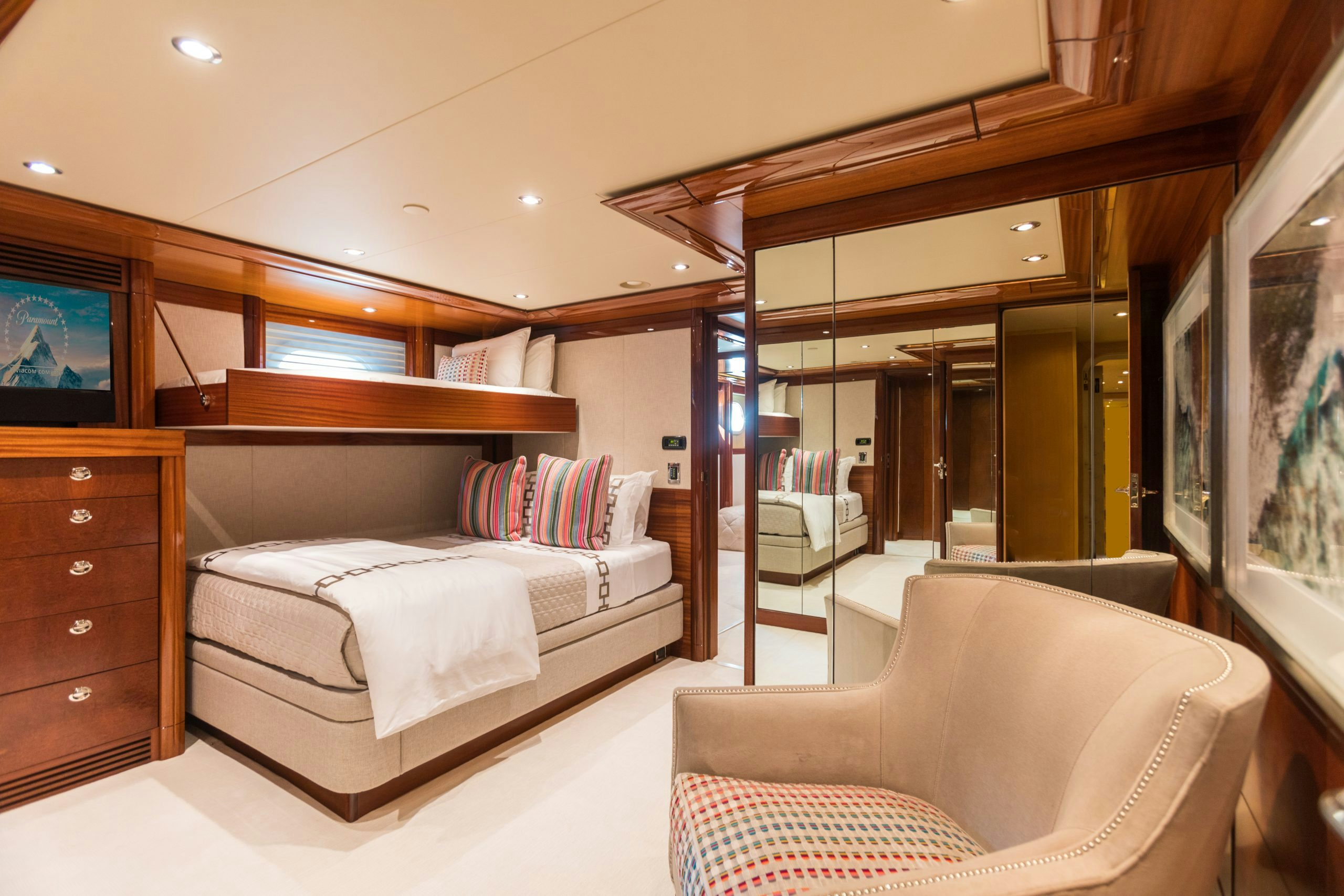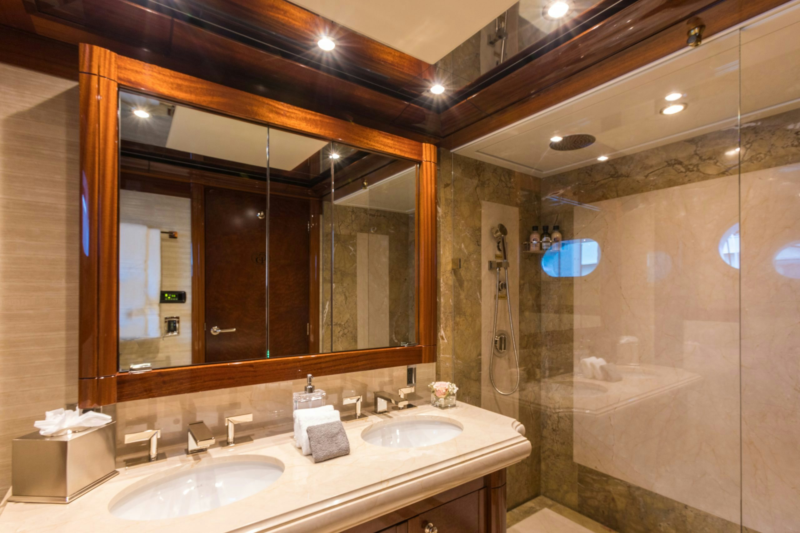 Luxury charter yacht CHASING DAYLIGHT welcomes up to 12 guests in the sumptuous comfort of six staterooms. Each stateroom is beautifully appointed, creating an oasis to rest up for the next day ahead. The superyacht’s king-bed master stateroom is located on the main deck to offer added privacy. On the bridge deck, the motor yacht features a king VIP with a private balcony, which is the ideal place for morning coffee or to read a book. The yacht’s additional staterooms on the lower level include two king-bed staterooms, a convertible twin/queen stateroom and a double-bed stateroom with a Pullman.