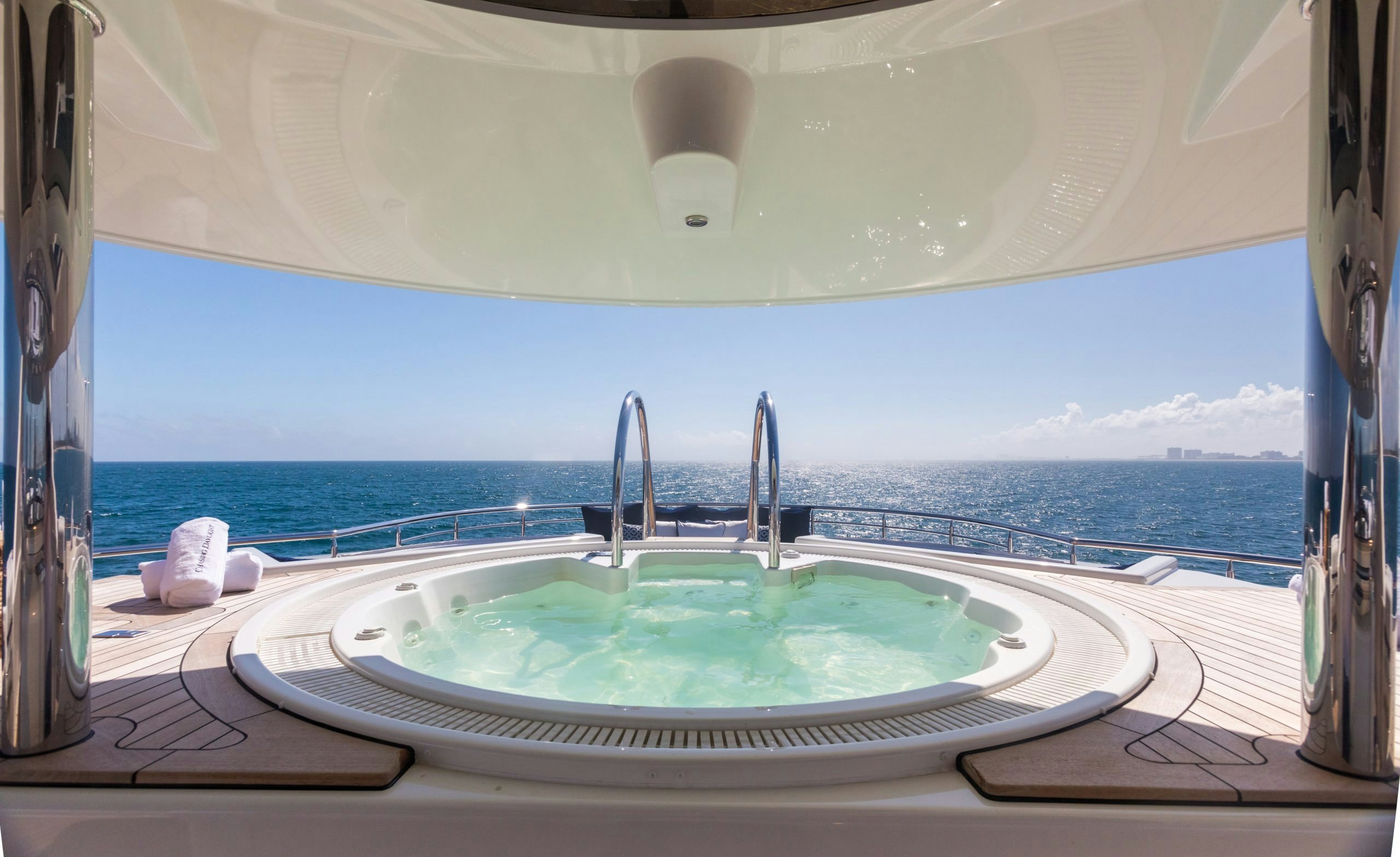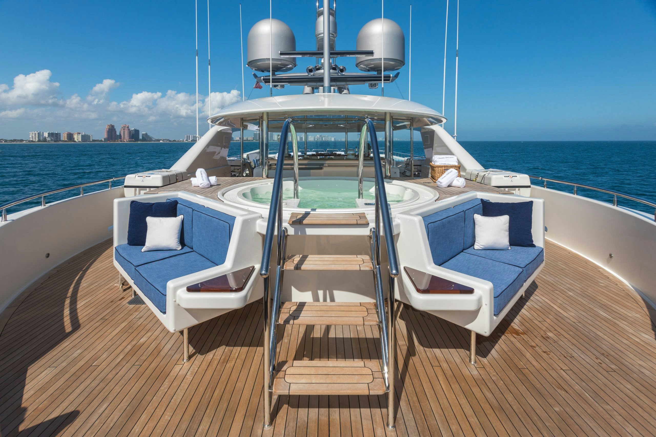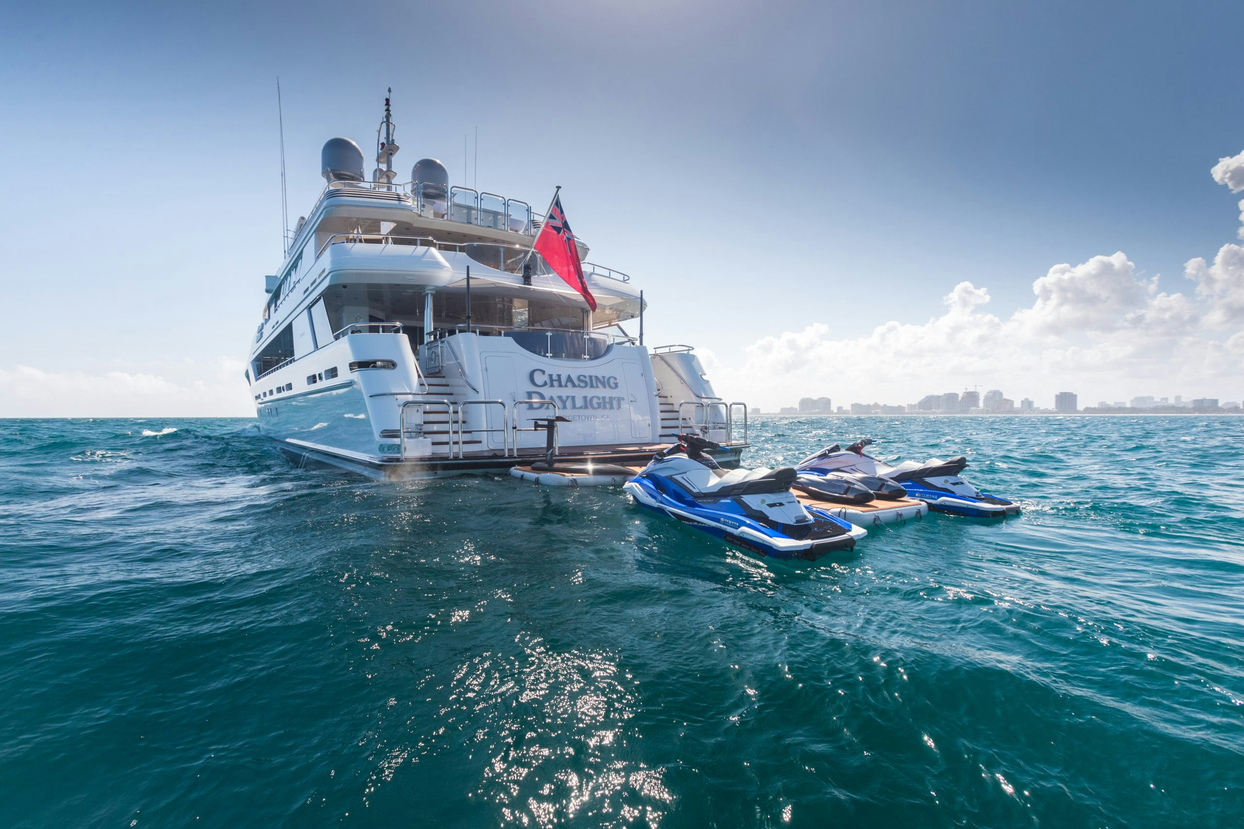CHASING DAYLIGHT’s outdoor living spaces offer something for everyone with options for entertaining and relaxing in the sun or shade. The sundeck is the hub of the yacht providing guests with three hundred and sixty-degree views of the charter destination. Here guests can become sun-kissed on the sunpads, unwind in the Jacuzzi and enjoy a drink while socializing on the lounge area aft. Guests have the option of alfresco dining on the bridge deck aft and main deck aft. The main deck aft also has a charming lounge area perfect for a morning coffee or after-dinner drinks. A few steps down from the main deck aft is a swim platform where guests can jump in the water and enjoy charter yacht CHASING DAYLIGHT’s plethora of water toys.