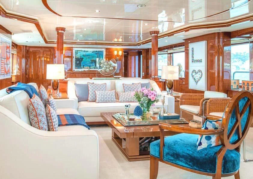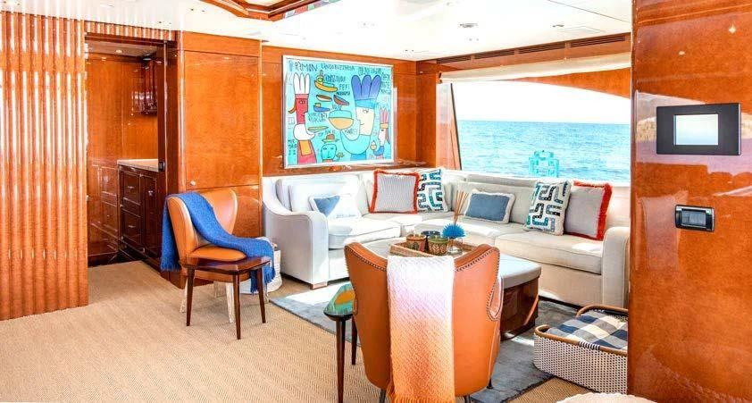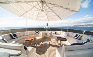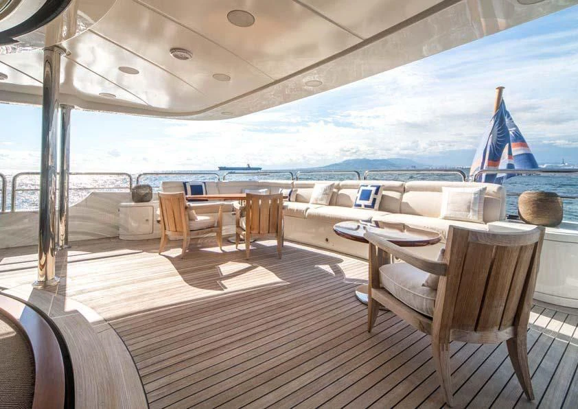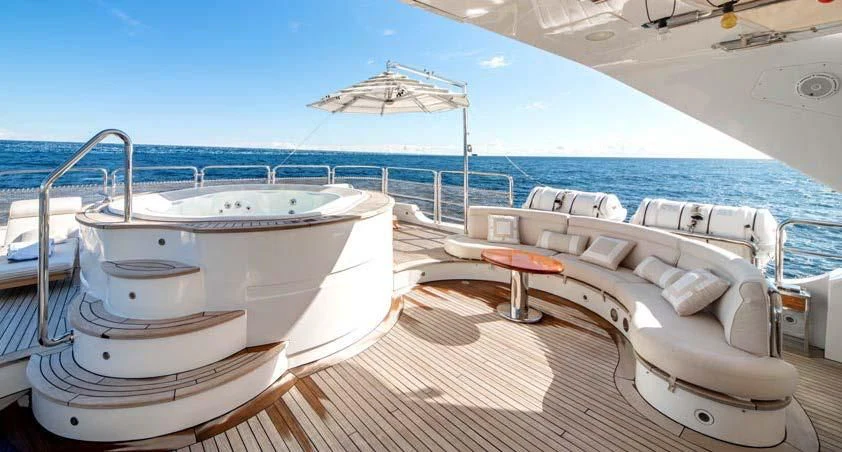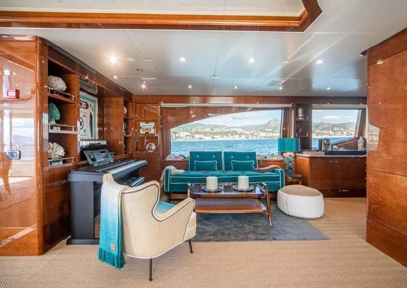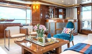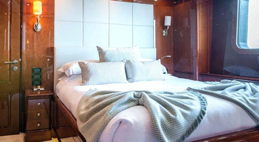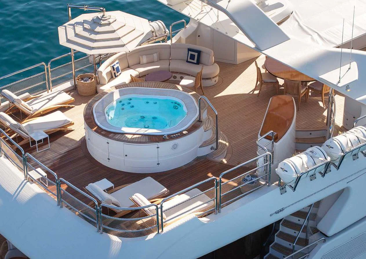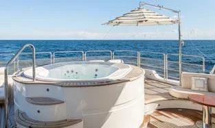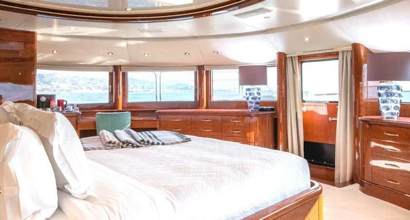 An on-deck master suite with 180-degree panoramic views, Zero Speed stabilizers, VSAT Internet access and a spacious sun deck with a day head are just some of her bespoke assets.