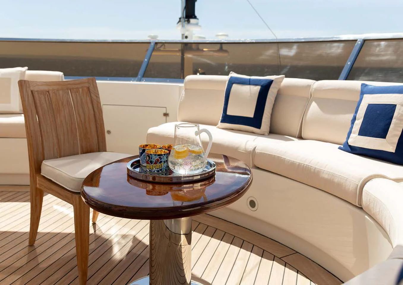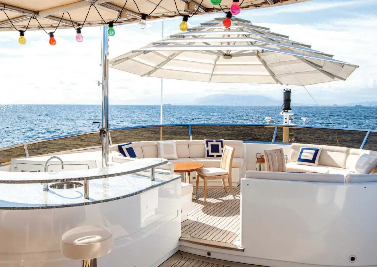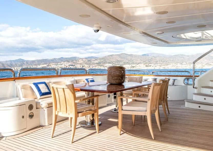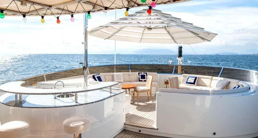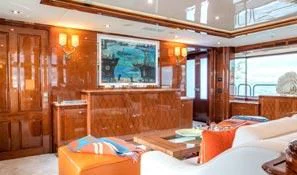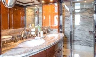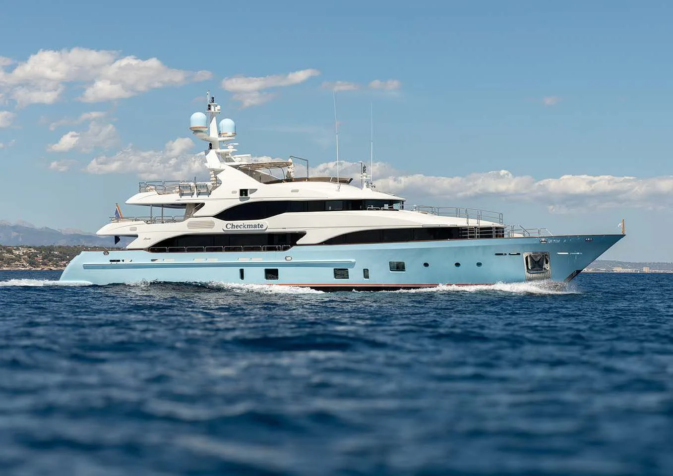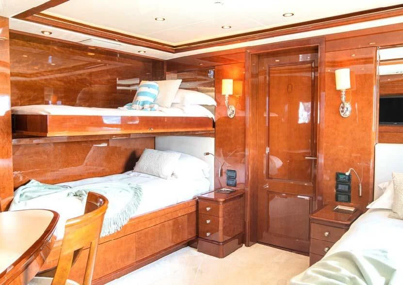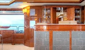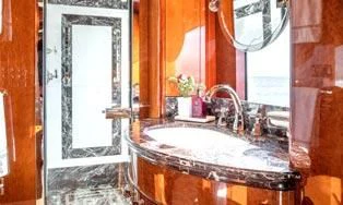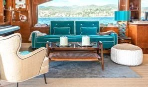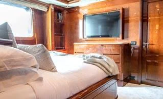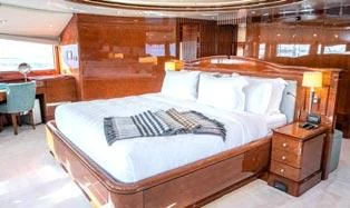Superyacht CHECKMATE can accommodate between 10 and 12 guests in five stunning staterooms. Her interior is a beautiful blend of cherry and Burr Madrona woods and beautiful, Indian marble. There is ample space on the sundeck for lounging, with the added convenience of a day head. Remove the bridge deck’s skylounge aft doors to create an incomprehensible 270-degree alfresco dining space. VSAT ensures a constant Internet connection.