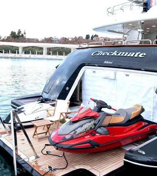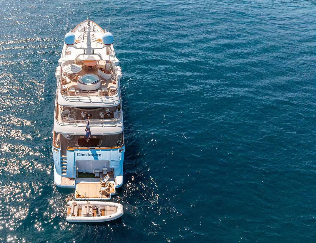 Motor yacht CHECKMATE has 33-foot Ocean Waves tender with twin 300hp Suzuki outboards and an 18-foot Williams jet tender. Her toy chest includes two Sea-Doos, two stand-up paddleboards, two towing tubes, a wake board and fishing gear.