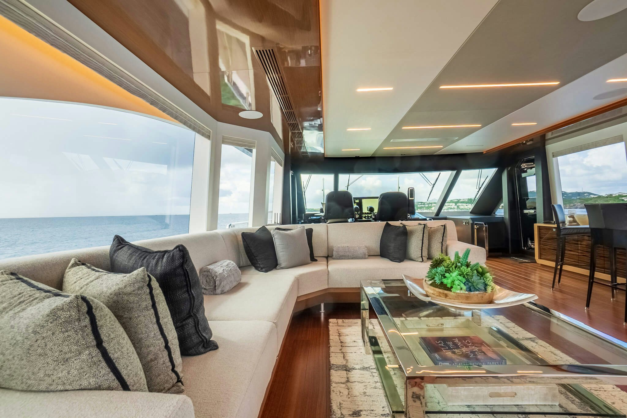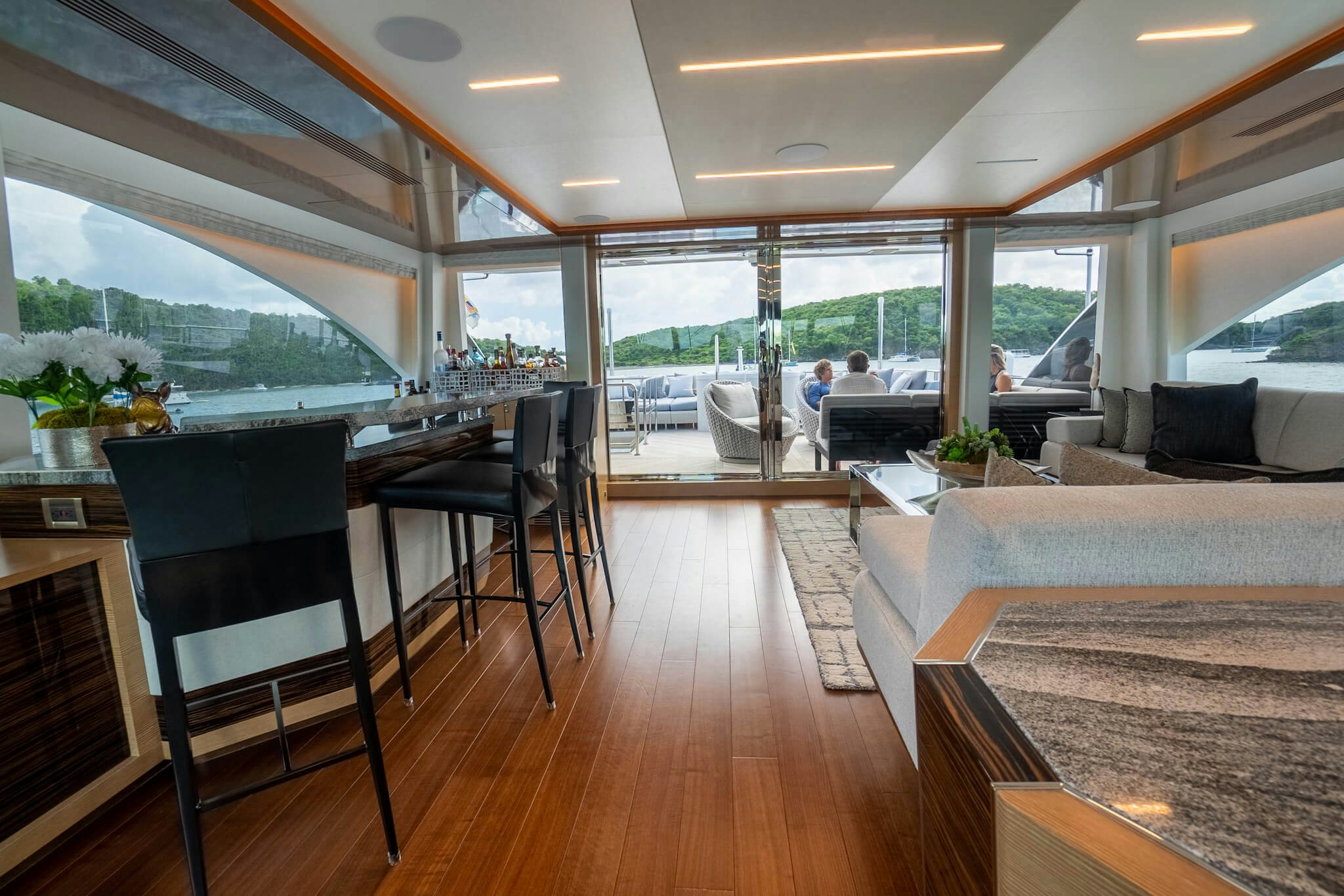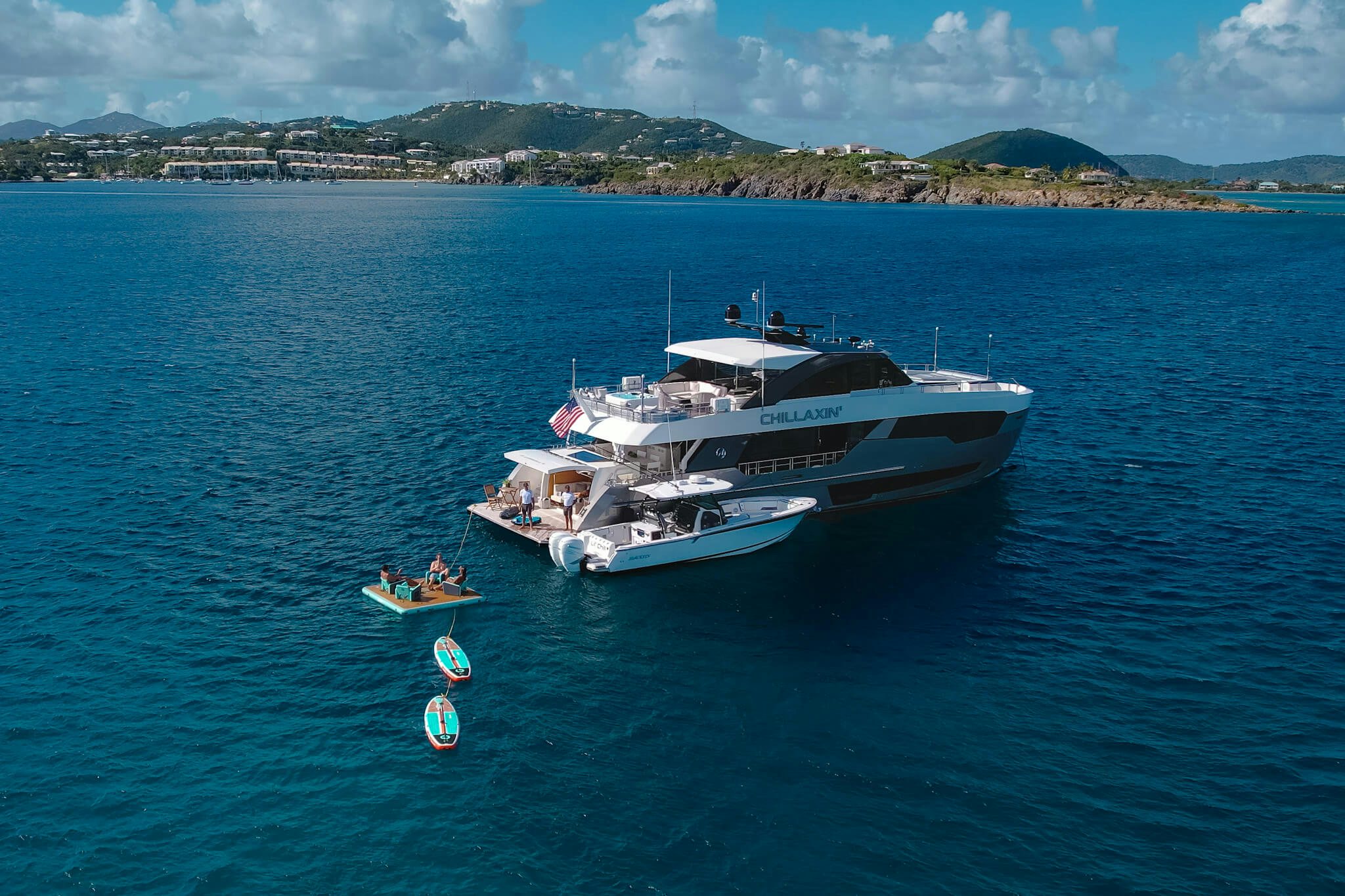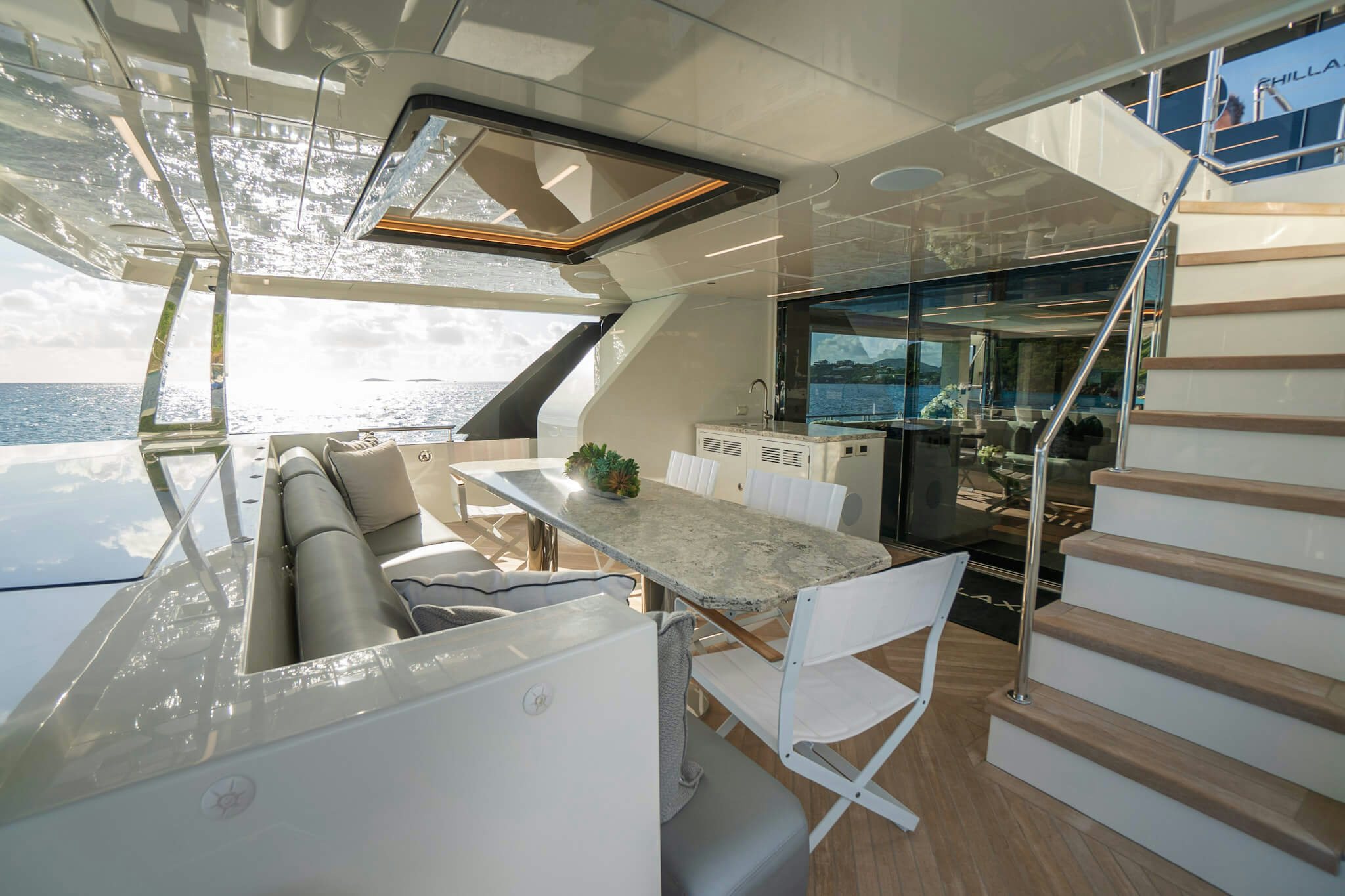 CHILLAXIN’s main deck aft is, as her model name suggests, revolutionary. This area is a testament to her entertainment capabilities, with an alfresco dining area for eight and a set of stairs that lead guests to her impressive beach club. When the garage door is opened, a tranquil lounge area is revealed with a sitting area, a bar and plenty of shade so guests can relax in utmost comfort while watching the action in the water take place. The extended swim platform is the ideal spot for a morning yoga session at the water’s edge. When you’re itching to try your hand at the water toys, the hydraulic platform extends into the water allowing seamless access. The built-in freshwater shower just off the enclosed beach club is a refreshing rinse to wash away the salty water.