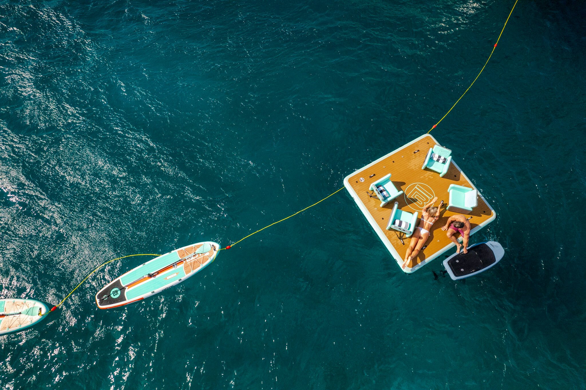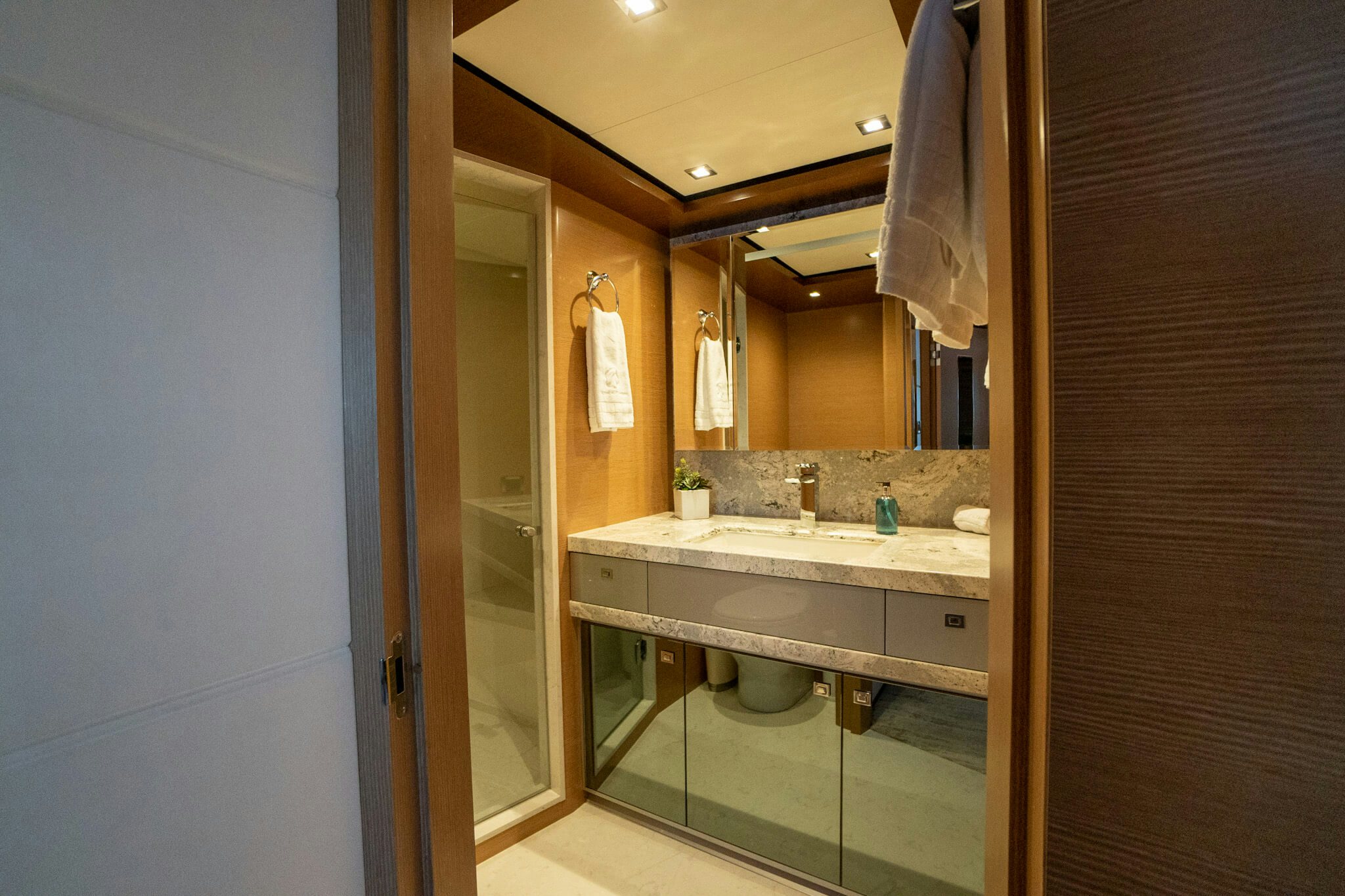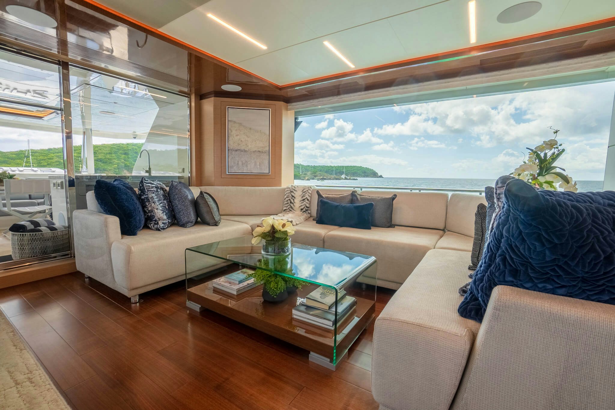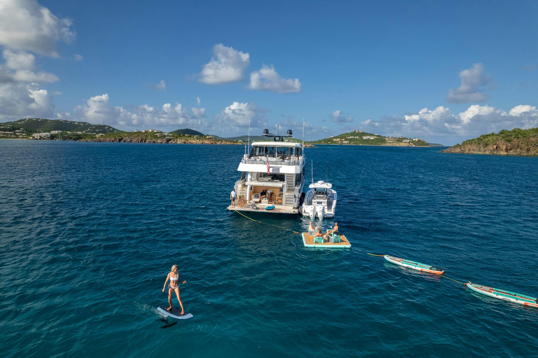 CHILLAXIN’s main deck aft is, as her model name suggests, revolutionary. This area is a testament to her entertainment capabilities, with an alfresco dining area for eight and a set of stairs that lead guests to her impressive beach club. When the garage door is opened, a tranquil lounge area is revealed with a sitting area, a bar and plenty of shade so guests can relax in utmost comfort while watching the action in the water take place. The extended swim platform is the ideal spot for a morning yoga session at the water’s edge. When you’re itching to try your hand at the water toys, the hydraulic platform extends into the water allowing seamless access. The built-in freshwater shower just off the enclosed beach club is a refreshing rinse to wash away the salty water.