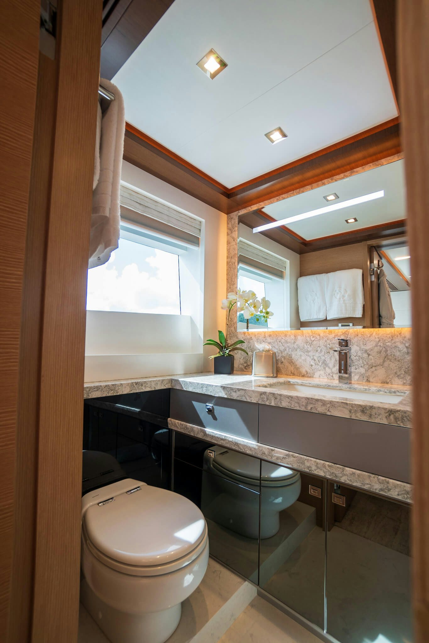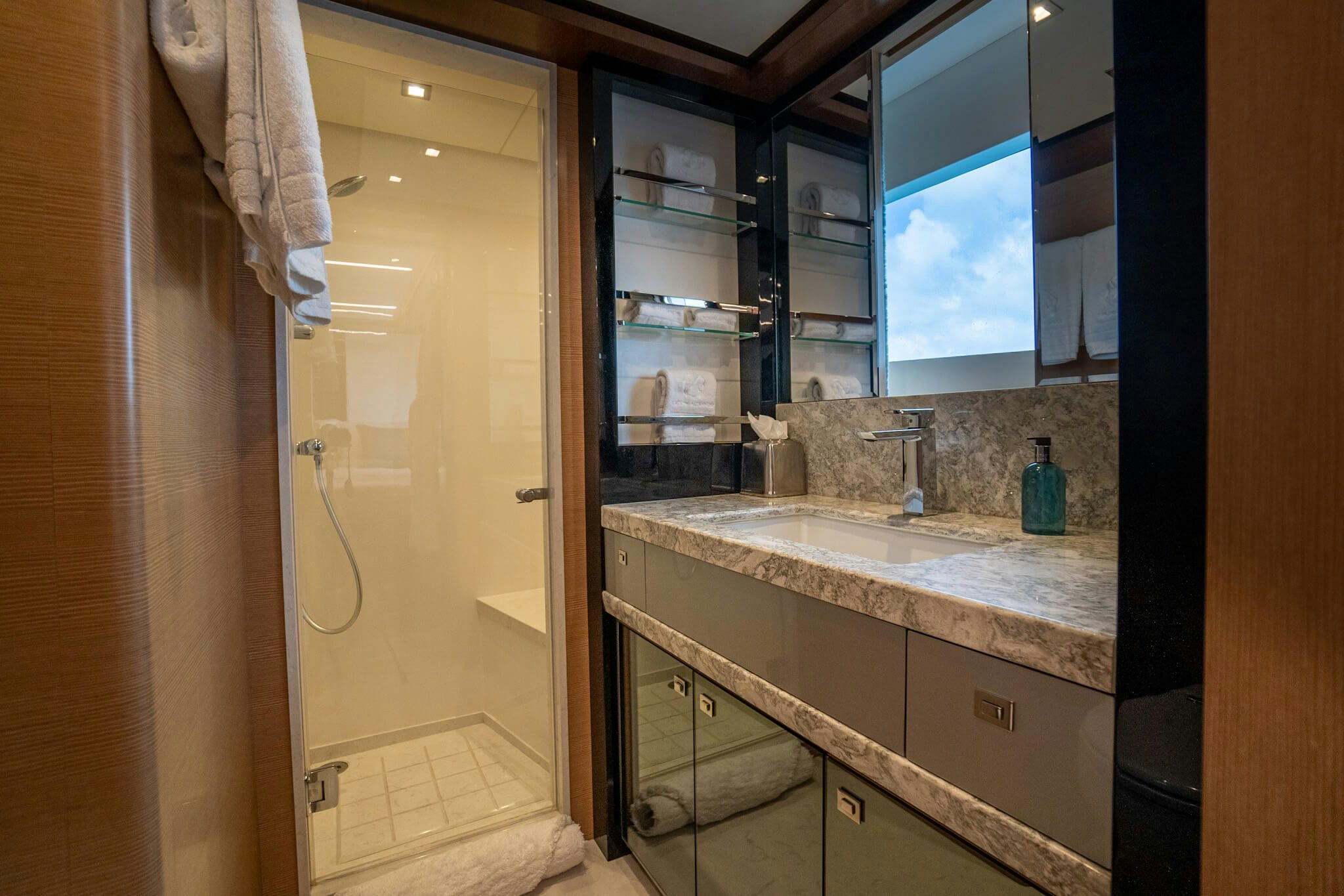 As guests enter the main salon via the whisper-quiet automated door, they will notice the generous space and natural light. A sizeable U-shaped couch is the focal piece of the room, welcoming guests to gather and socialize. A fold-down TV comes from the ceiling above the hidden bar/sink to starboard. The formal dining table hosts up to eight guests with excellent visibility of the blue waters courtesy of the expansive floor-to-ceiling windows. A sliding pocket door is situated forward of the dining table, to port and, when opened, creates an open galley with a small sitting nook, great for a casual breakfast or morning coffee. When closed, the galley is completely private for the yacht’s Chef to work their magic. CHILLAXIN’s interior combines light oak wood with high-gloss ebony and walnut molding, creating a warm and welcoming atmosphere.