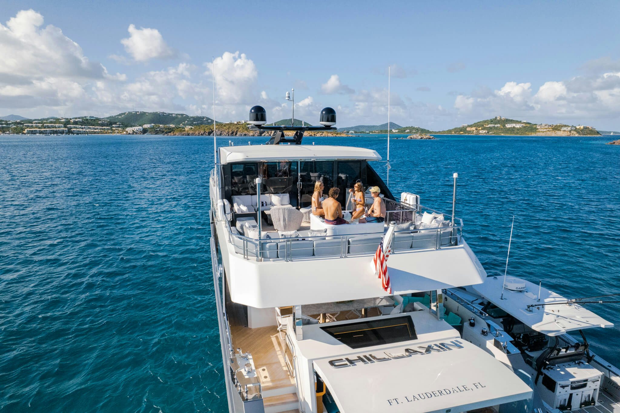 The skylounge aft encourages entertaining and endless evenings of fun. An L-shaped seating area is just outside the sliding glass doors and a full wet bar is to starboard. Further aft is a luxurious four-person spa Jacuzzi flanked by sunpads that entices guests to soak and unwind. A manual awning provides plenty of shade to the area and a disco ball adds an element of excitement to liven up the nights spent onboard. CHILLAXIN’s vertical bow expands the alfresco living possibilities with a plethora of seating areas between the large settee and table, along with an oversized sunpad forward with adjustable and reversible chaise positions. Yet another unique characteristic of the charter yacht is the projector and screen for guests to have movie nights under the stars. CHILLAXIN is true to her name, perfectly harmonizing relaxation and comfort in all areas, inside and out.
