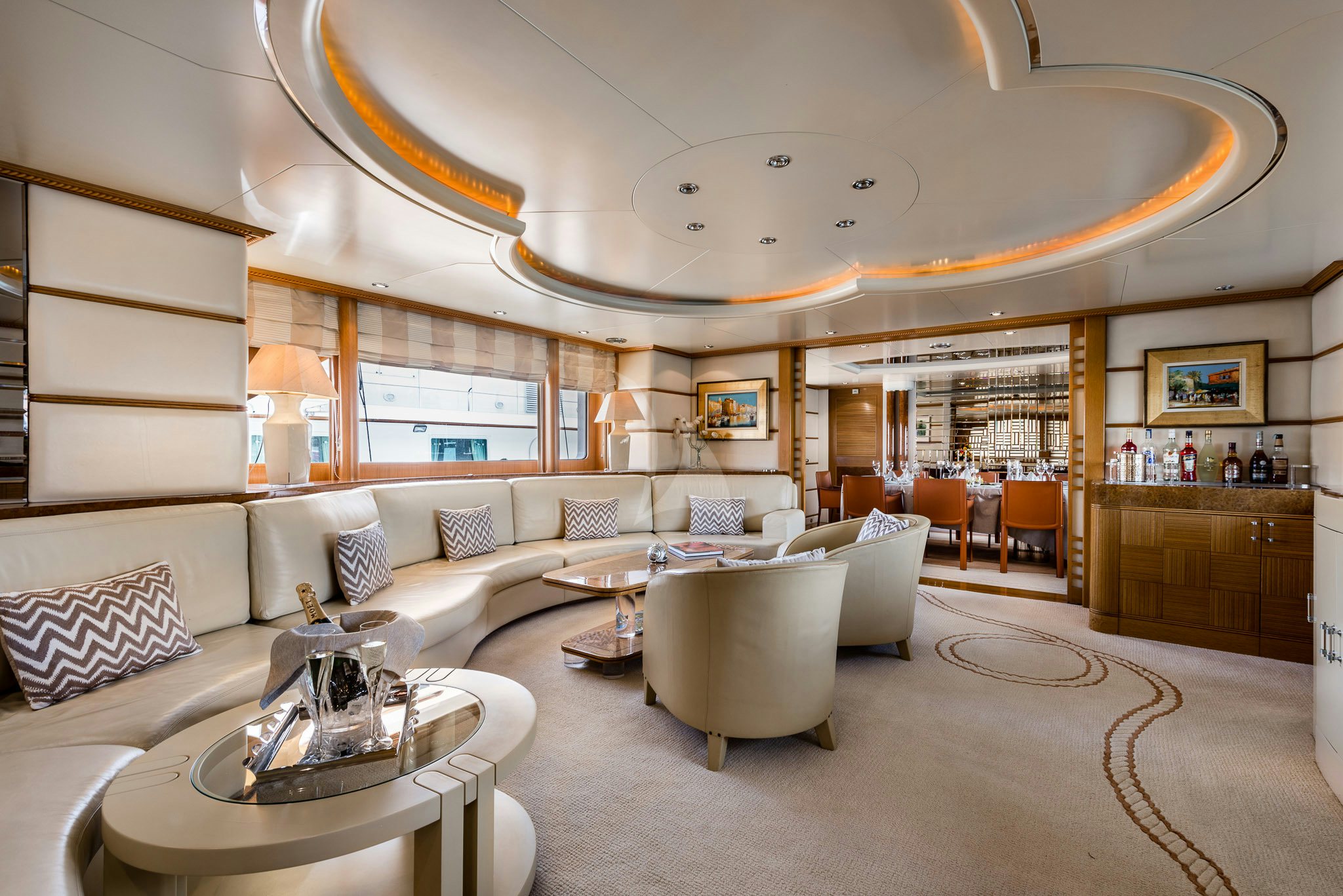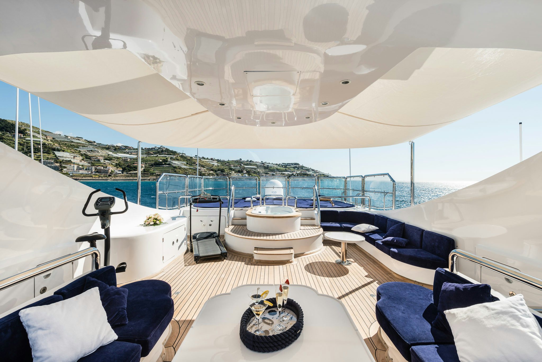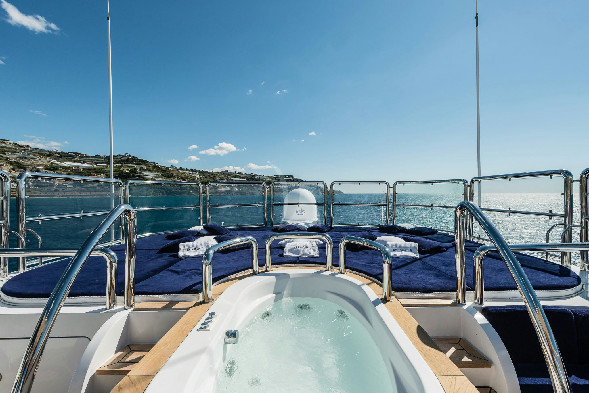 With exterior design by renowned designer Stefano Natucci combined with naval architecture by Benetti, DESAMIS B cuts a striking line as she glides through the waves. Her generous external deck space includes a shaded aft deck, above which the sky lounge and upper aft deck—complete with an alfresco dining table—are ideal spaces for hosting impressive evenings. The top deck boasts a jacuzzi and generous sunbeds for spending hot days at sea, as well as a cocktail bar. Stabilizers at anchor counteract roll to ensure that relaxing on balmy evenings beneath the stars on the sumptuous top deck sofas deliver the utmost in comfort.