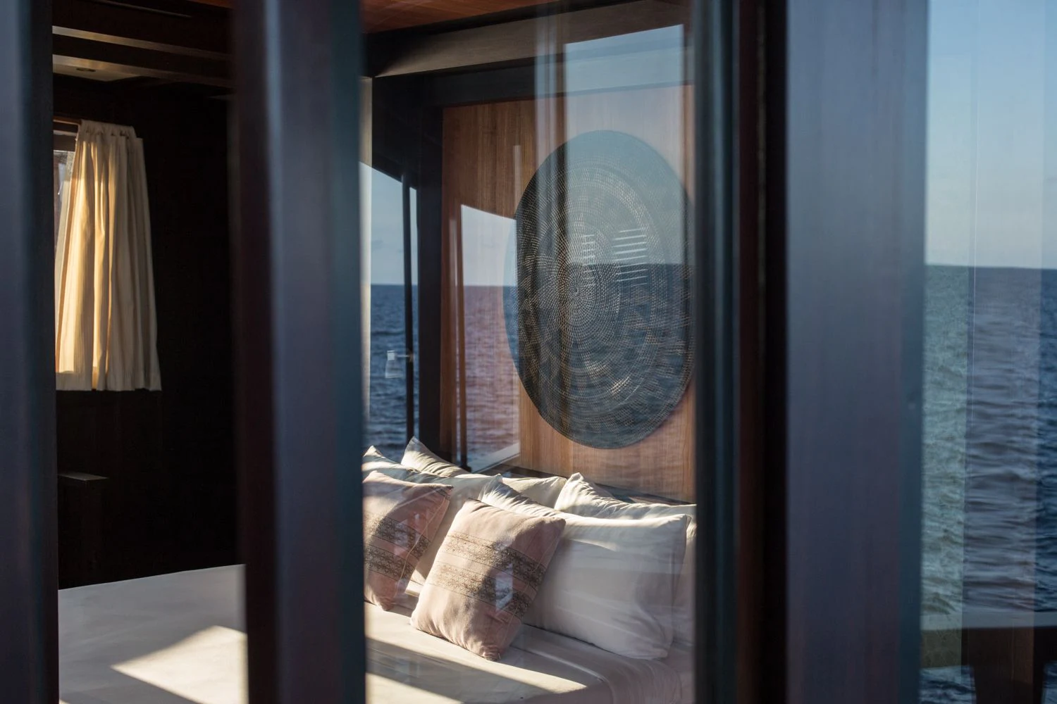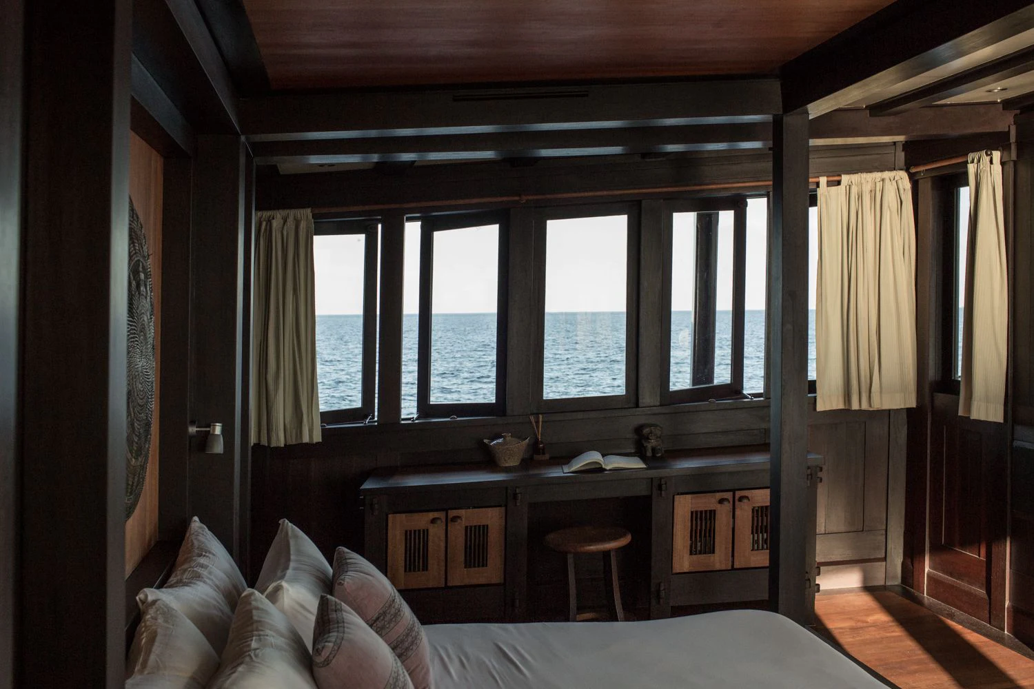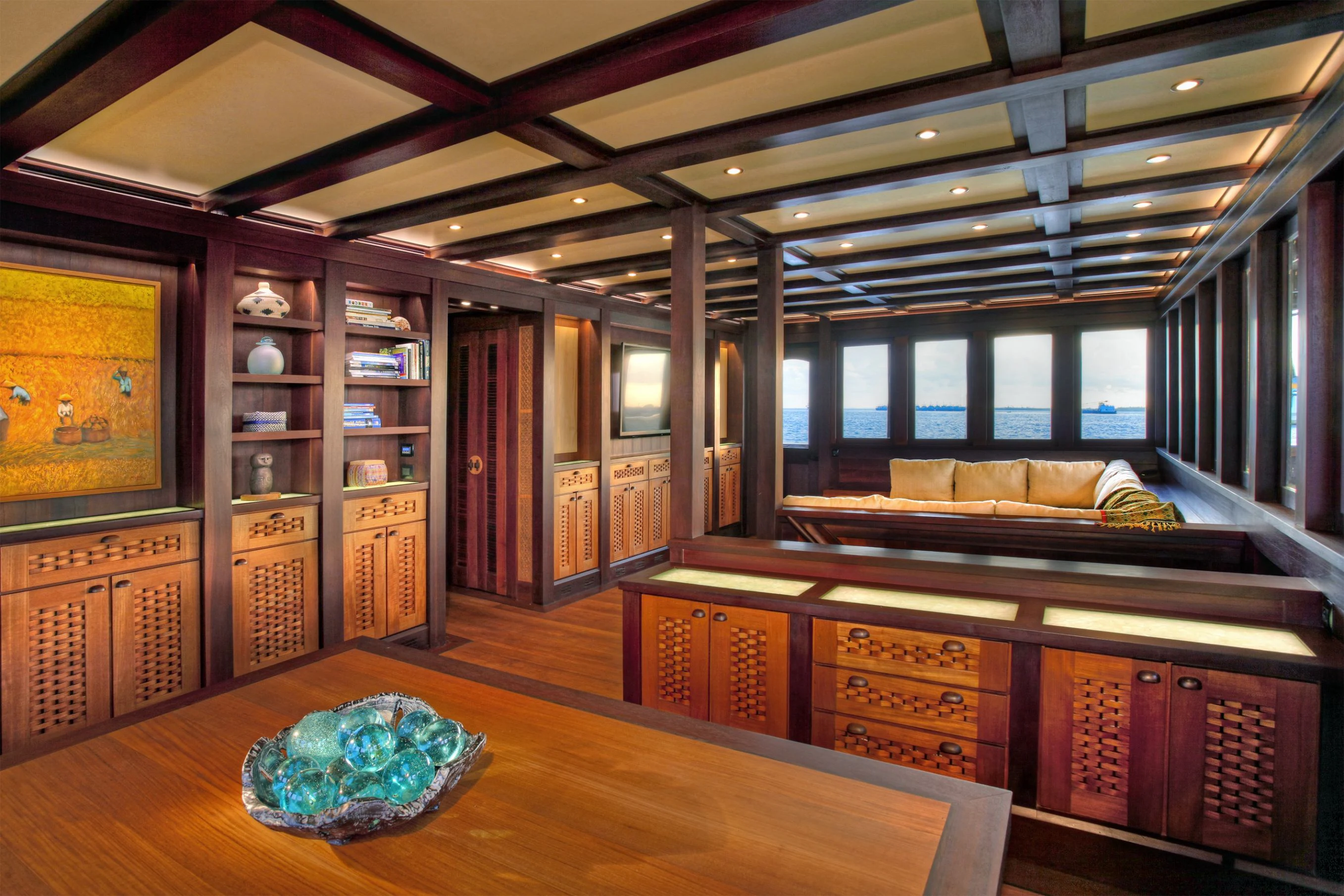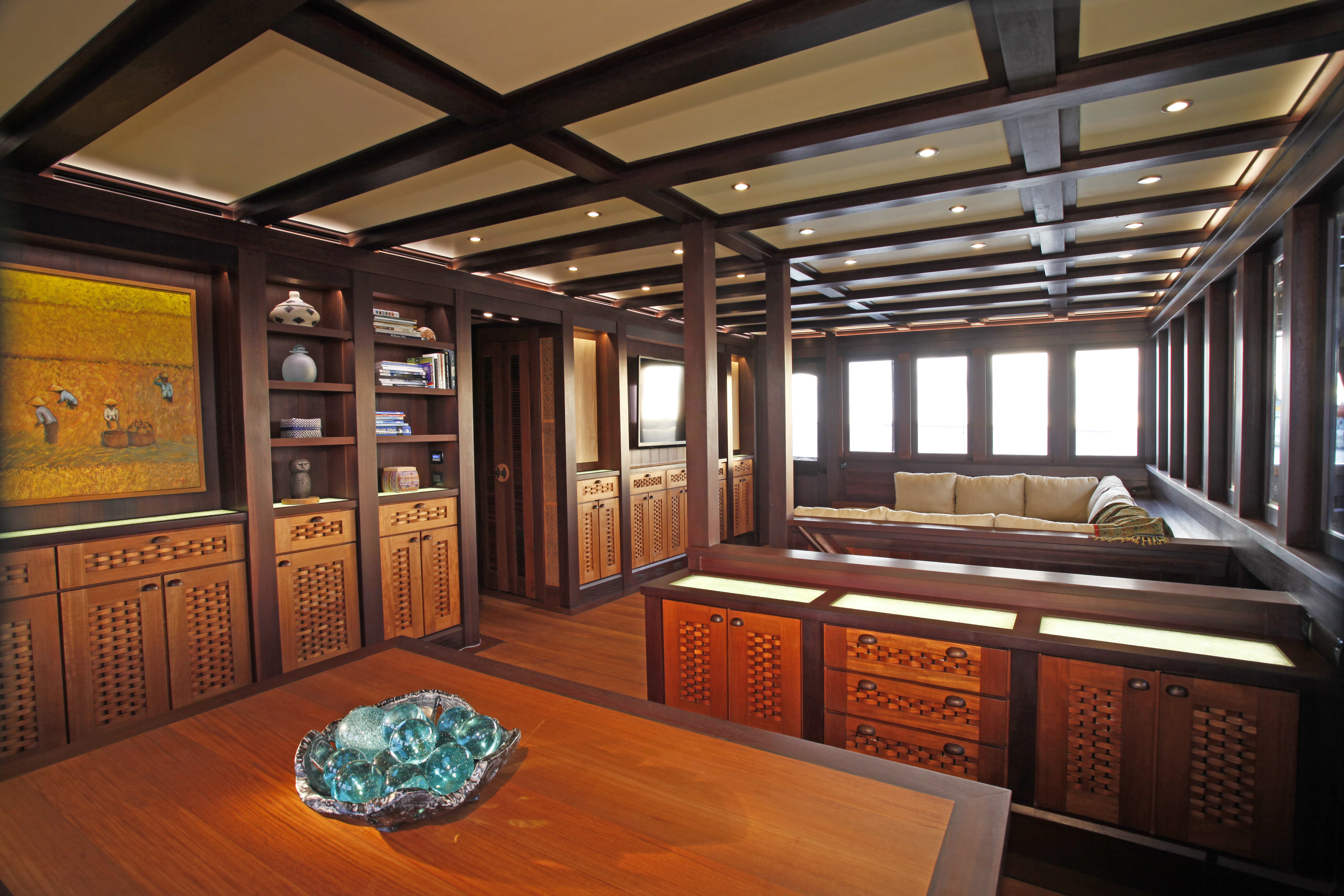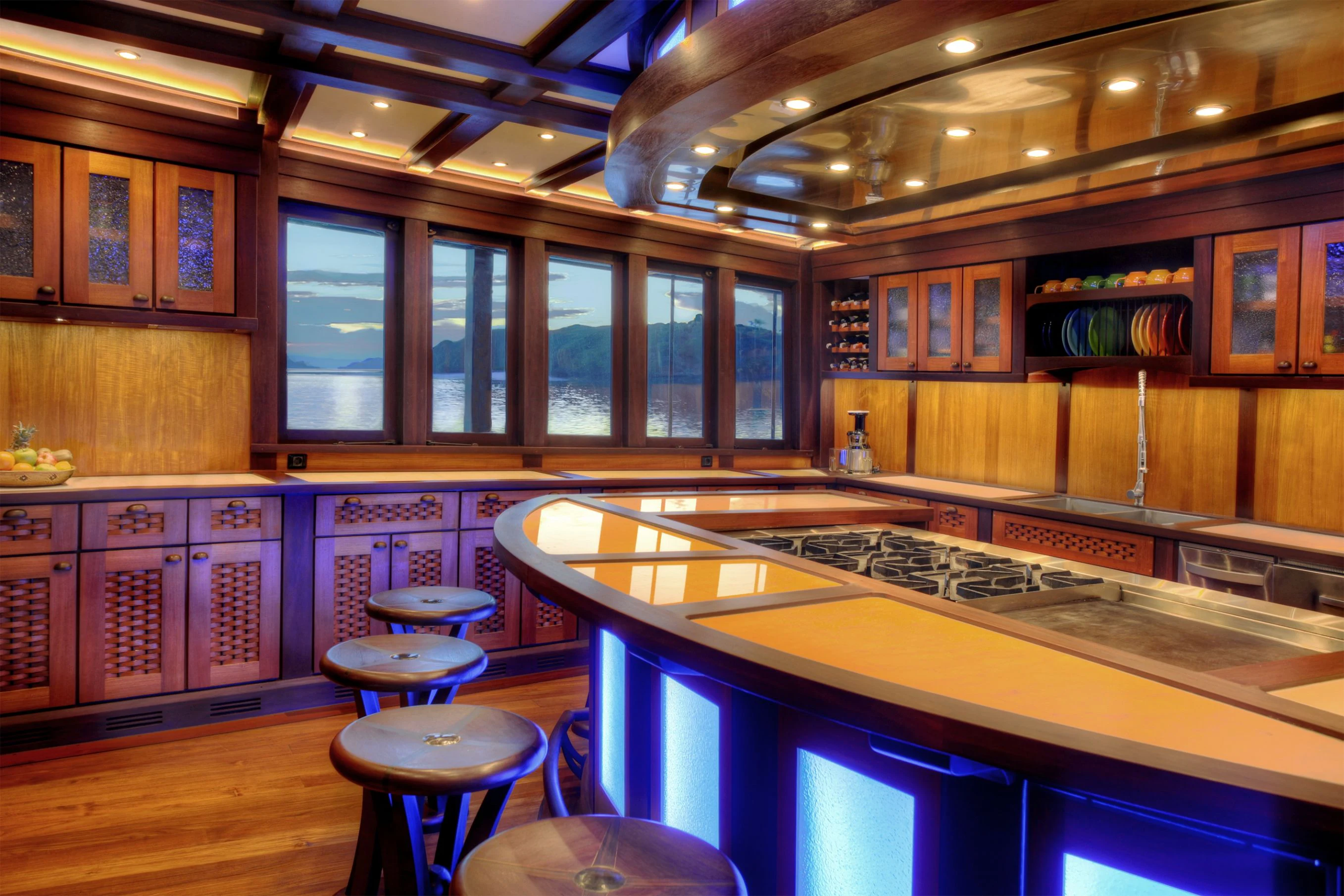 The lounge has a dining table for eight on port and a salon with comfortable sofas on starboard side. Underwater LED lights create amazing visual effects and attract all sorts of sea life.