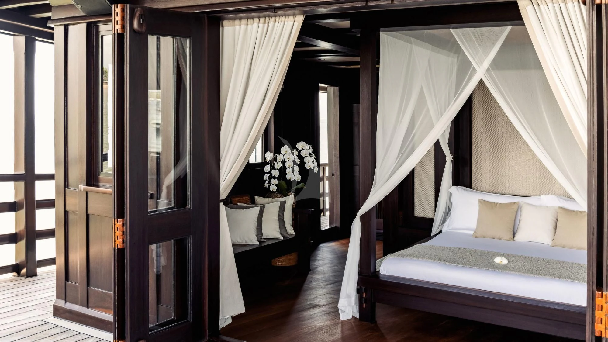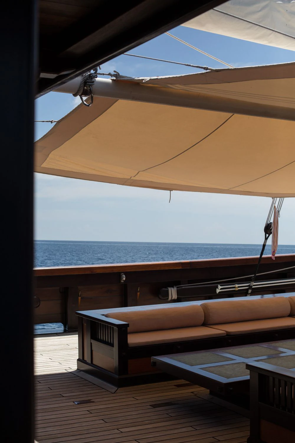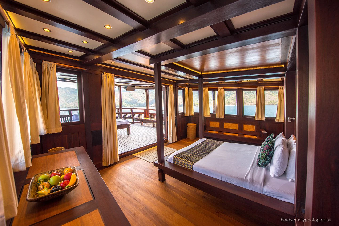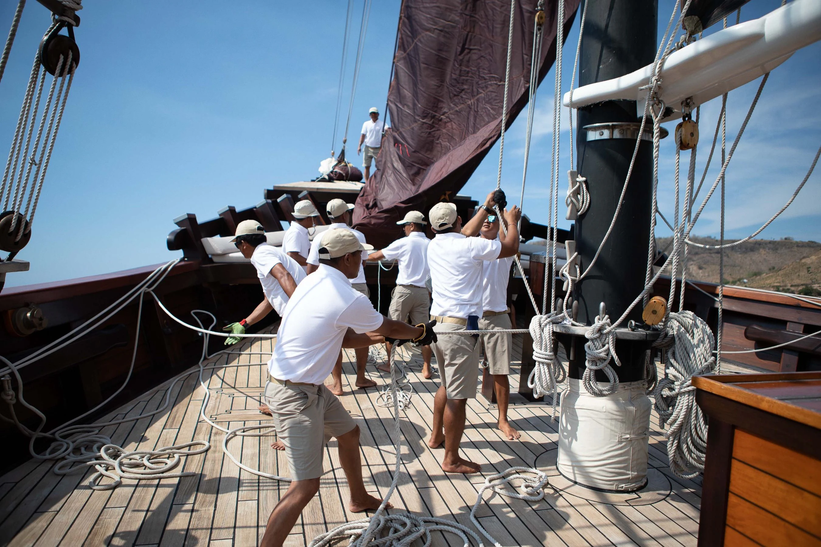 DUNIA BARU yacht is a beautiful sight under full sail — she evokes feelings of an era gone by. The Master Cabin with king-sized bed has a private bridge deck with double sun or daybed and sofa and windows all around, affording panoramic views. Six Guest Cabins have double beds and are roomy, airy and light with beautiful woodwork and custom mood lighting.