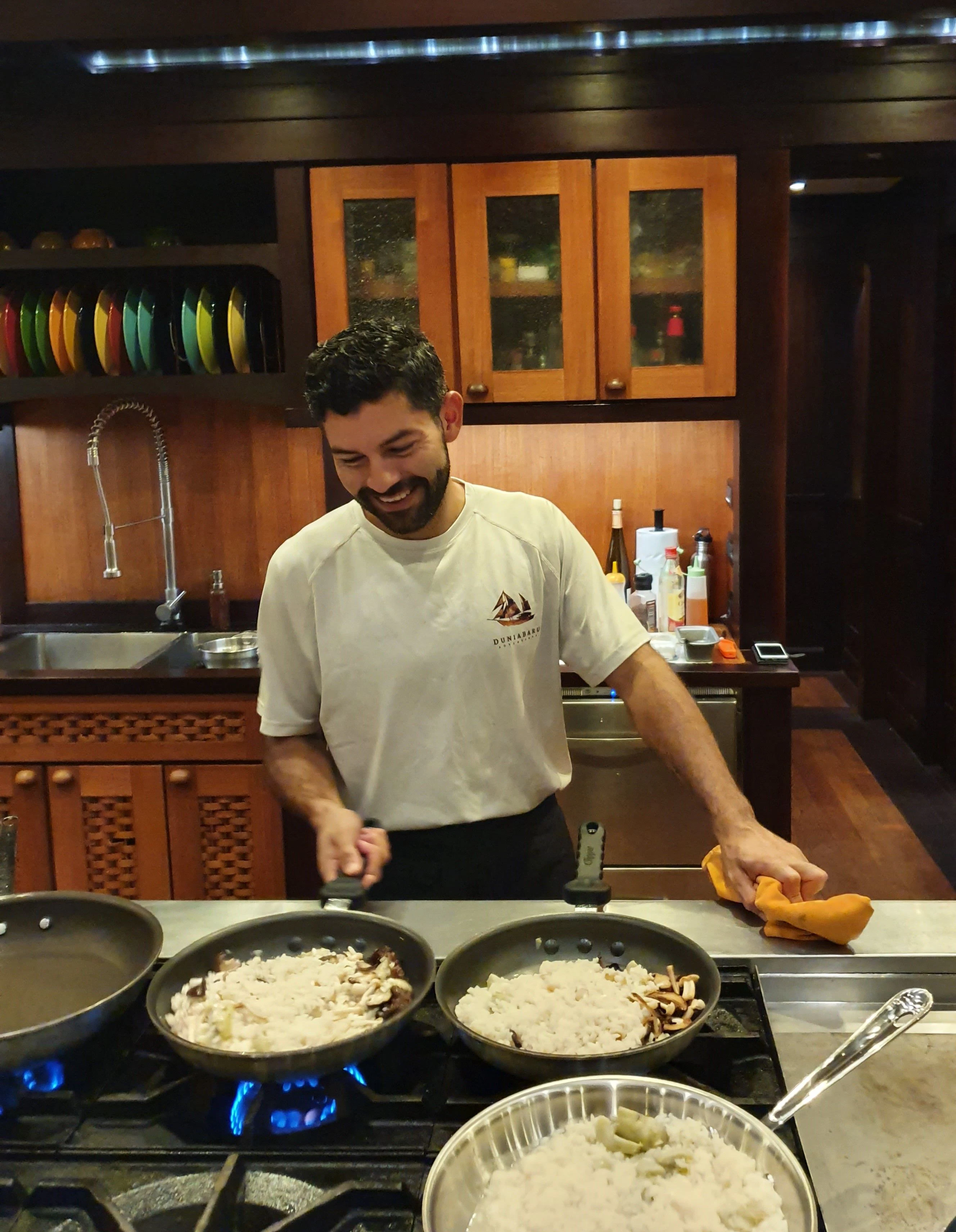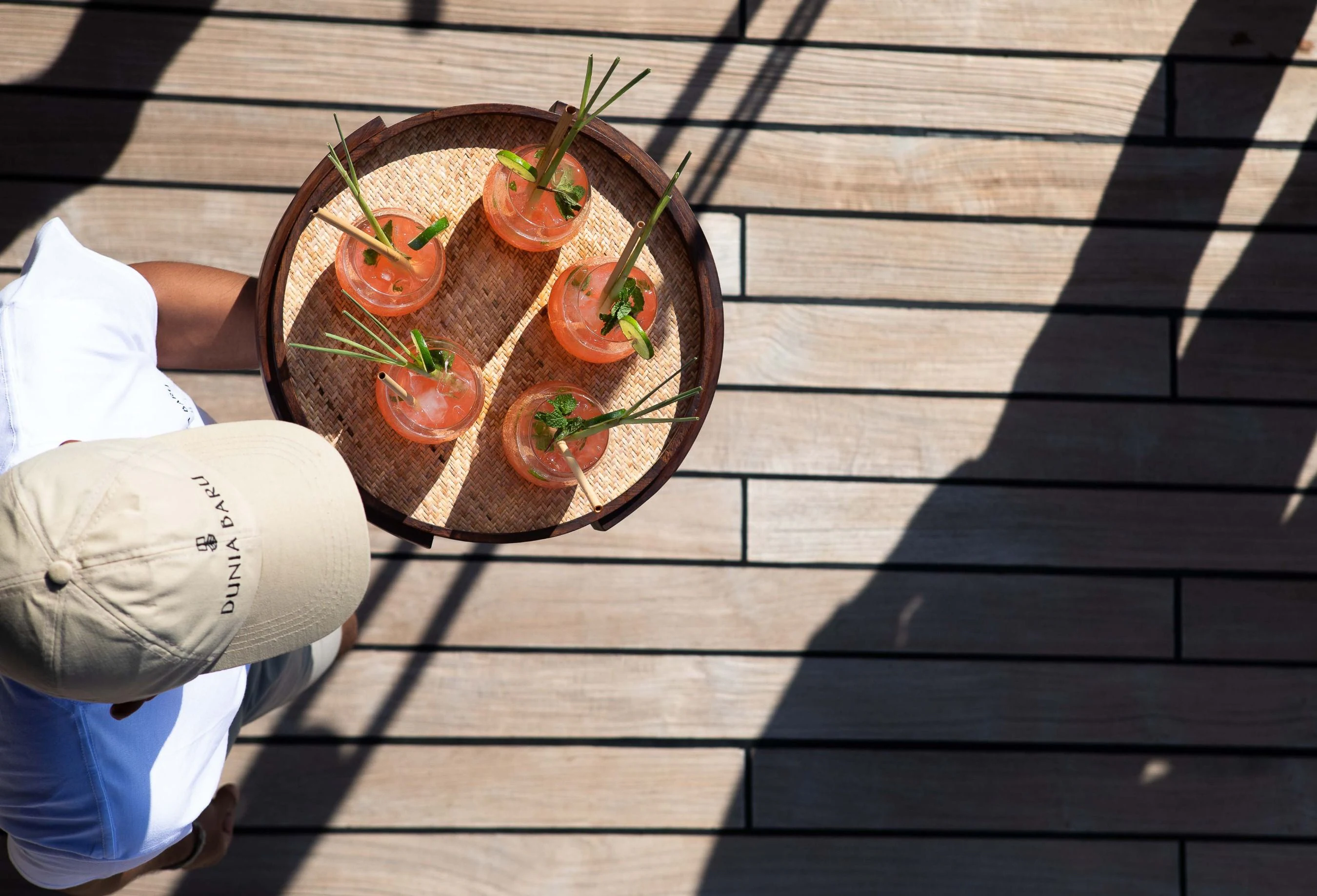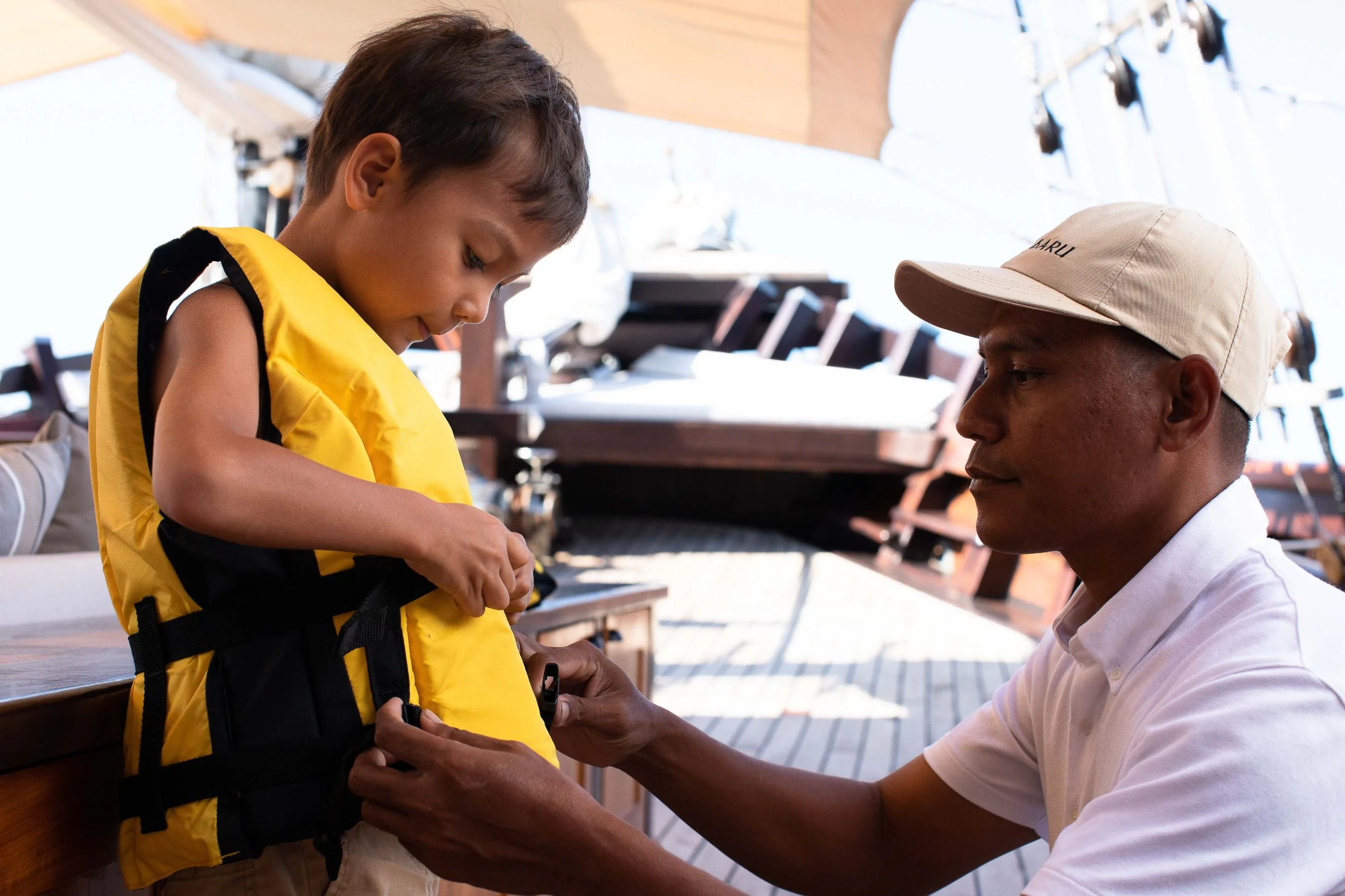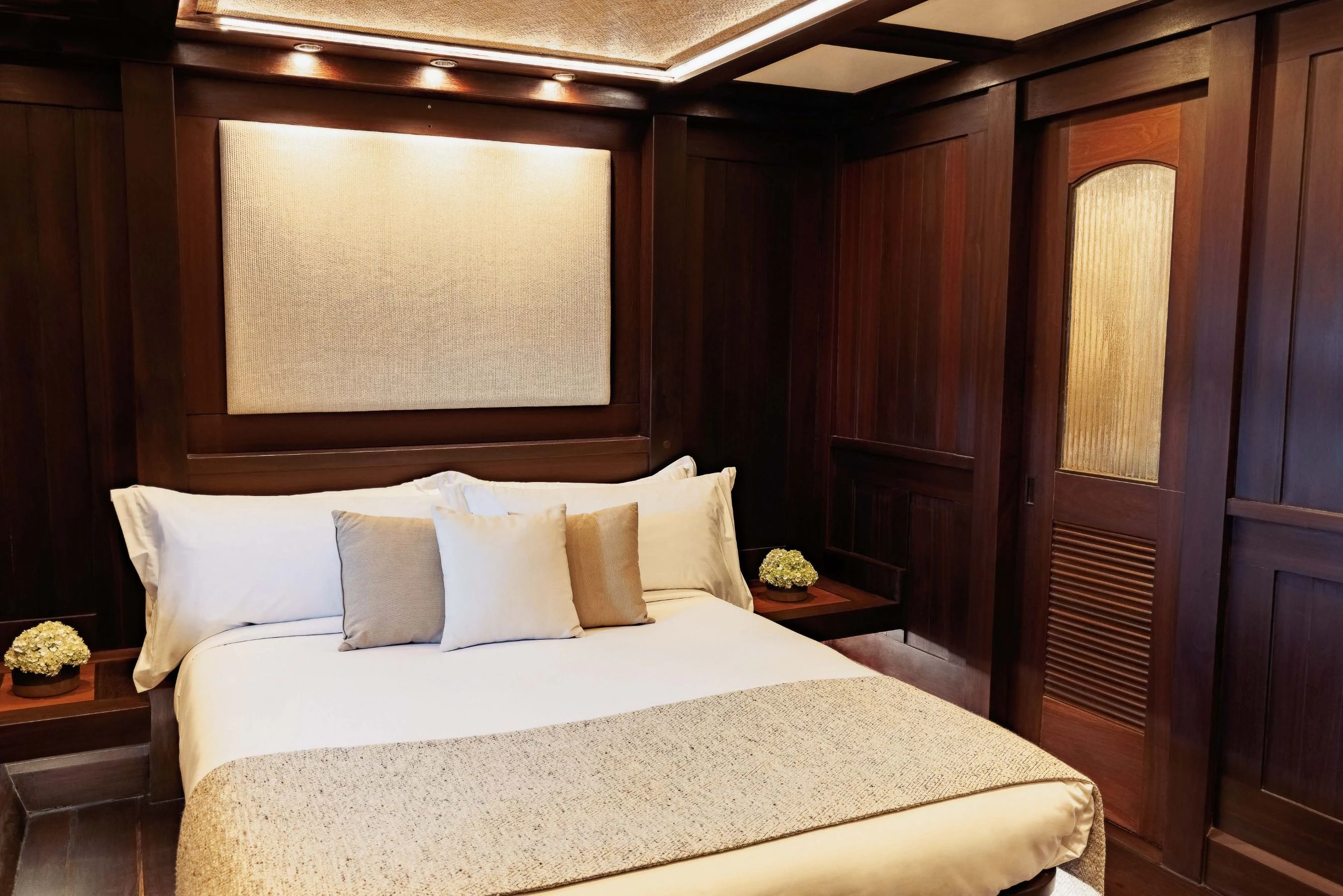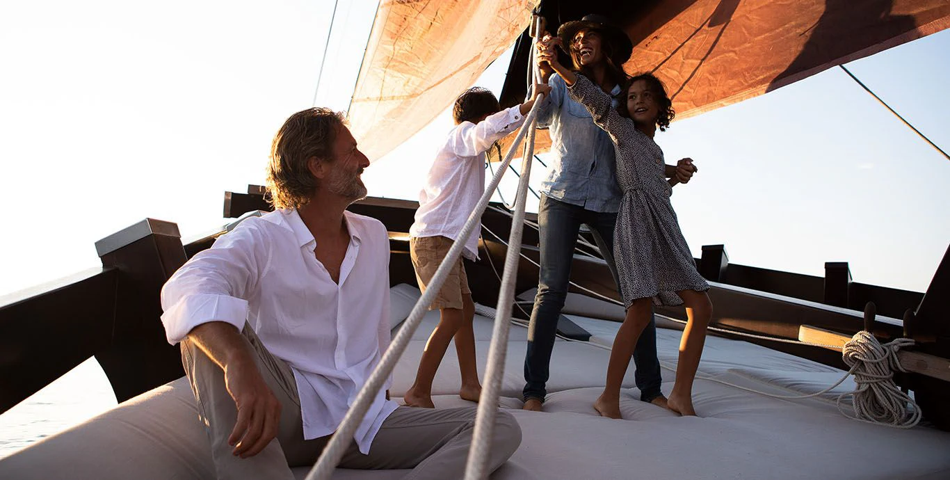 DUNIA BARU yacht is a beautiful sight under full sail — she evokes feelings of an era gone by. The Master Cabin with king-sized bed has a private bridge deck with double sun or daybed and sofa and windows all around, affording panoramic views. Six Guest Cabins have double beds and are roomy, airy and light with beautiful woodwork and custom mood lighting.