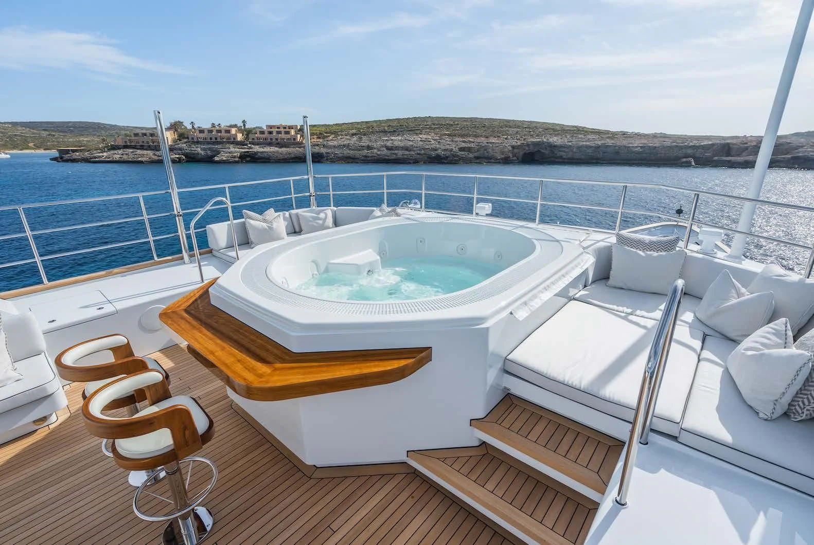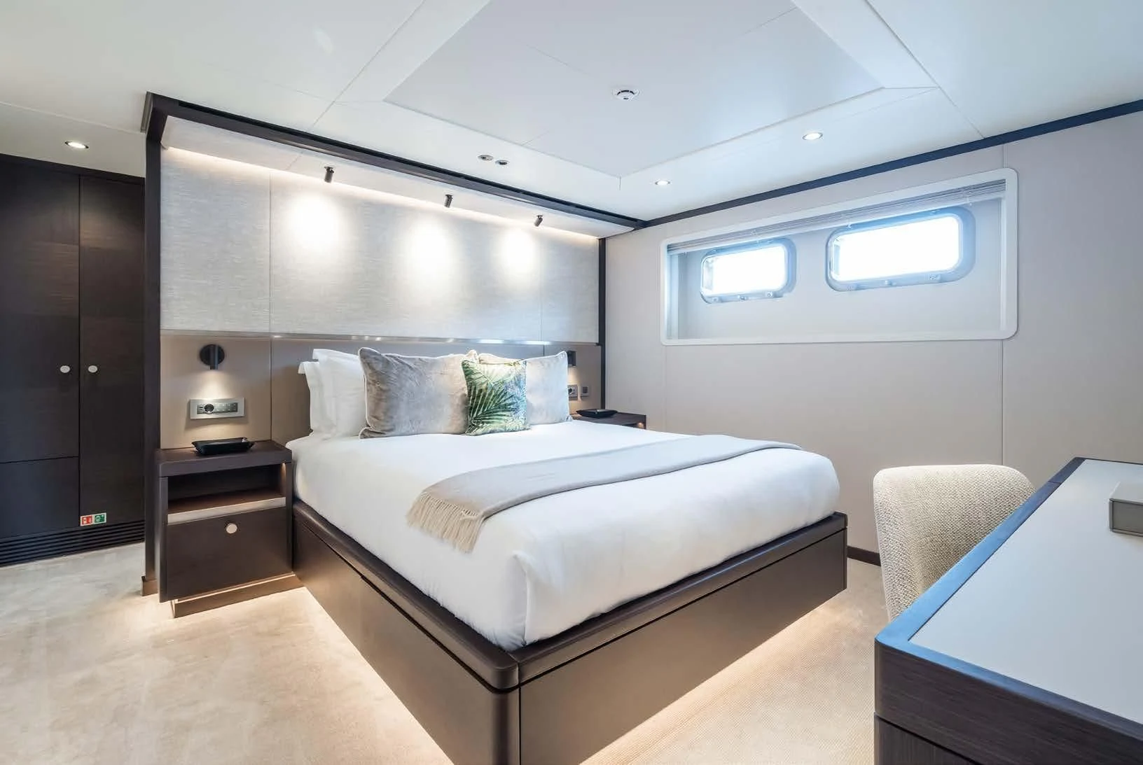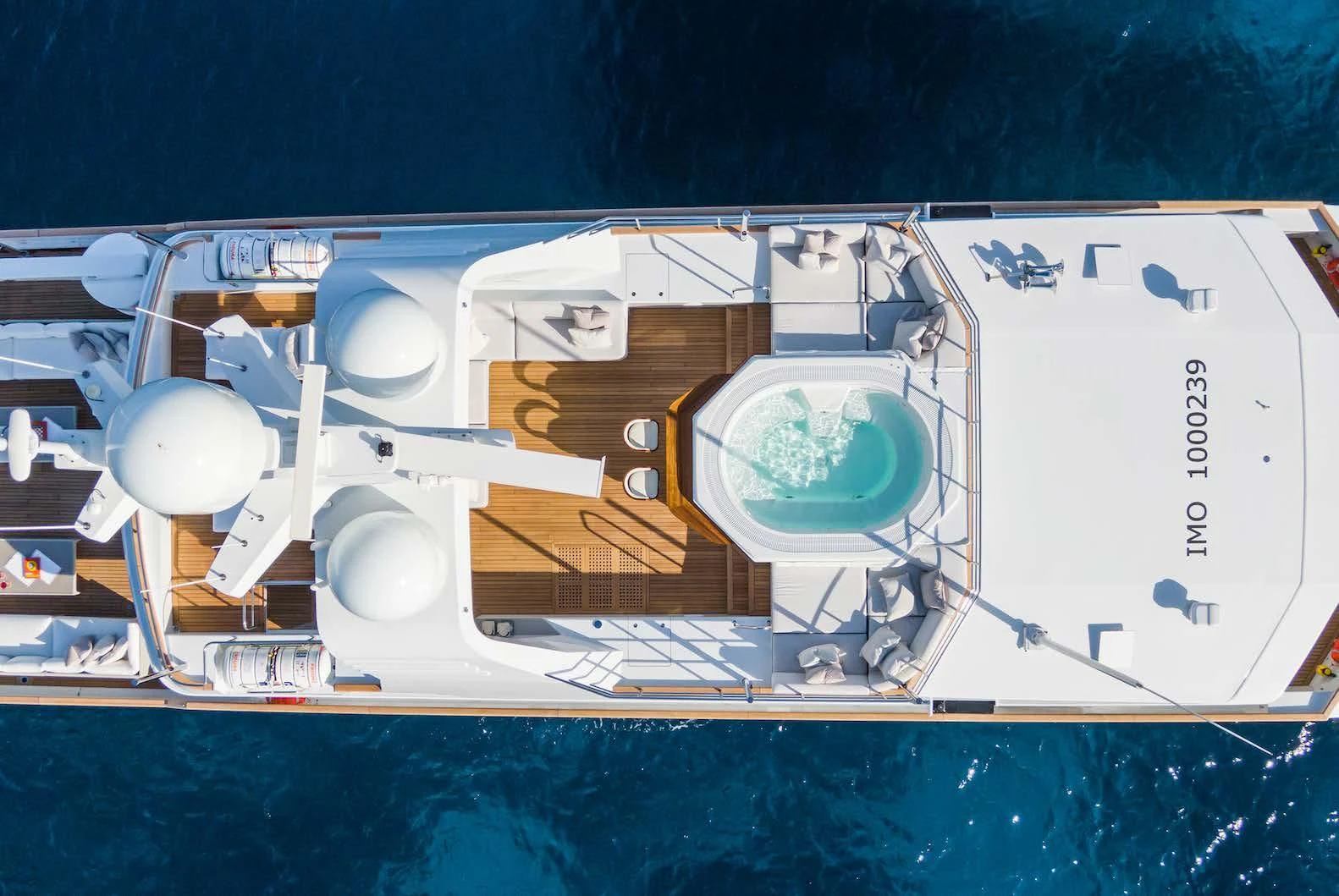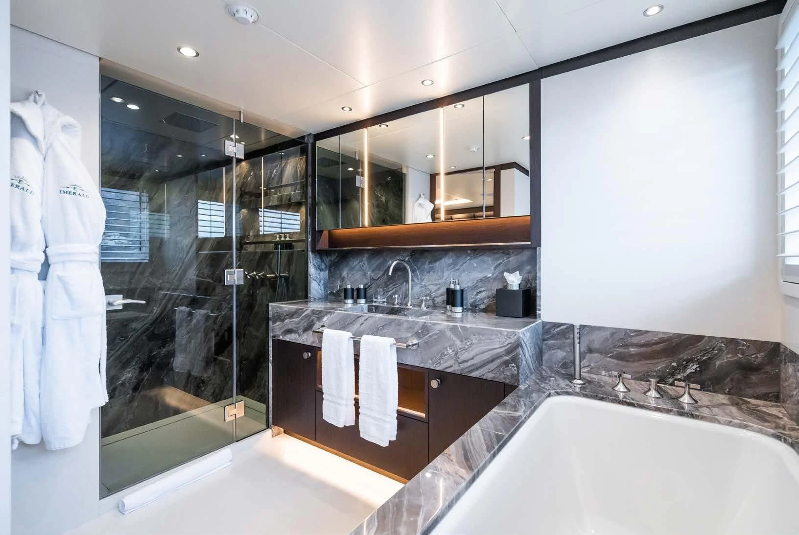 Social and entertaining areas are optimized on board EMERALD. Her deck areas are large and offer space for dining, sunbathing and lounging with friends. A Jacuzzi is ideal for lazy afternoons in the sun or for a soak under the stars. The crew of 10 is on hand at all times to serve up refreshments and cocktails. The interior of the yacht is highly sophisticated and stylish. Dramatic dark woods combine with pale soft-furnishings for a monochrome effect. A refit in 2023 took the yacht to even higher levels of excellence.