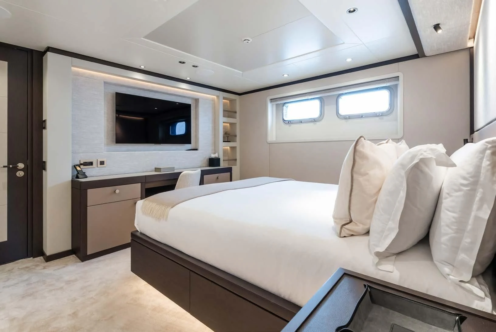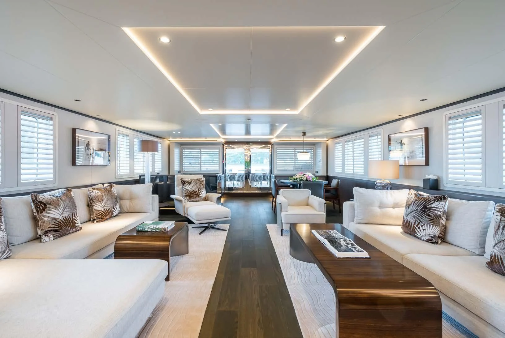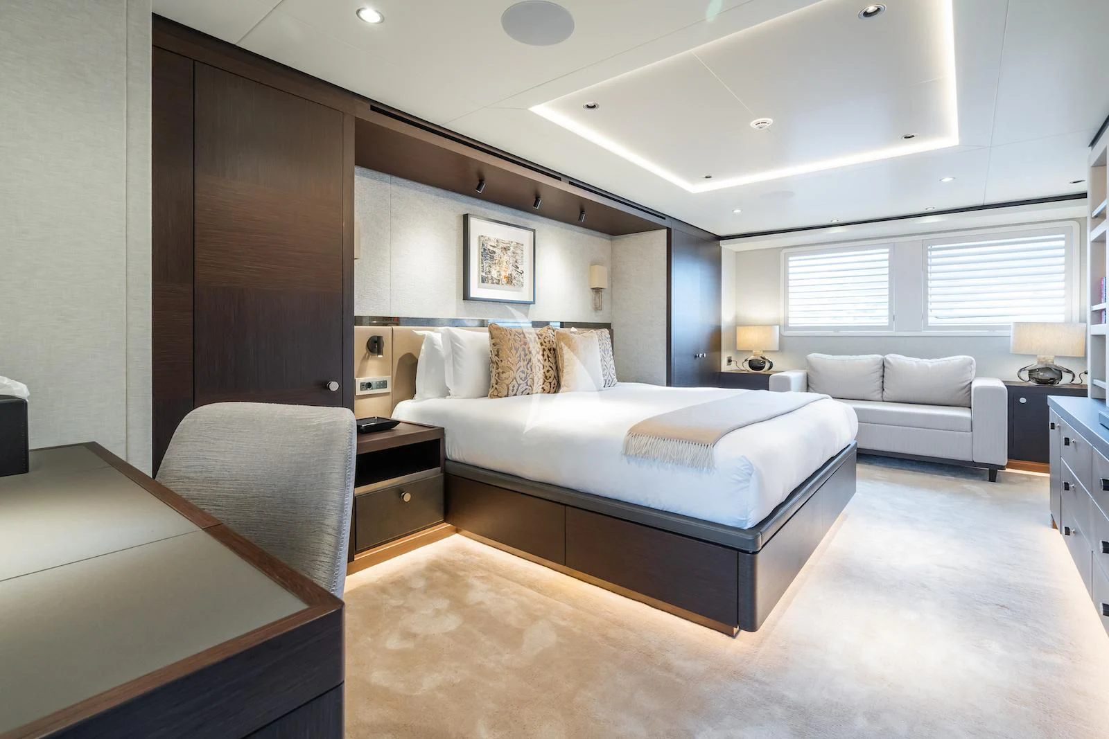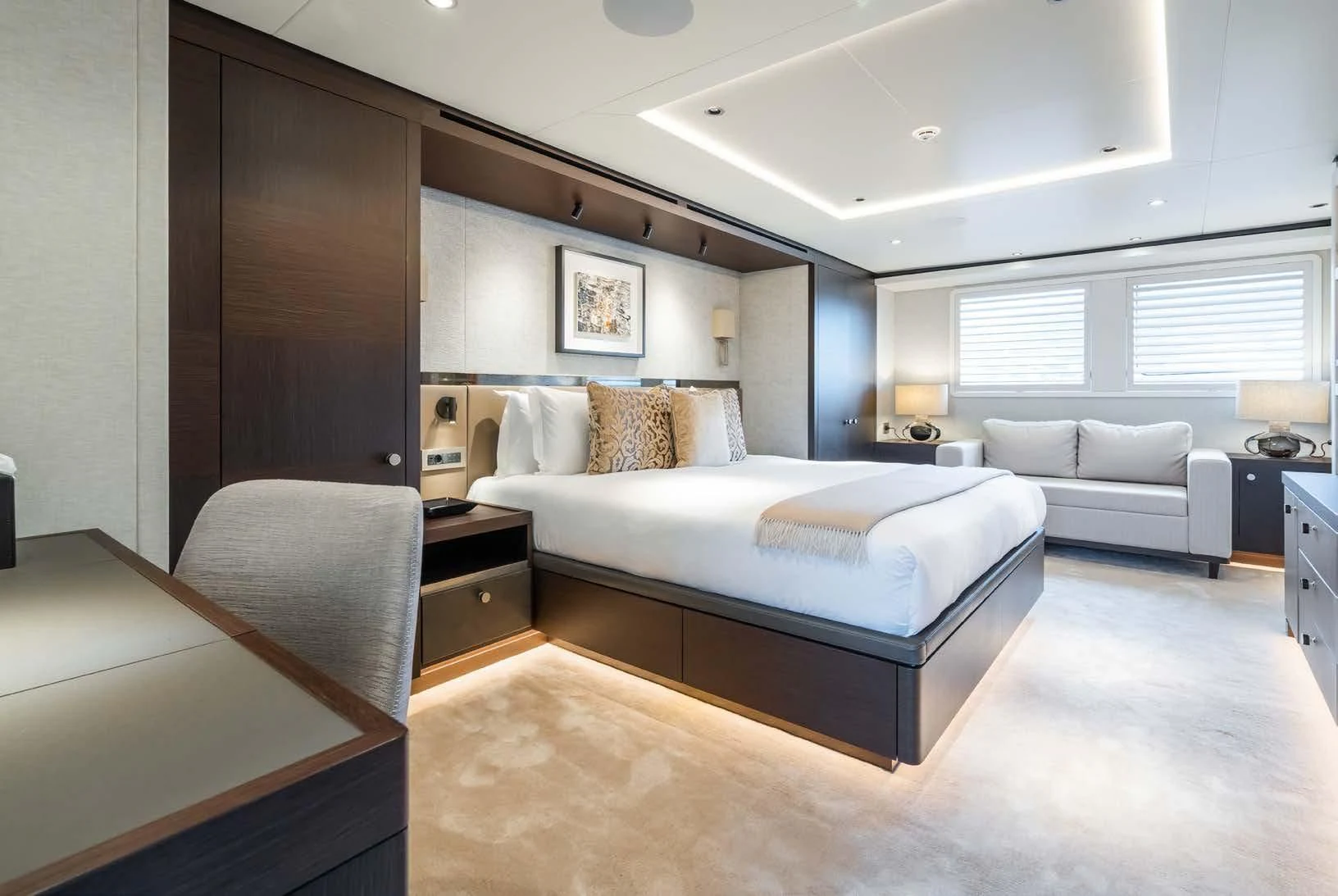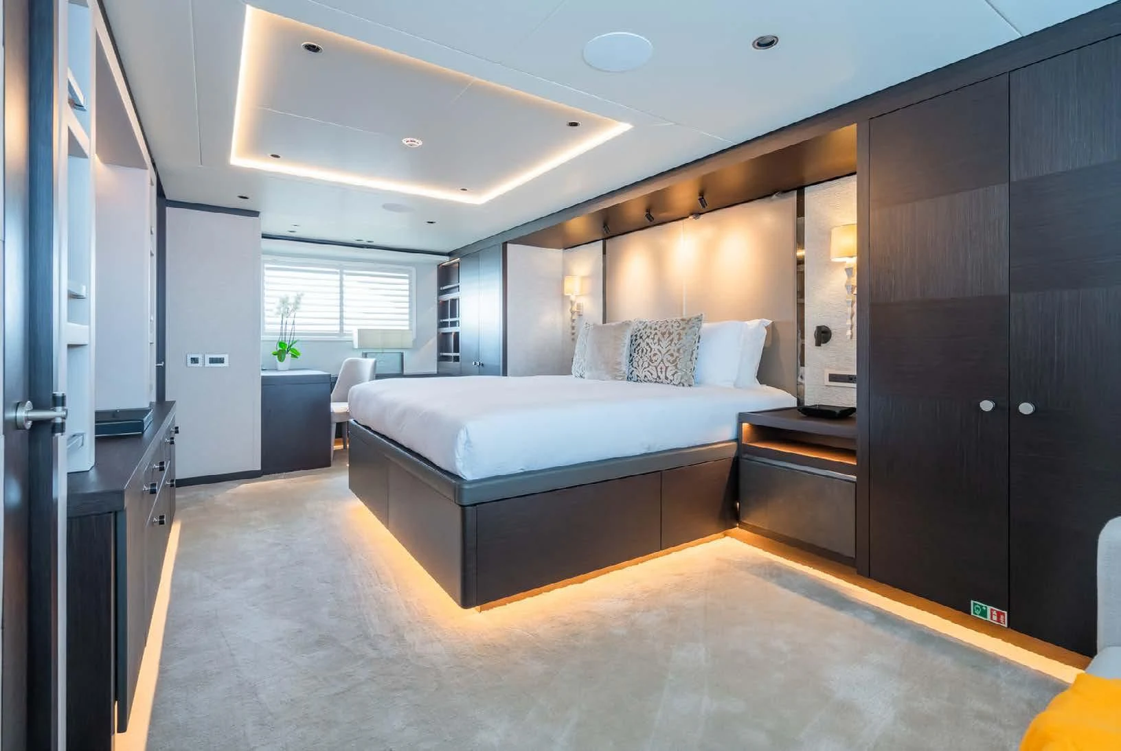 Social and entertaining areas are optimized on board EMERALD. Her deck areas are large and offer space for dining, sunbathing and lounging with friends. A Jacuzzi is ideal for lazy afternoons in the sun or for a soak under the stars. The crew of 10 is on hand at all times to serve up refreshments and cocktails. The interior of the yacht is highly sophisticated and stylish. Dramatic dark woods combine with pale soft-furnishings for a monochrome effect. A refit in 2023 took the yacht to even higher levels of excellence.