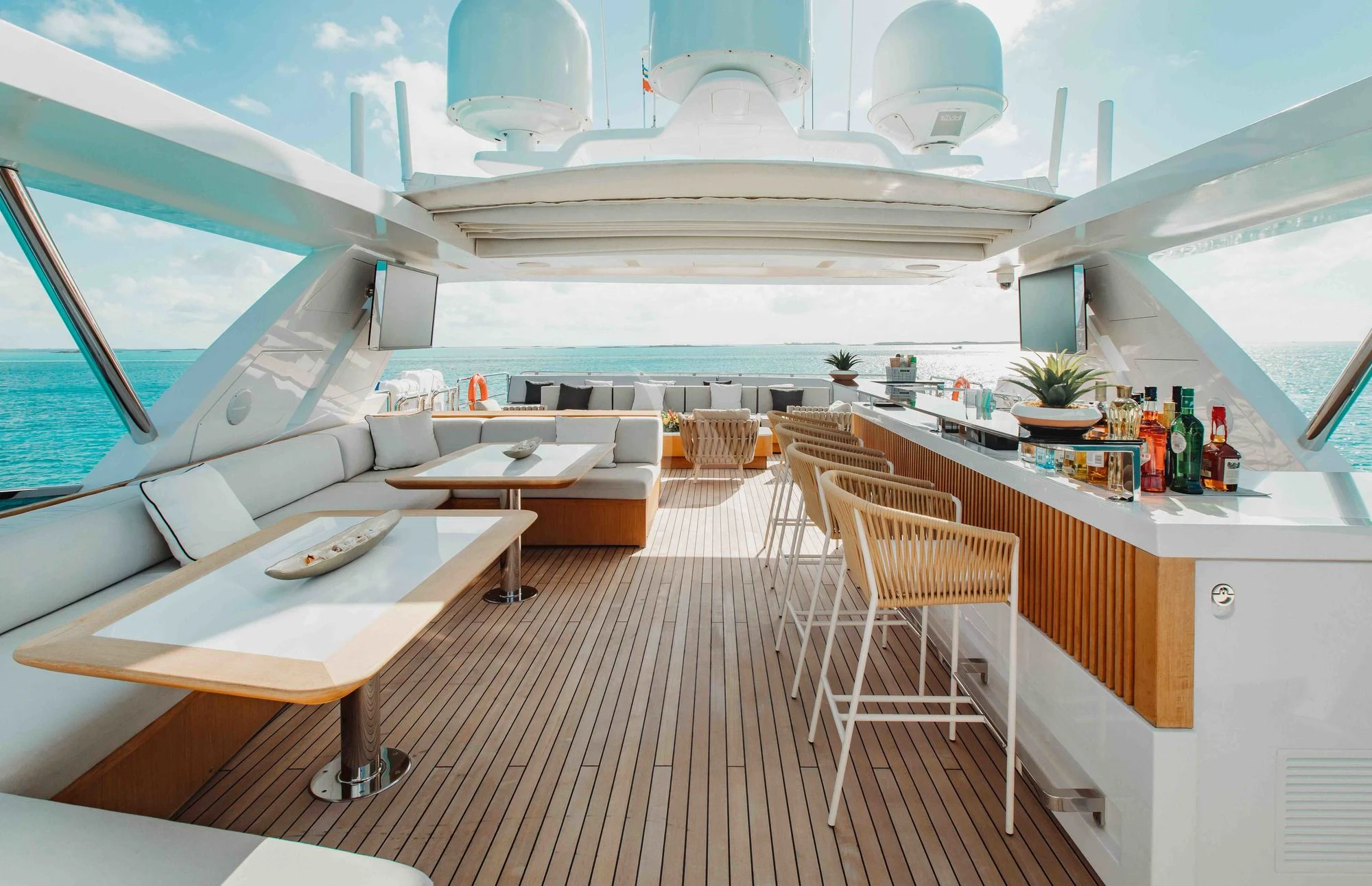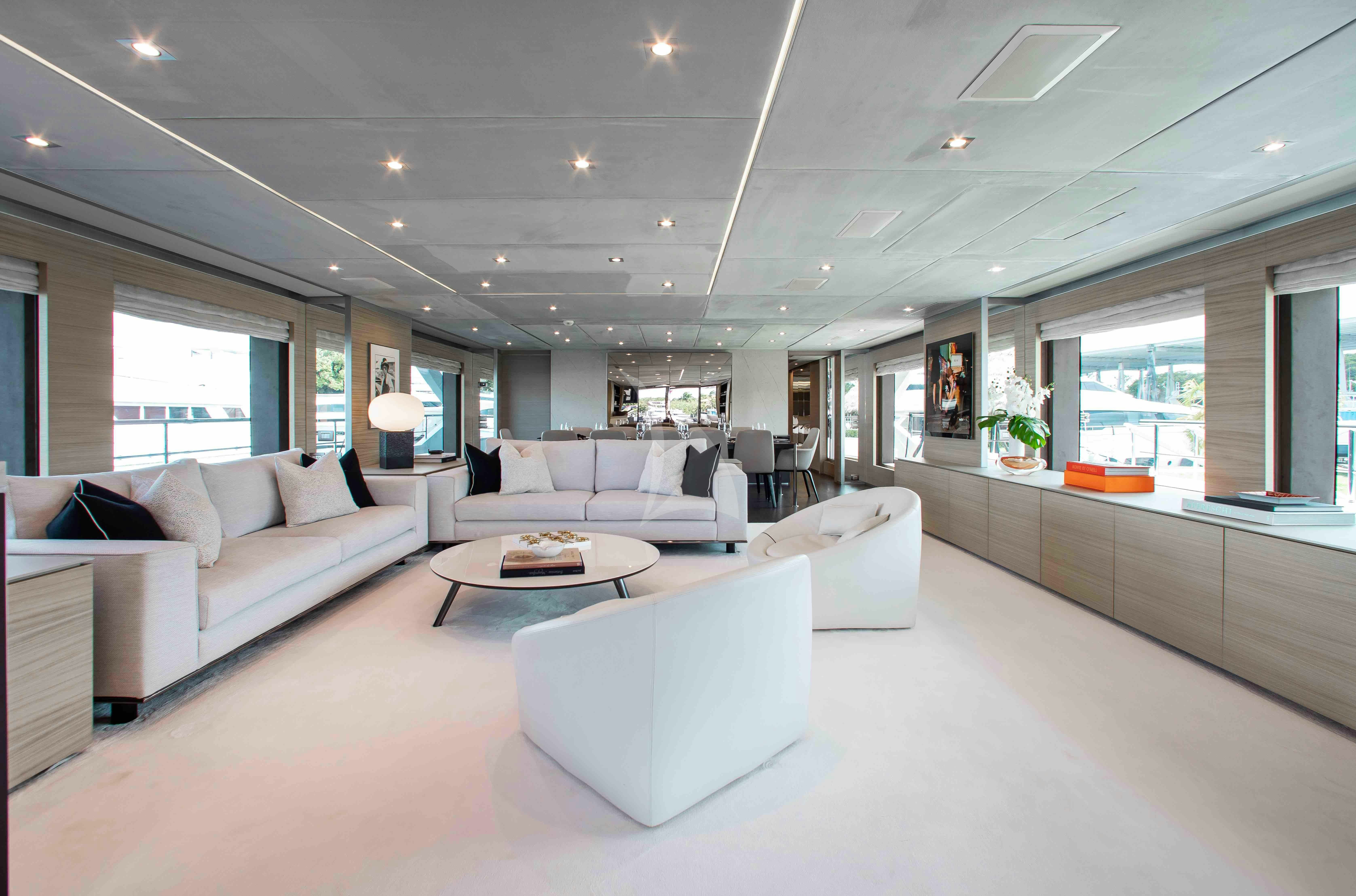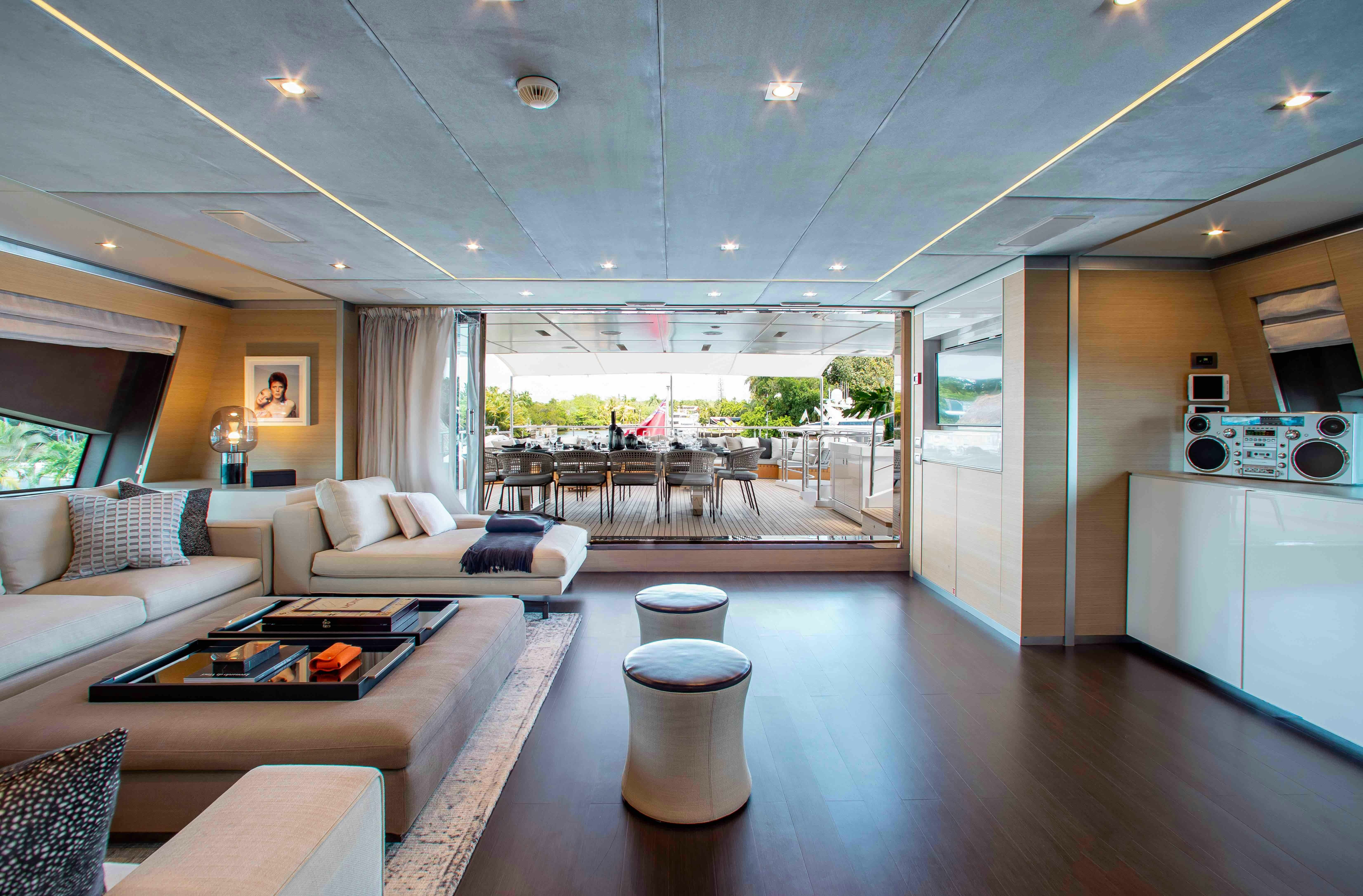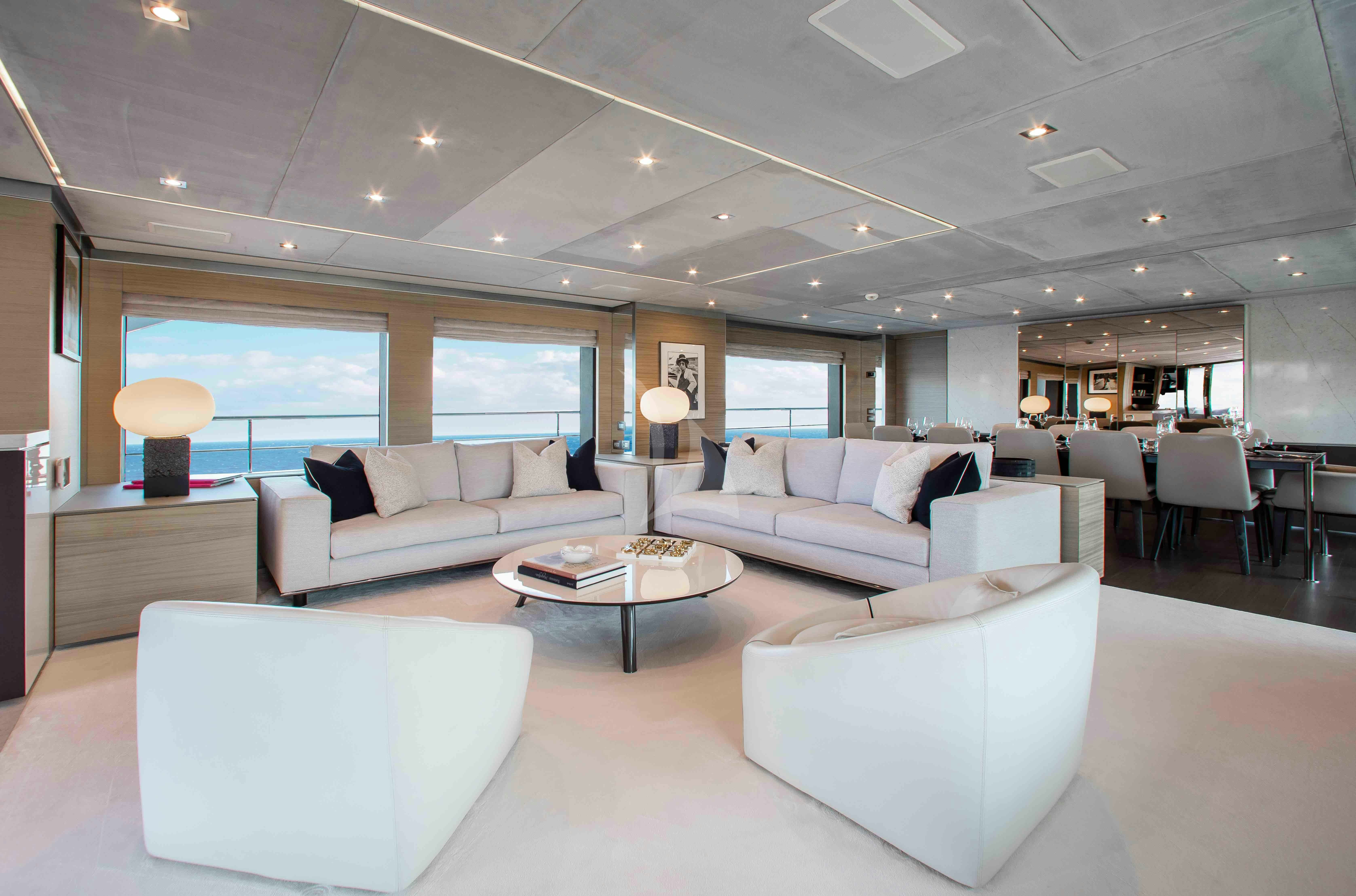 Wide sliding doors connect both salons to the exterior decks beyond creating fabulous spaces for seamless indoor/outdoor entertaining. Chic built-in sofa seating and a shaded alfresco table on the main aft deck set the scene for leisurely breakfasts and morning coffee while planning the adventures for the day ahead. For more formal alfresco occasions, the upper deck offers a stunning dining shaded dining table with integrated sofa seating along the stern providing a great break out lounge for night caps, coffee and petit fours under the stars. Wide side decks lead to the beautifully designed foredeck lounge that not only provide a superb spot for sundowners and snacks at cocktail hour, but also an expansive of sun pads and a large Jacuzzi for relaxing dips day or night. The entire deck can be left exposed to the sun and starry night skies or shaded beneath removable awnings. And the attractions don’t end there. EMINA’s sundeck is another stellar space for entertaining and socializing at the shaded sit-up bar or soaking in the rays on the sun loungers and sofas while taking in the 360-degree views.