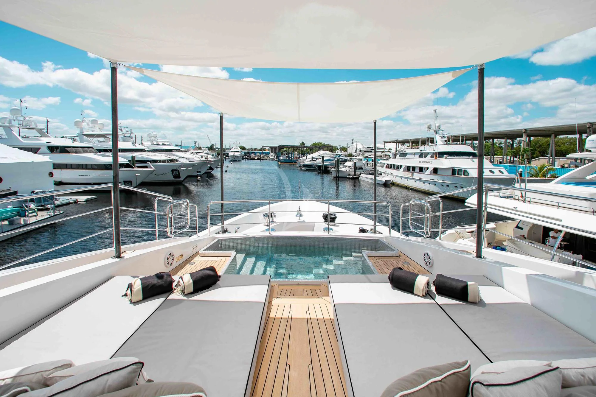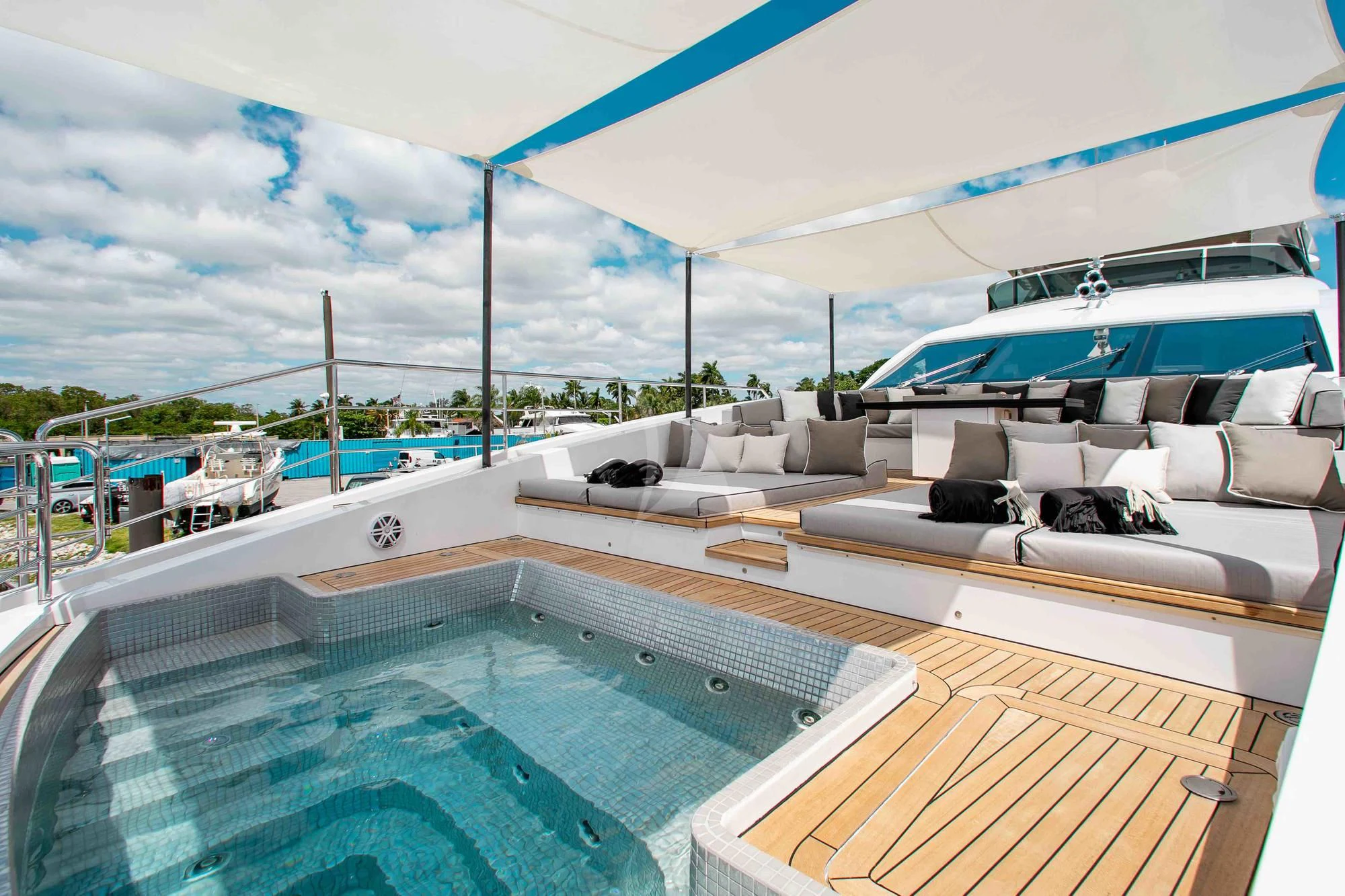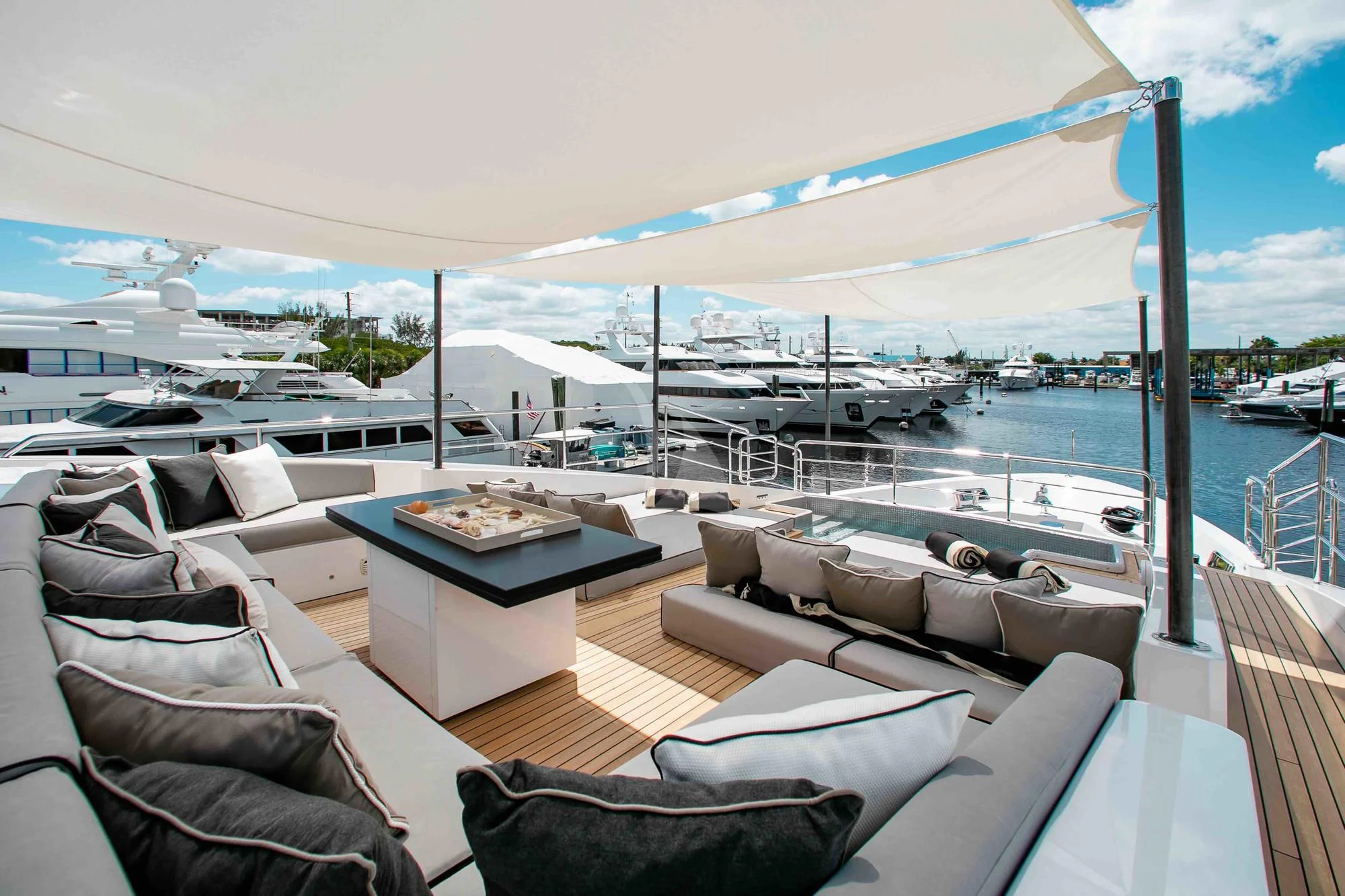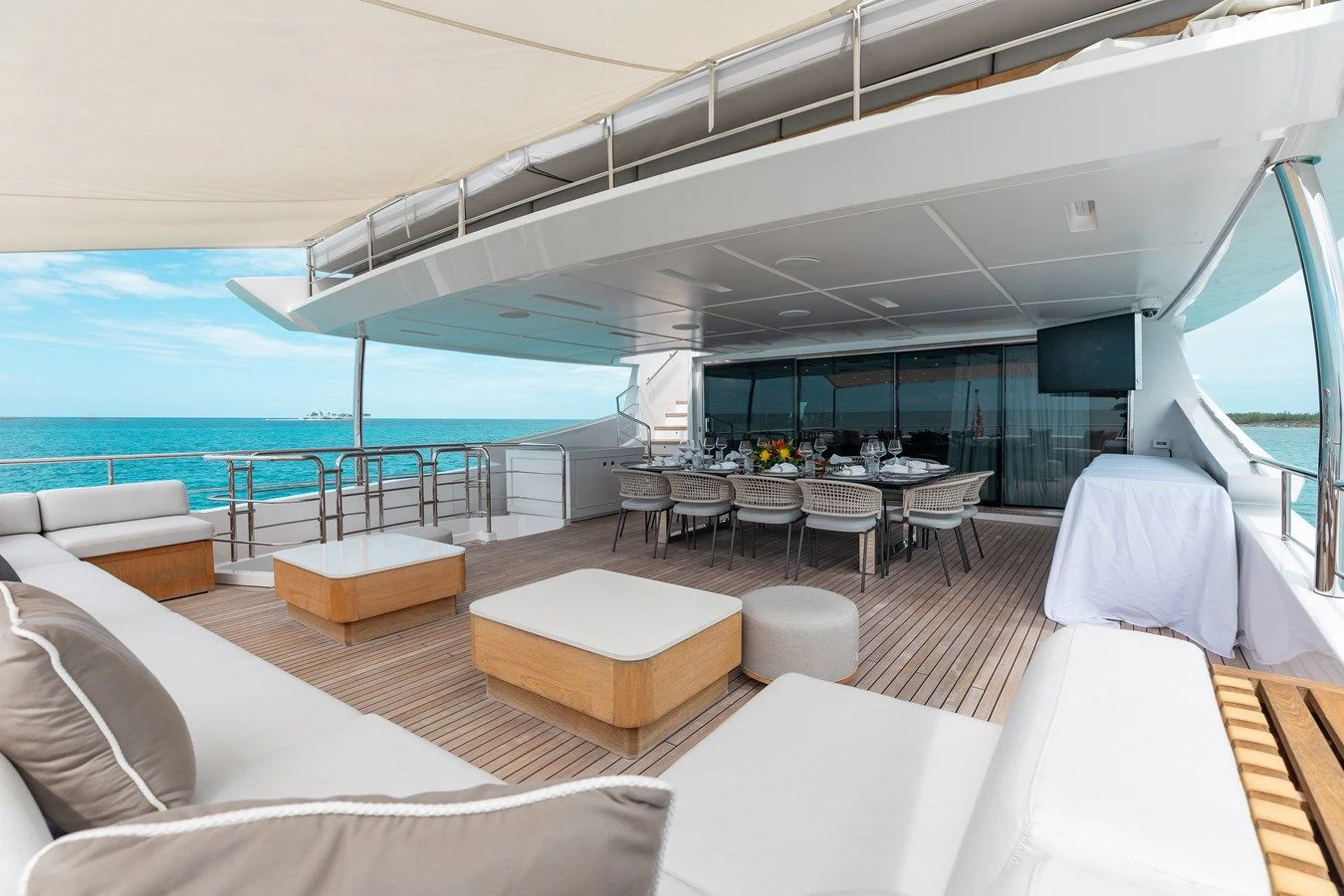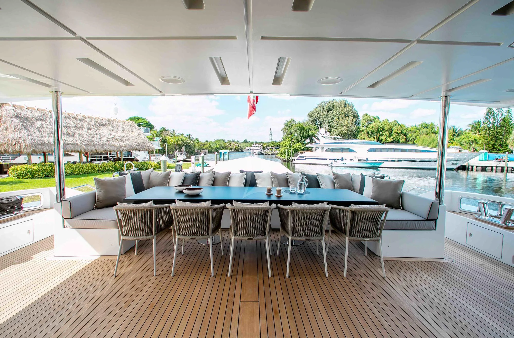 Wide sliding doors connect both salons to the exterior decks beyond creating fabulous spaces for seamless indoor/outdoor entertaining. Chic built-in sofa seating and a shaded alfresco table on the main aft deck set the scene for leisurely breakfasts and morning coffee while planning the adventures for the day ahead. For more formal alfresco occasions, the upper deck offers a stunning dining shaded dining table with integrated sofa seating along the stern providing a great break out lounge for night caps, coffee and petit fours under the stars. Wide side decks lead to the beautifully designed foredeck lounge that not only provide a superb spot for sundowners and snacks at cocktail hour, but also an expansive of sun pads and a large Jacuzzi for relaxing dips day or night. The entire deck can be left exposed to the sun and starry night skies or shaded beneath removable awnings. And the attractions don’t end there. EMINA’s sundeck is another stellar space for entertaining and socializing at the shaded sit-up bar or soaking in the rays on the sun loungers and sofas while taking in the 360-degree views.