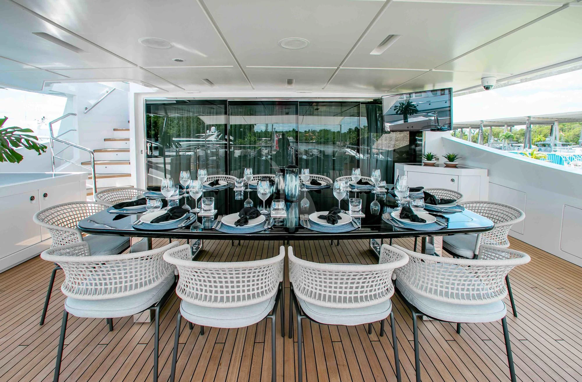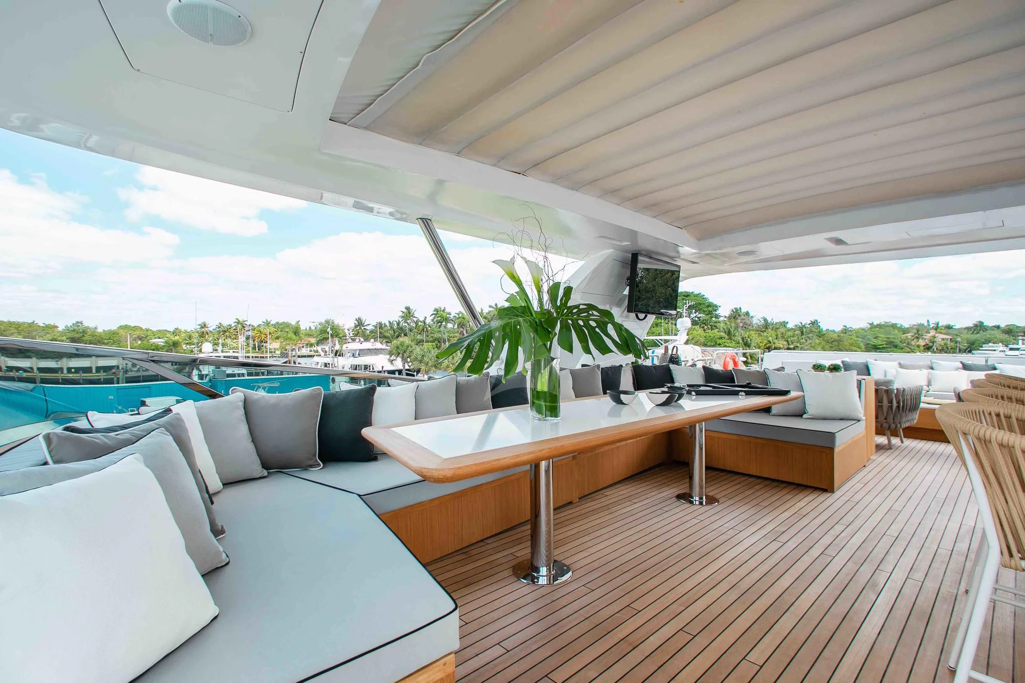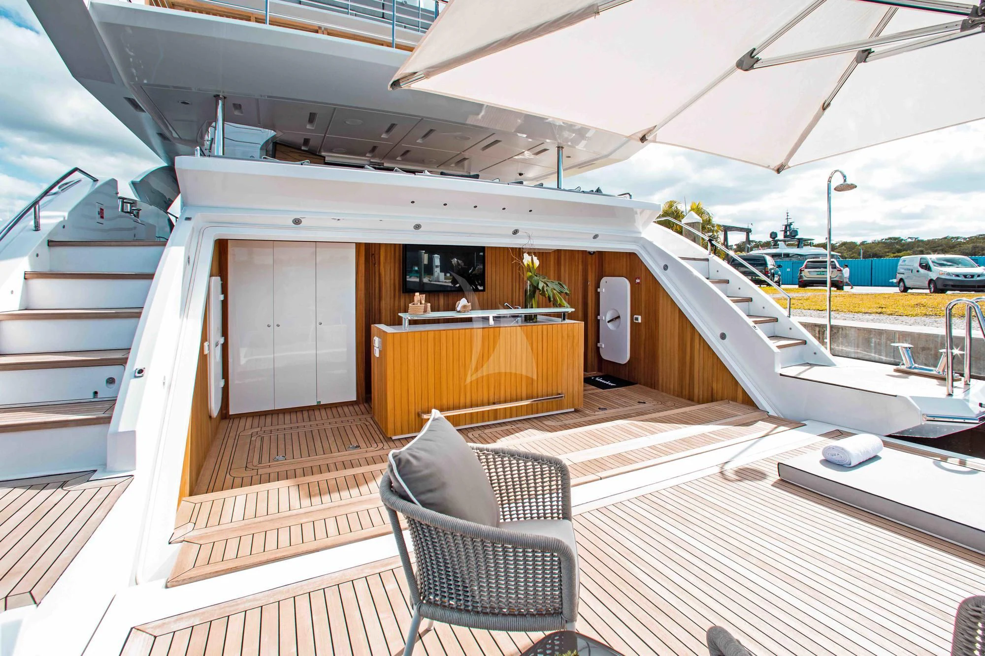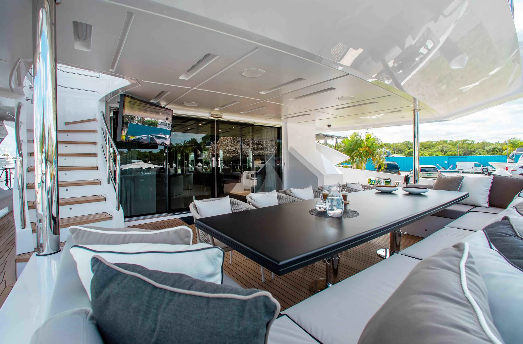 Wide sliding doors connect both salons to the exterior decks beyond creating fabulous spaces for seamless indoor/outdoor entertaining. Chic built-in sofa seating and a shaded alfresco table on the main aft deck set the scene for leisurely breakfasts and morning coffee while planning the adventures for the day ahead. For more formal alfresco occasions, the upper deck offers a stunning dining shaded dining table with integrated sofa seating along the stern providing a great break out lounge for night caps, coffee and petit fours under the stars. Wide side decks lead to the beautifully designed foredeck lounge that not only provide a superb spot for sundowners and snacks at cocktail hour, but also an expansive of sun pads and a large Jacuzzi for relaxing dips day or night. The entire deck can be left exposed to the sun and starry night skies or shaded beneath removable awnings. And the attractions don’t end there. EMINA’s sundeck is another stellar space for entertaining and socializing at the shaded sit-up bar or soaking in the rays on the sun loungers and sofas while taking in the 360-degree views.