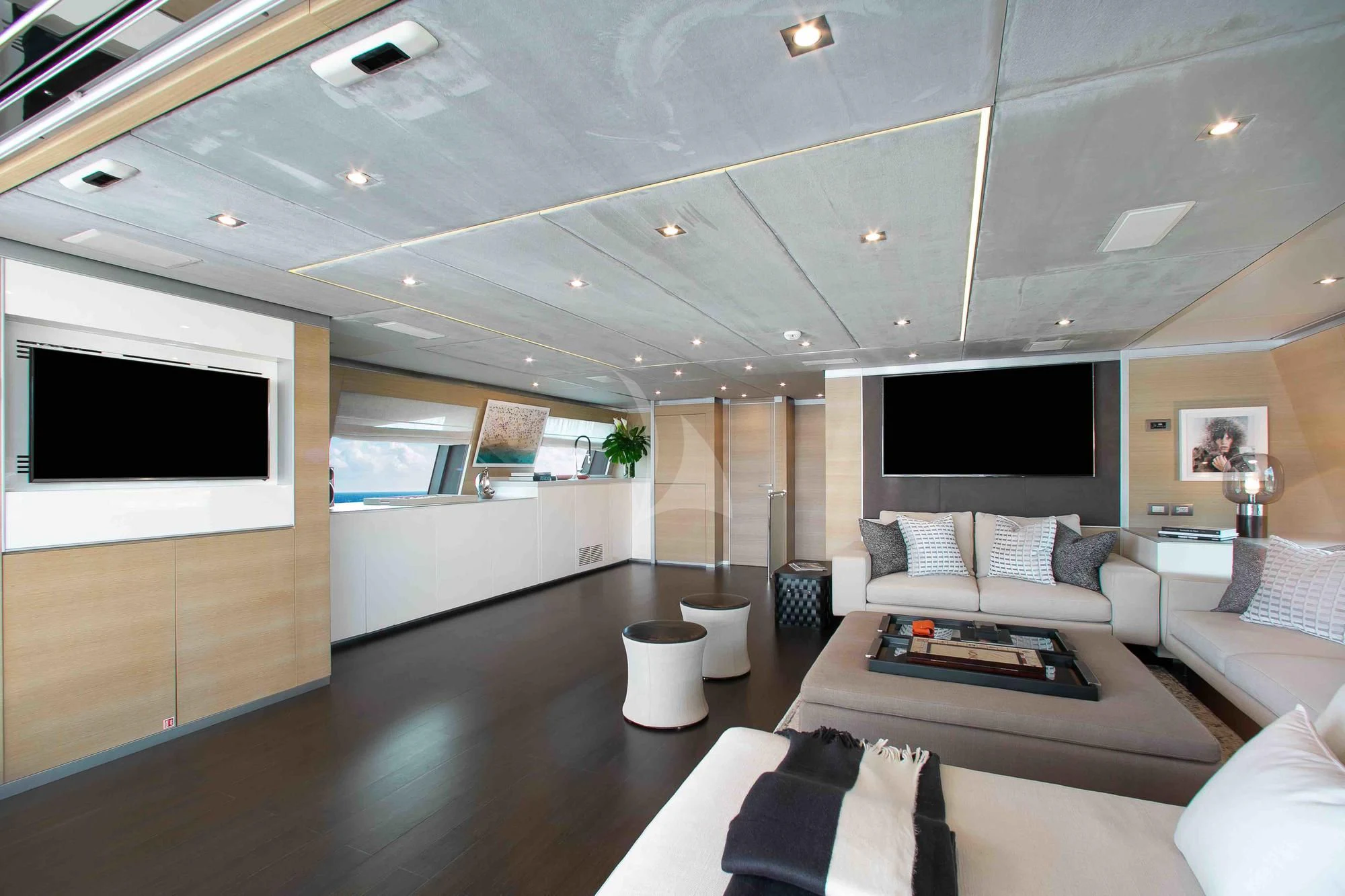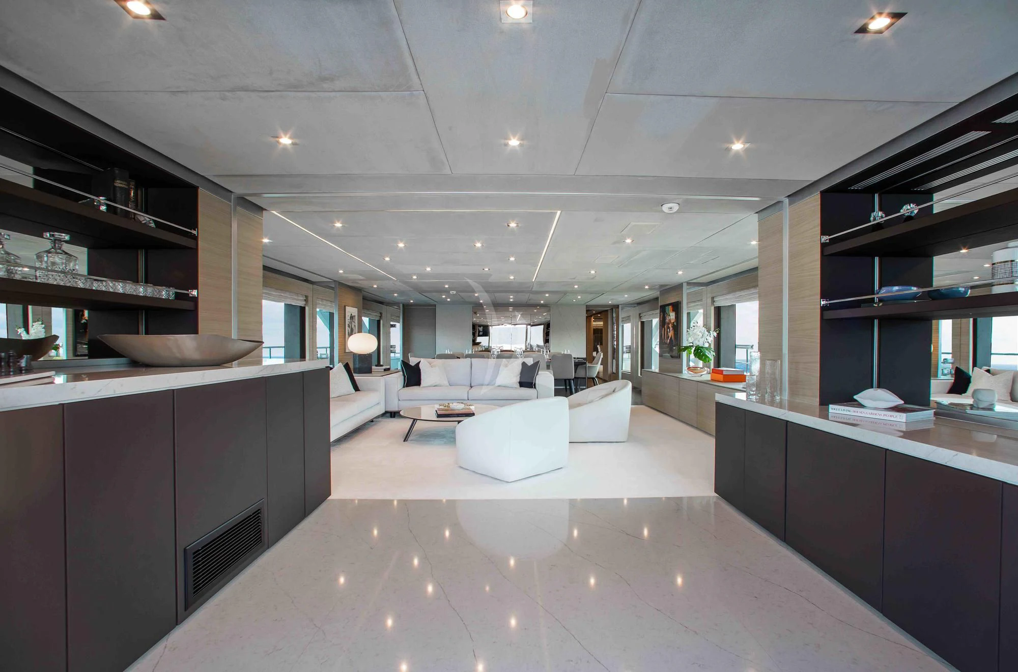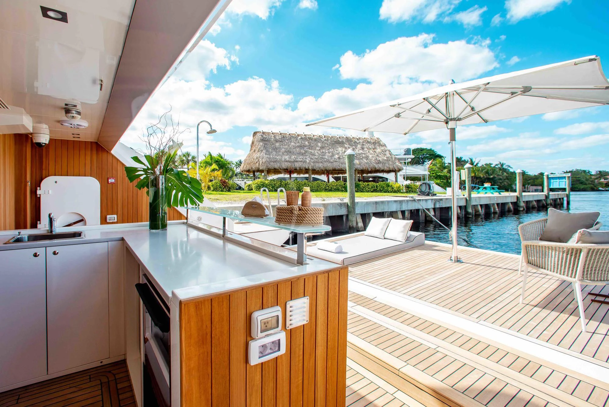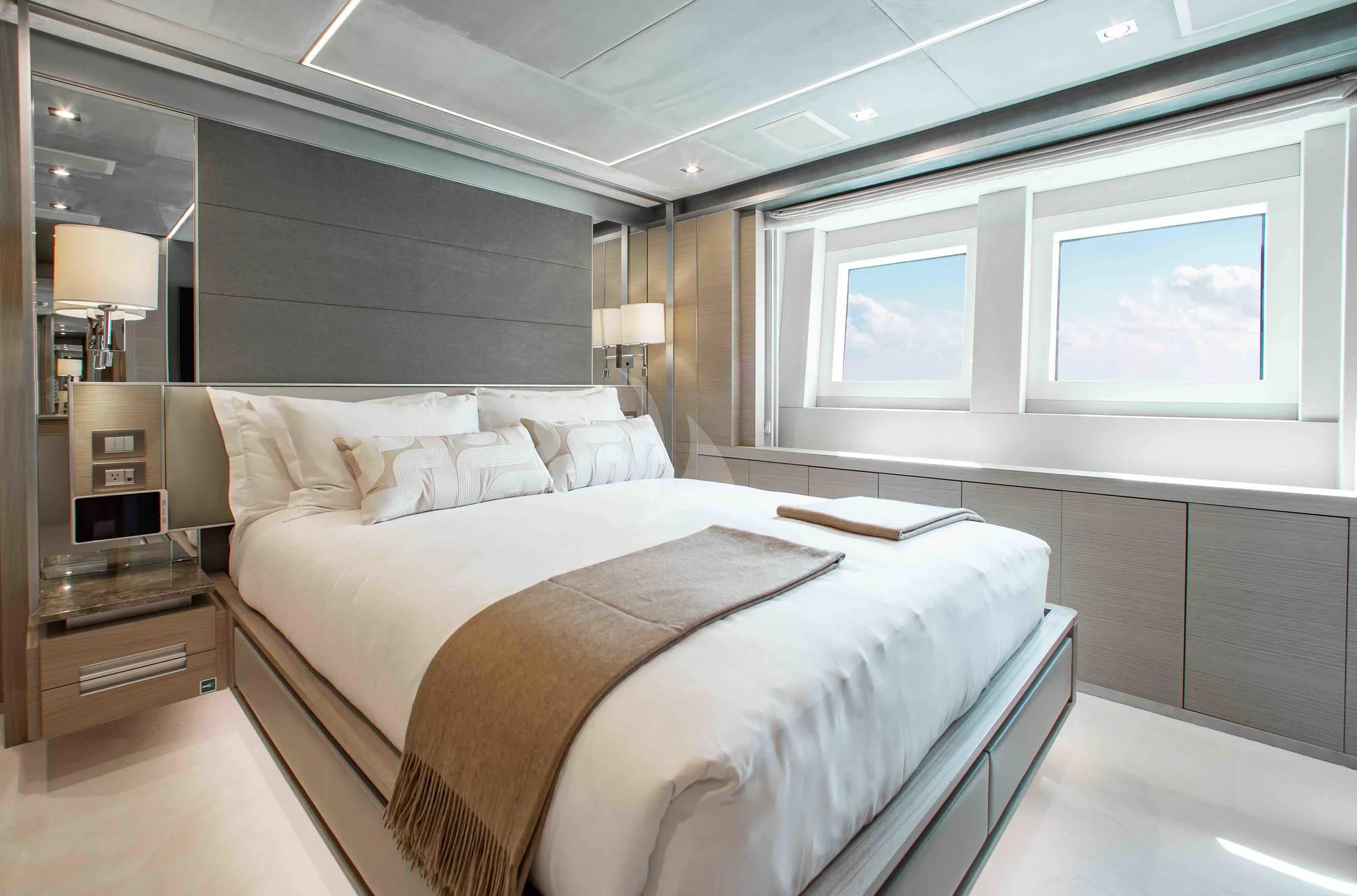 More than just a place to access EMINA’s array of toys and her 35’ Contender, the beach club and extended swimming platform have more than enough room to relax and sunbathe at the water’s edge. There’s a bar for cocktails and a full toy box for entertainment. Sea-Doo Spark Jet Skis, towable toys and a wakeboard keep the thrill-seekers happy while paddleboards and snorkeling kit allow for gentler pursuits. Scuba diving gear and Seabobs allow guests to take their adventures under the waves. There is also a well-equipped gym.