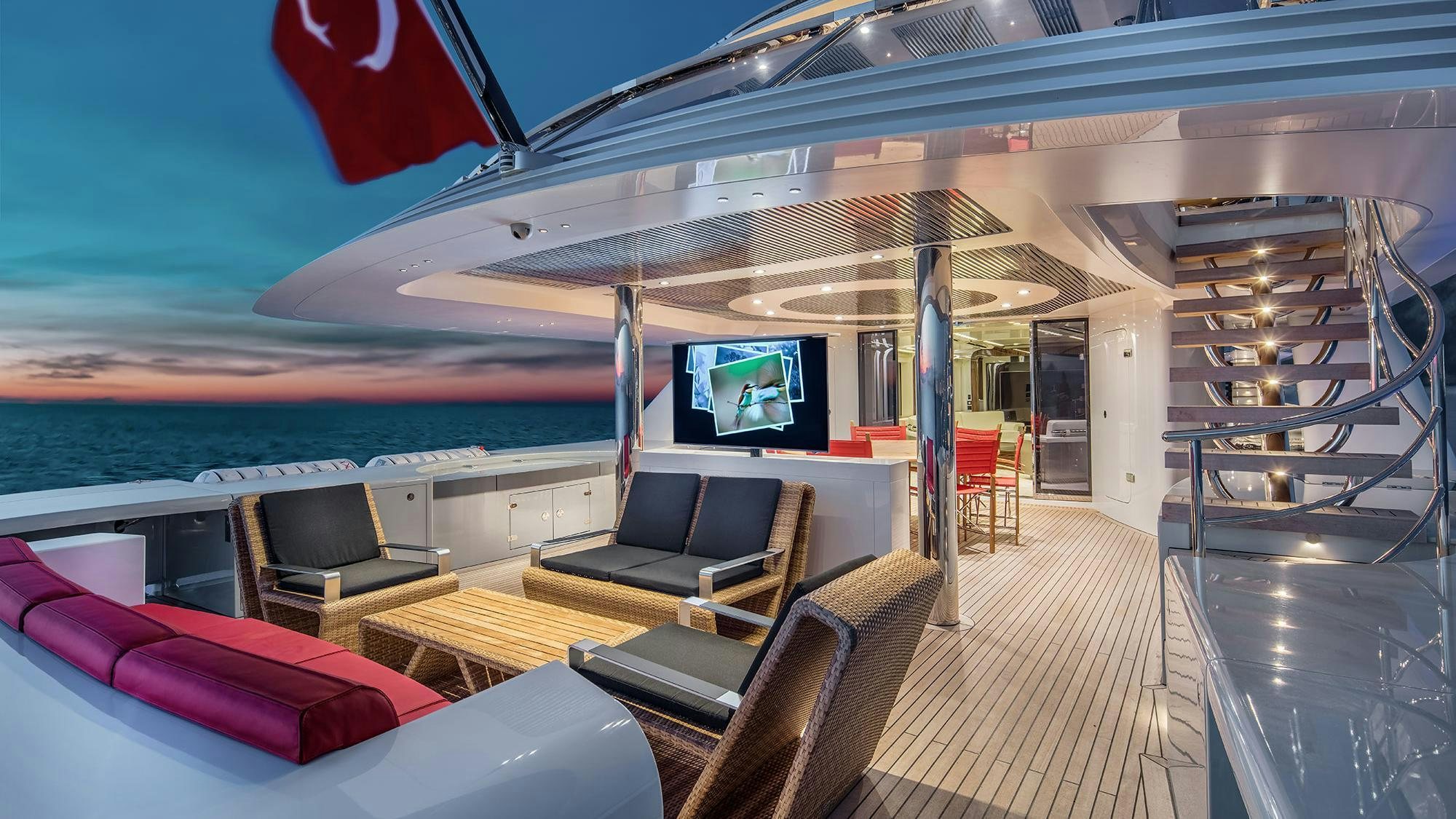 On deck, spaces are just as modern and sophisticated. The main deck aft is the place for shaded alfresco dining at the stylish circular dining table. There are sofas and coffee tables overlooking the stern for morning coffee and pastries, but by night, the space can be transformed into an outdoor cinema with a massive TV screen raised at the press of a button. The bridge deck offers another incredible space for dining overlooking the bow with integrated sofa seating and coffee tables that can be raised for lavish meals of sundowner cocktails and canapés while enjoying the expansive views. Aft there is a relaxed area for lounging partially shaded by the sundeck overhang—it’s a spot for escaping with a good book during the day.