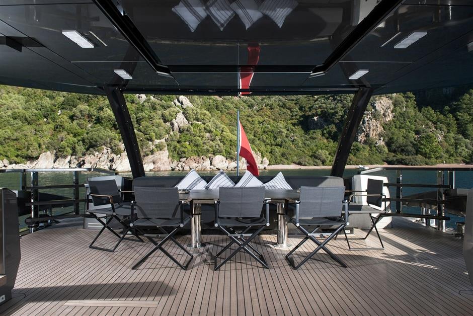 FX's exterior spaces are equally impressive, with multiple sundecks offering plenty of space for lounging in the sun or enjoying alfresco dining under the stars. The yacht's exterior designer has paid close attention to detail when creating these spaces, ensuring they are as comfortable as they are beautiful. In terms of performance capabilities, FX boasts an impressive cruising speed of 19 knots and can reach maximum speeds of up to 23 knots when needed. With stabilizers at its disposal along with thruster stern this yacht provides smooth sailing experience even in choppy waters.