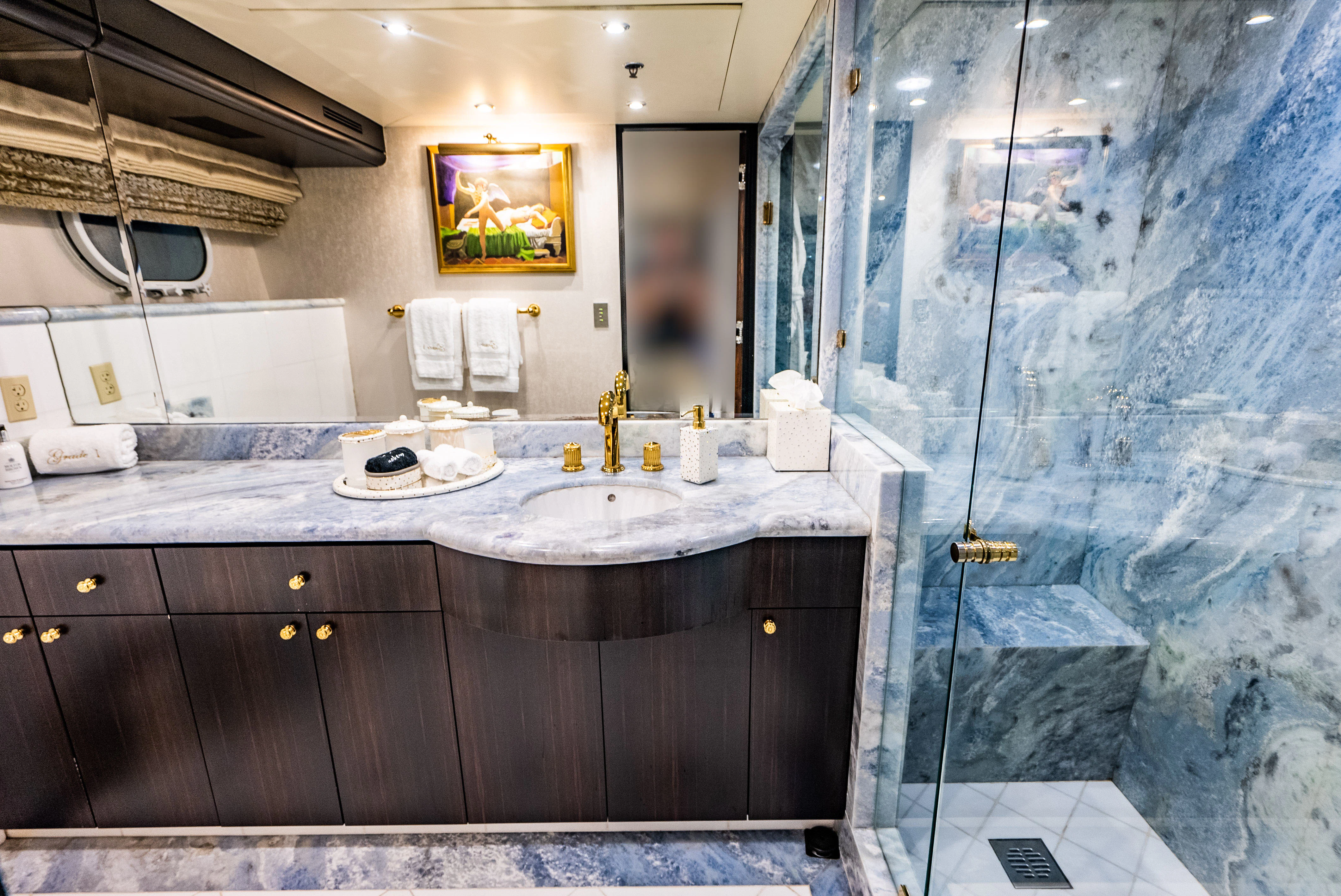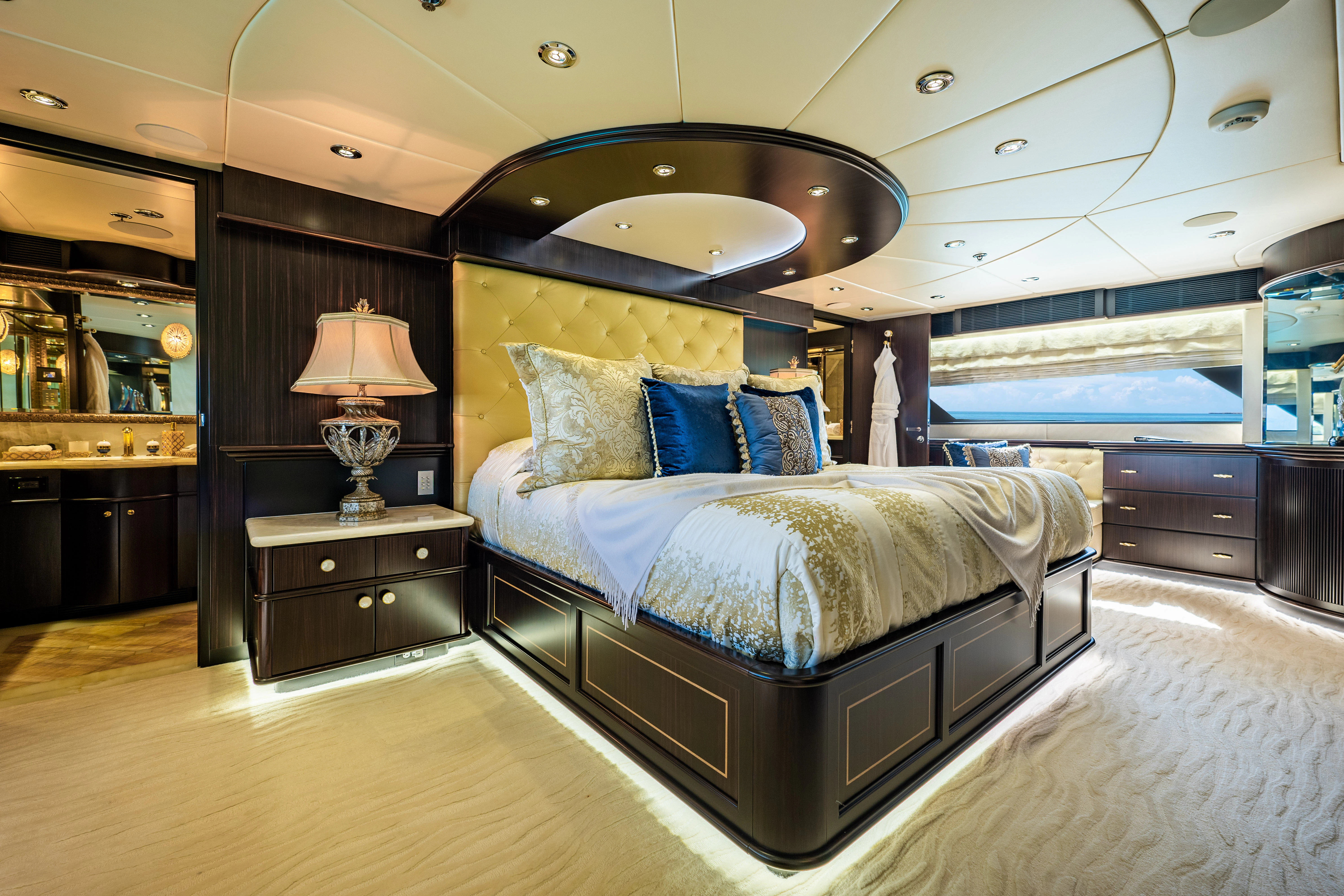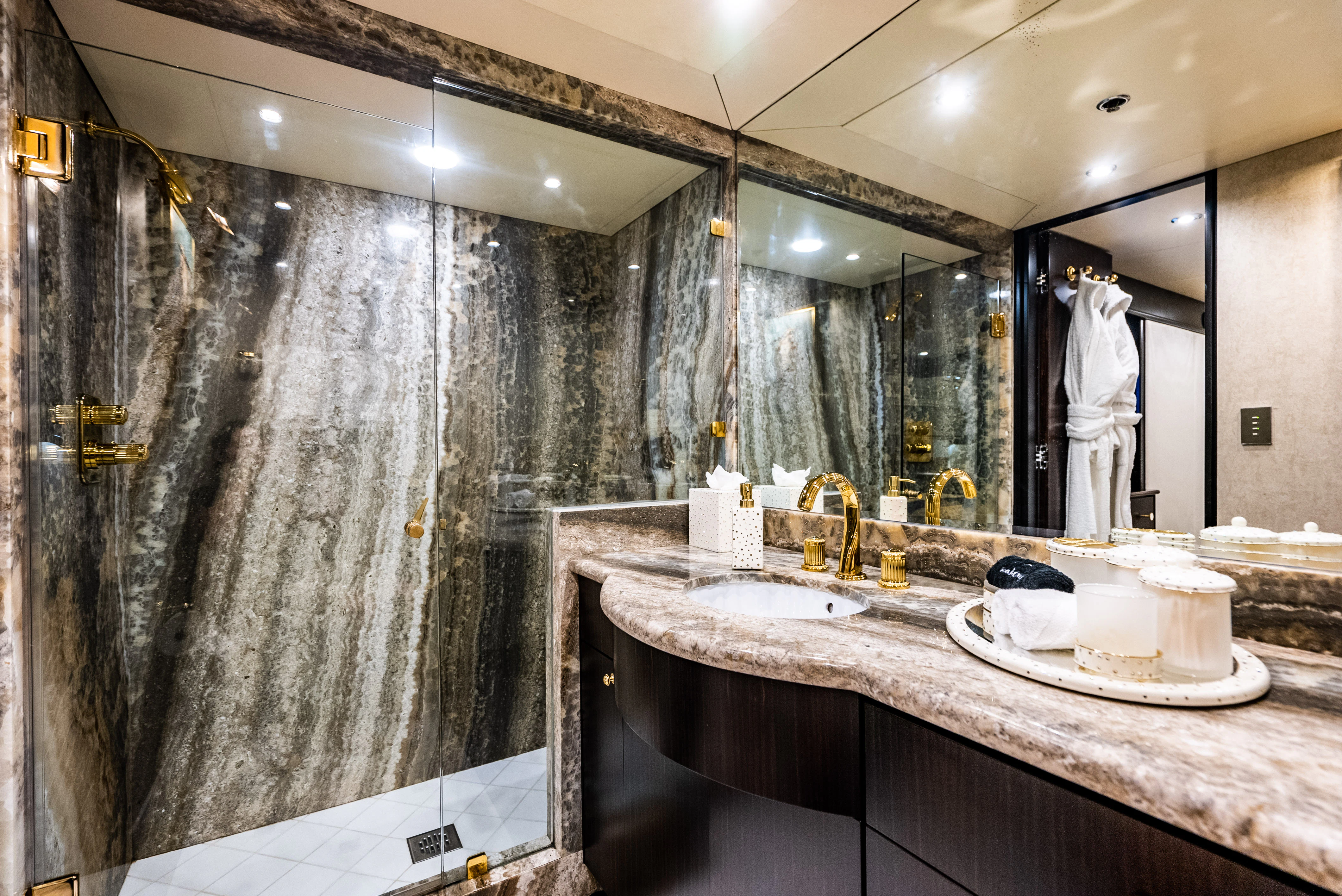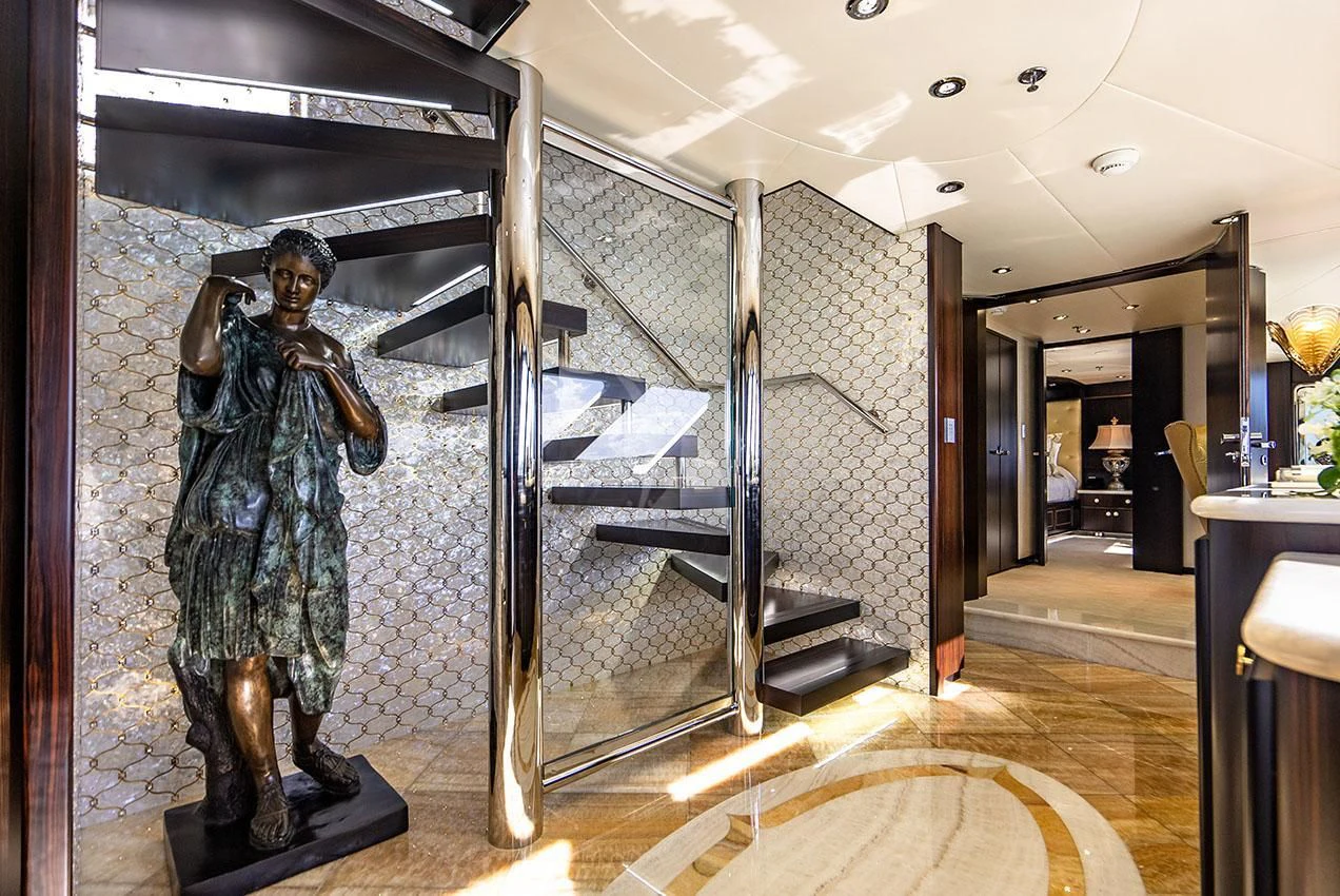 GRADE I’s rich interiors are the work of Destry Darr and feature opulent styling, particularly in the main salon with its richly patterned upholstery in gold, cream and silver, ebony veneers and intricate marble. The generous lounge area is separated from the glass-topped formal dining table by an attractive onyx-covered cabinet. A beautiful chandelier provides added drama while near floor-to-ceiling windows allow natural light to illuminate the beautiful detailing. For more intimate gatherings, privacy blinds can be lowered around the entire salon. The upper deck skylounge is a much more relaxed affair with a stunning bar, sumptuous blue leather sofas and ottomans, and the perfect set up for popcorn and movie nights. There is also a handy games table for friendly competition over cards, A shimmering staircase of wood, glass and chrome connects the floors, highlighted by mother-of-pearl wall coverings to striking effect, and flanked by a full-height bronze statue.