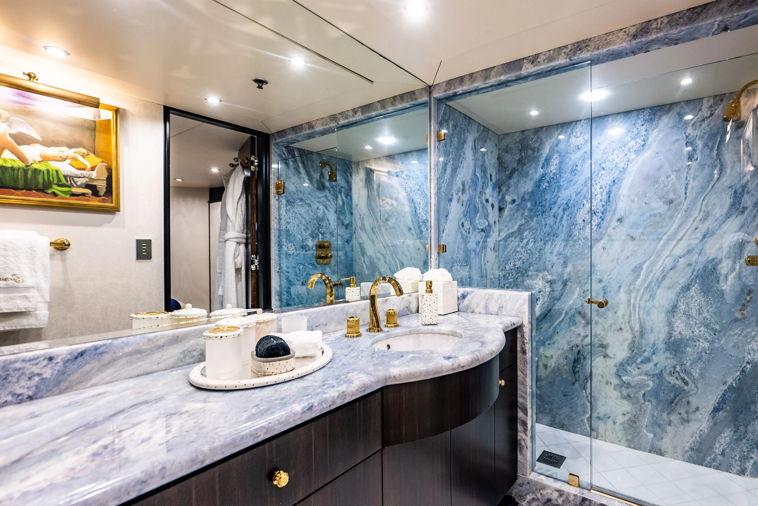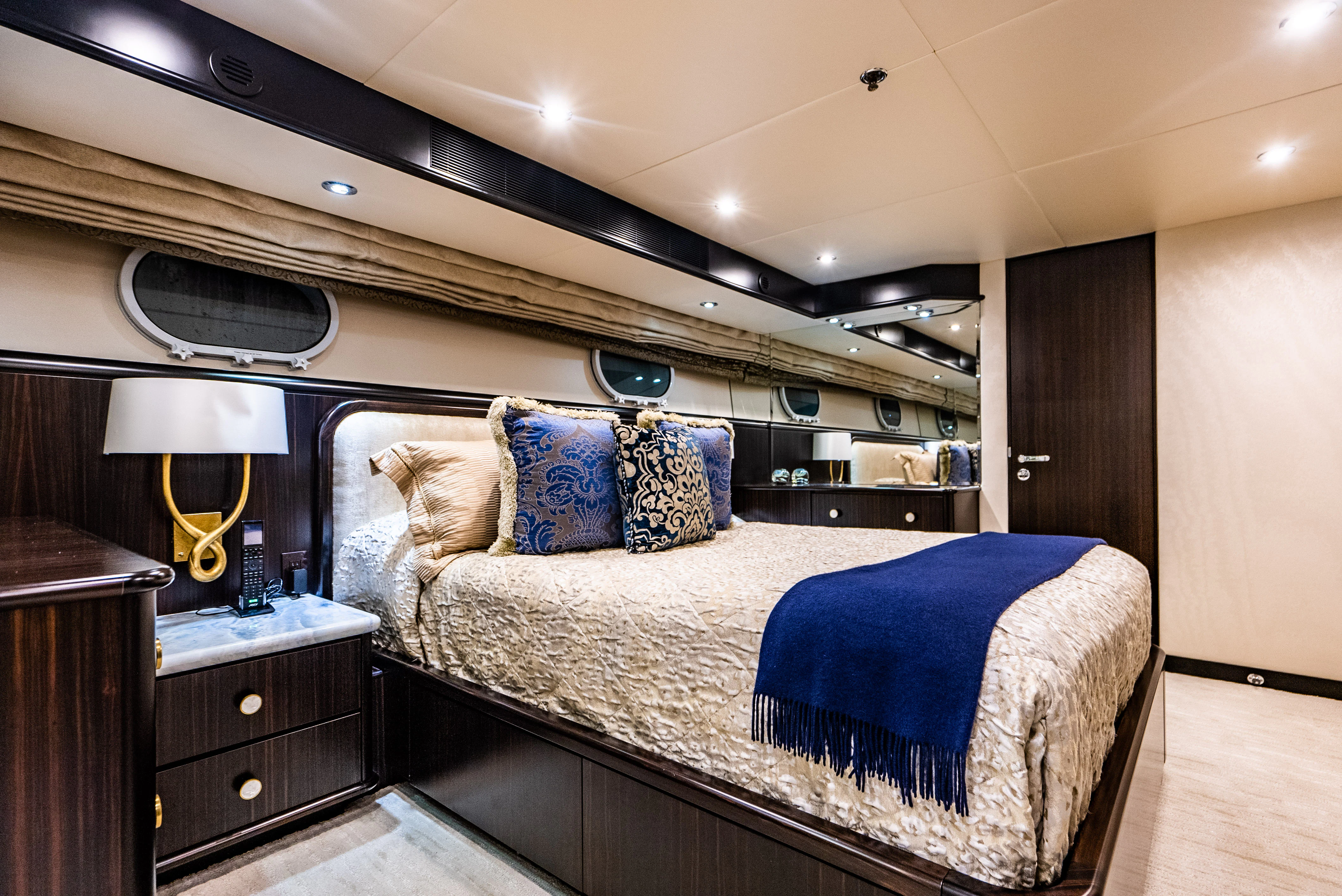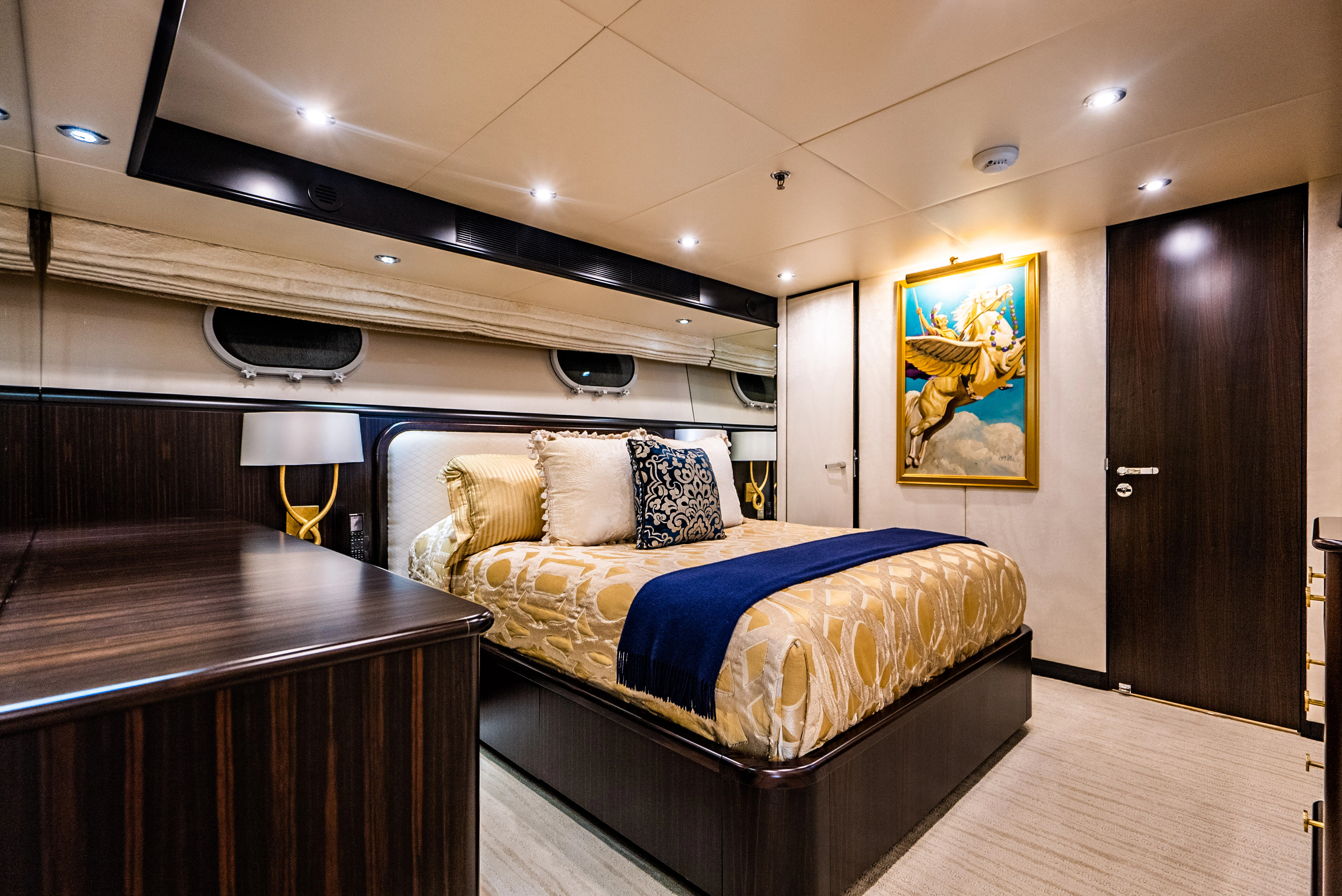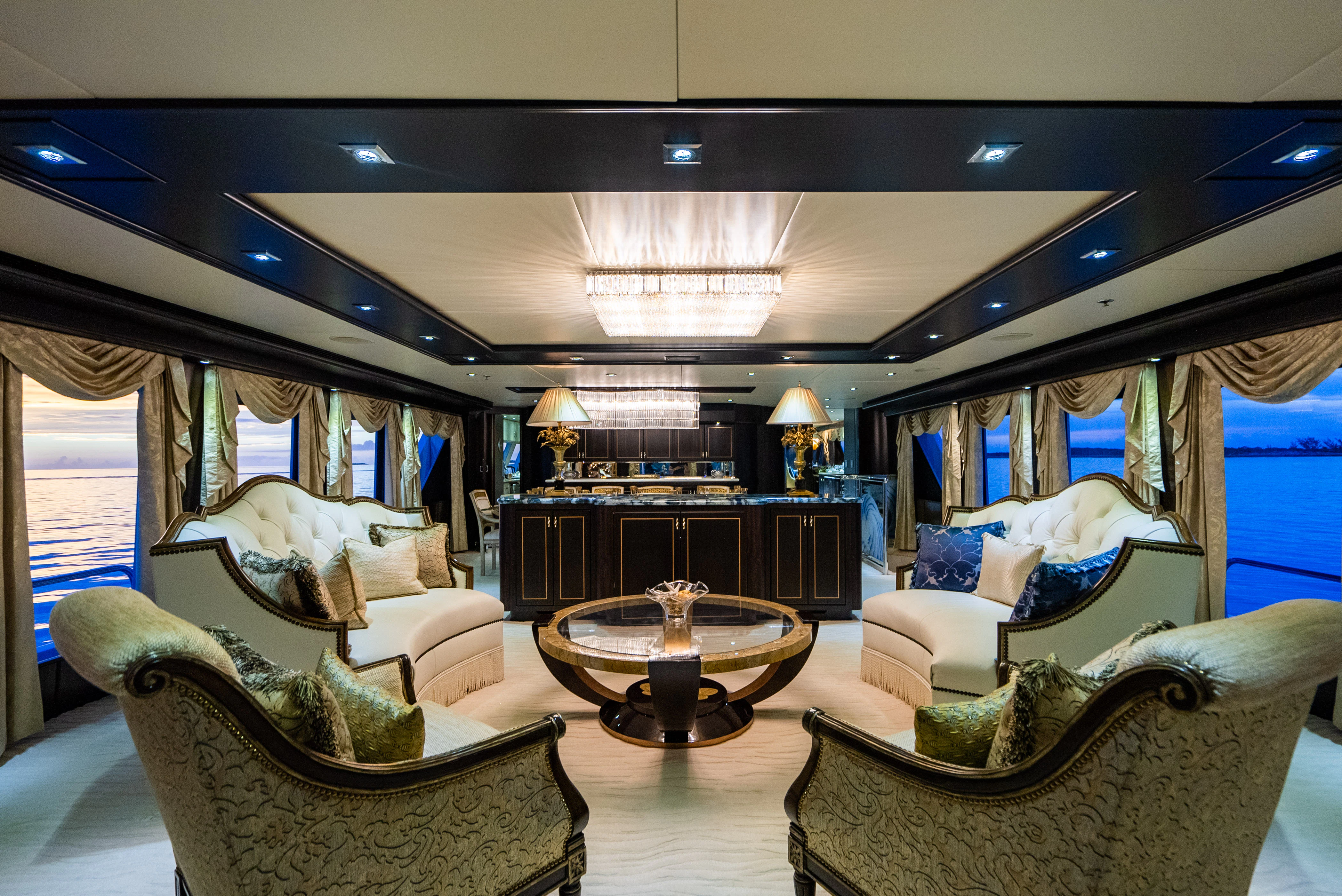 GRADE I’s rich interiors are the work of Destry Darr and feature opulent styling, particularly in the main salon with its richly patterned upholstery in gold, cream and silver, ebony veneers and intricate marble. The generous lounge area is separated from the glass-topped formal dining table by an attractive onyx-covered cabinet. A beautiful chandelier provides added drama while near floor-to-ceiling windows allow natural light to illuminate the beautiful detailing. For more intimate gatherings, privacy blinds can be lowered around the entire salon. The upper deck skylounge is a much more relaxed affair with a stunning bar, sumptuous blue leather sofas and ottomans, and the perfect set up for popcorn and movie nights. There is also a handy games table for friendly competition over cards, A shimmering staircase of wood, glass and chrome connects the floors, highlighted by mother-of-pearl wall coverings to striking effect, and flanked by a full-height bronze statue.