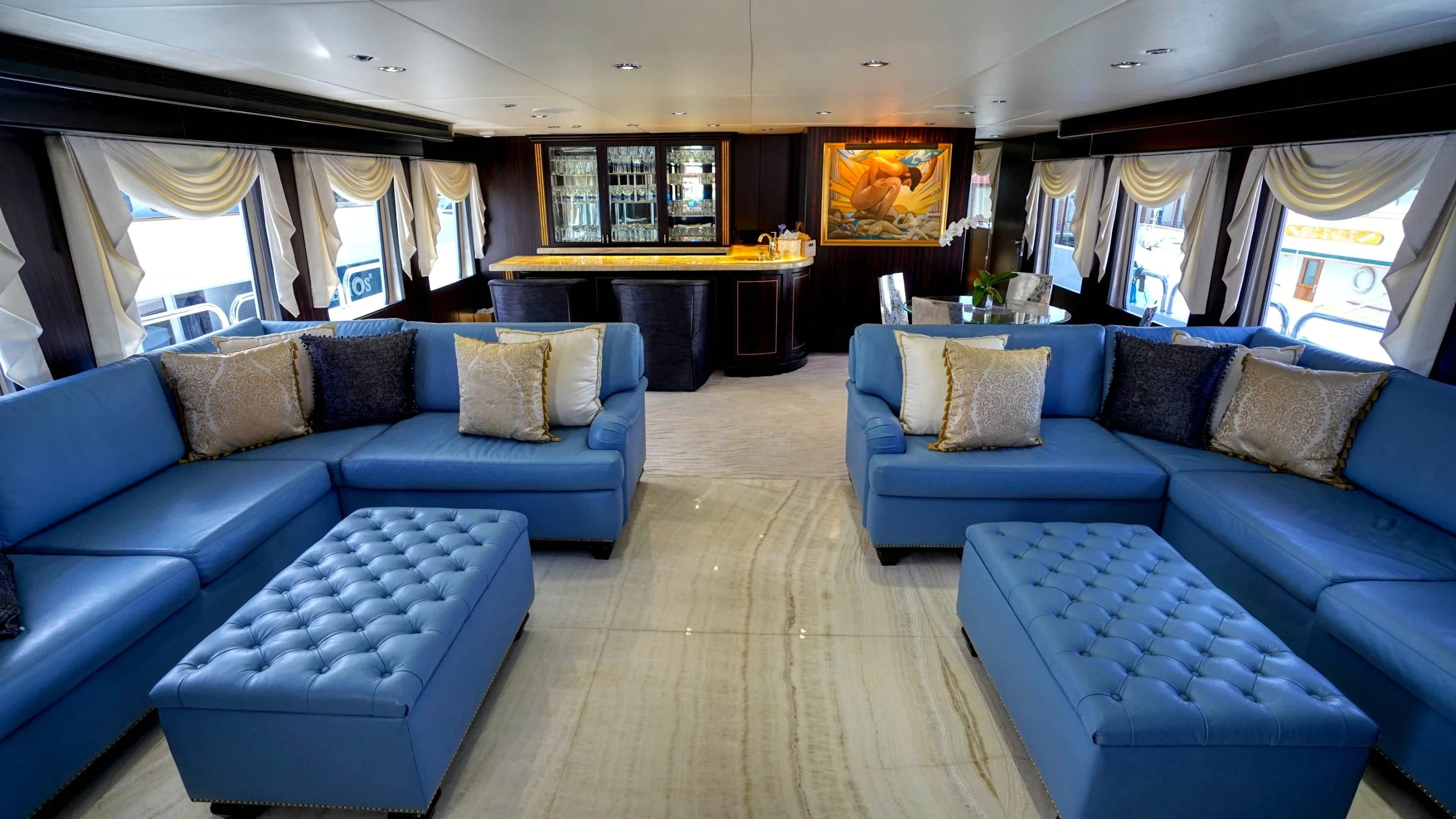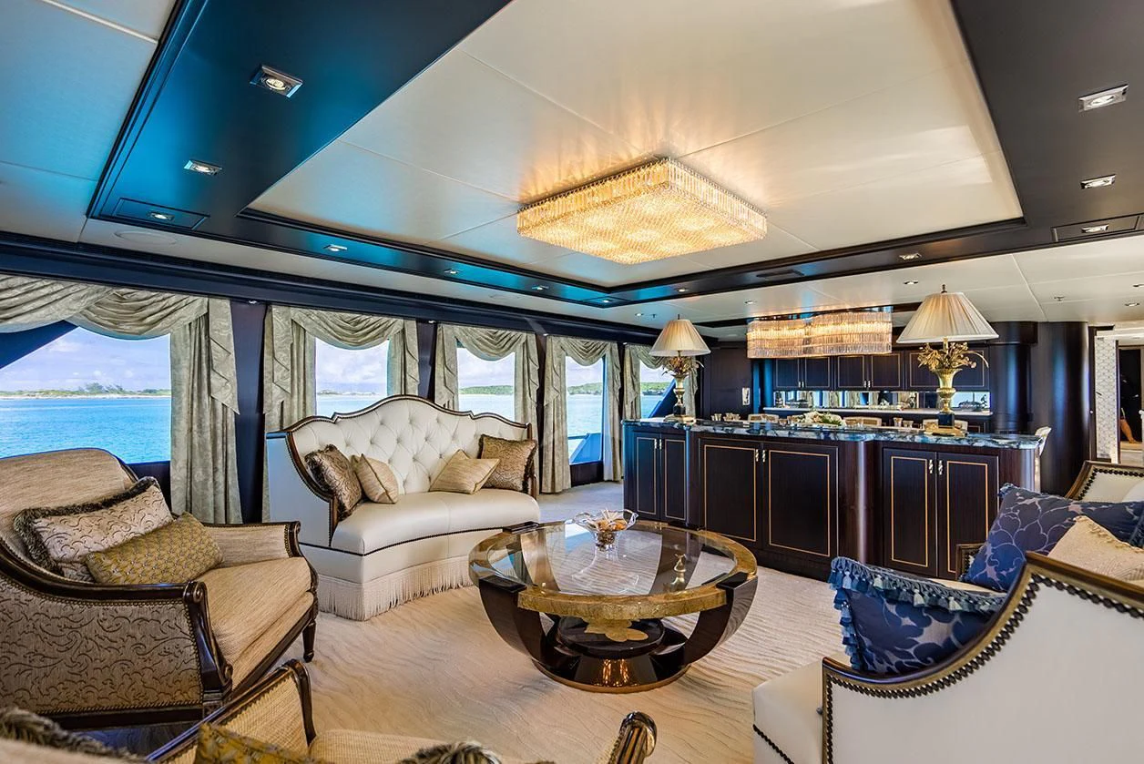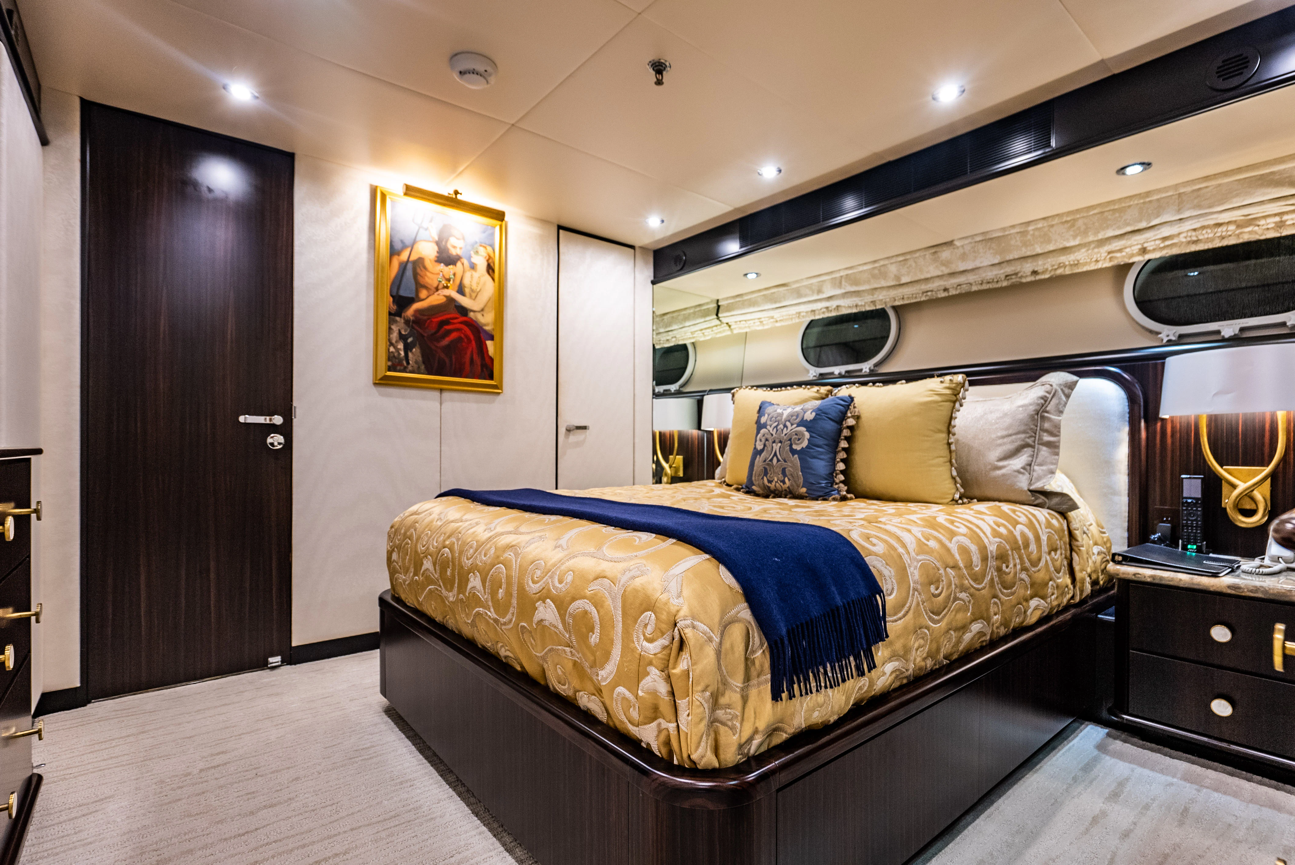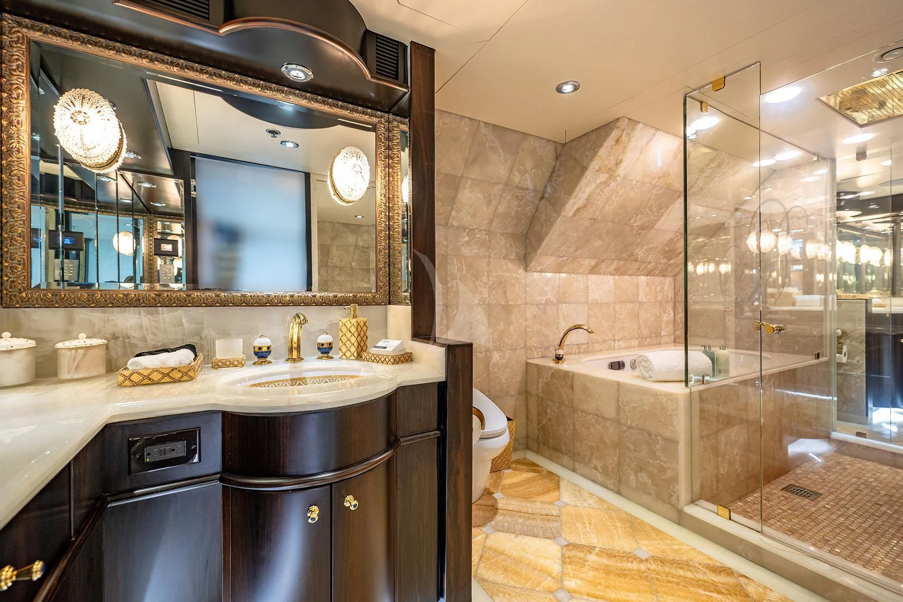 GRADE I’s rich interiors are the work of Destry Darr and feature opulent styling, particularly in the main salon with its richly patterned upholstery in gold, cream and silver, ebony veneers and intricate marble. The generous lounge area is separated from the glass-topped formal dining table by an attractive onyx-covered cabinet. A beautiful chandelier provides added drama while near floor-to-ceiling windows allow natural light to illuminate the beautiful detailing. For more intimate gatherings, privacy blinds can be lowered around the entire salon. The upper deck skylounge is a much more relaxed affair with a stunning bar, sumptuous blue leather sofas and ottomans, and the perfect set up for popcorn and movie nights. There is also a handy games table for friendly competition over cards, A shimmering staircase of wood, glass and chrome connects the floors, highlighted by mother-of-pearl wall coverings to striking effect, and flanked by a full-height bronze statue.