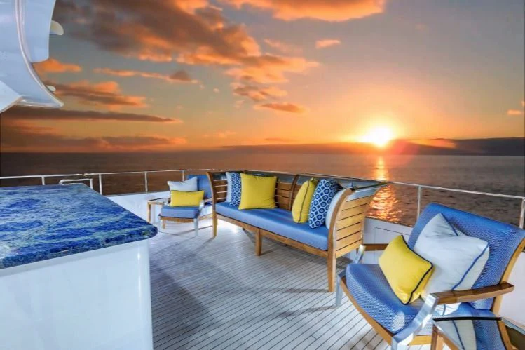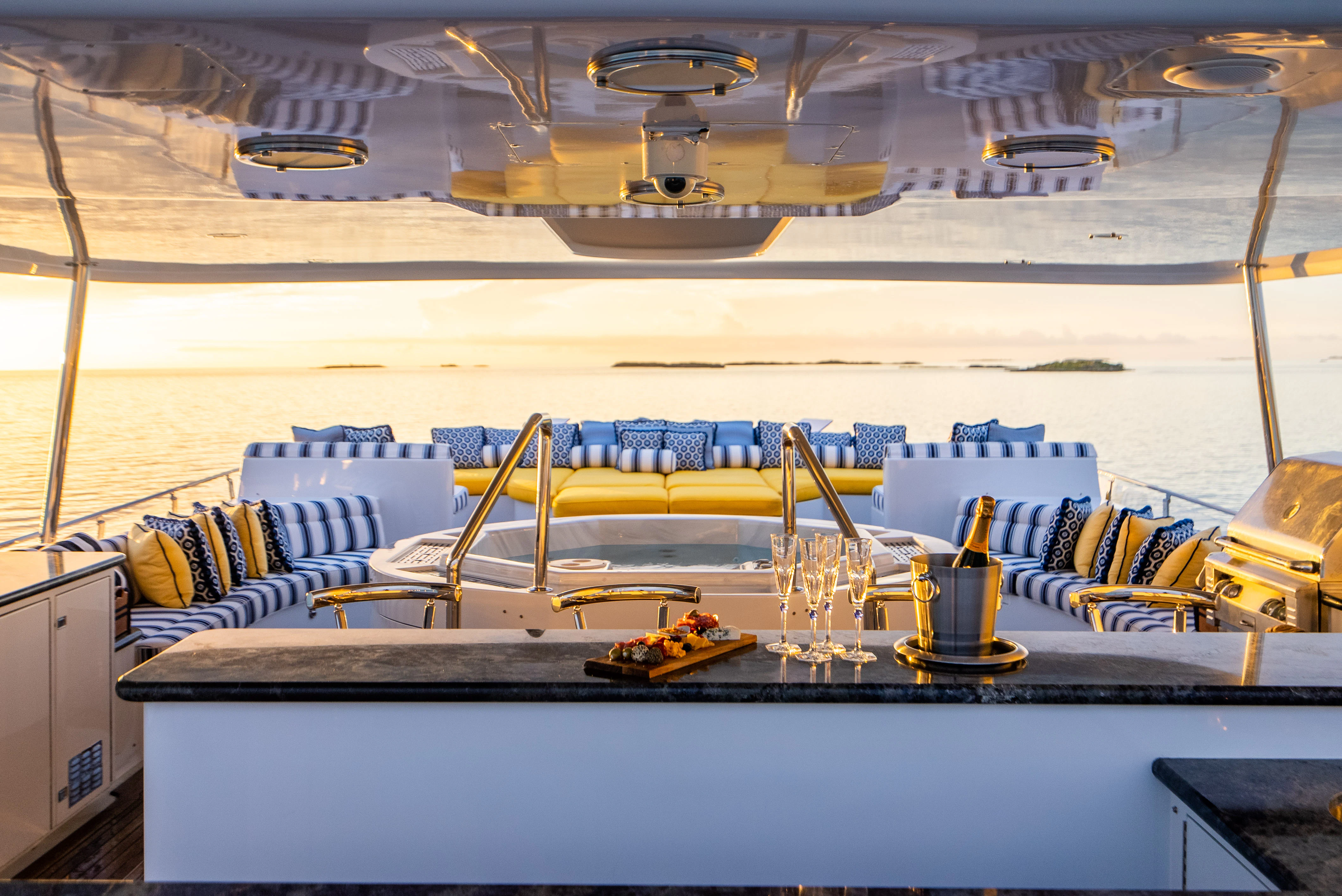 Guests on GRADE I have amazing spaces for relaxing, sunbathing and socializing on her generous decks. Her large sundeck has plenty of room for tanning on the expansive sun pads and there’s a Jacuzzi for cooling dips. The barbecue and dining table make this the perfect spot for casual lunches under the sun. The aft deck has a marble-topped bar for tropical cocktails and a perfectly designed space for dinners alfresco or soirees in port. Yet more space for alfresco dining and entertaining can be found on the upper deck shaded by the sundeck overhang. Once the tender is launched, there’s even space for sun loungers or morning yoga.