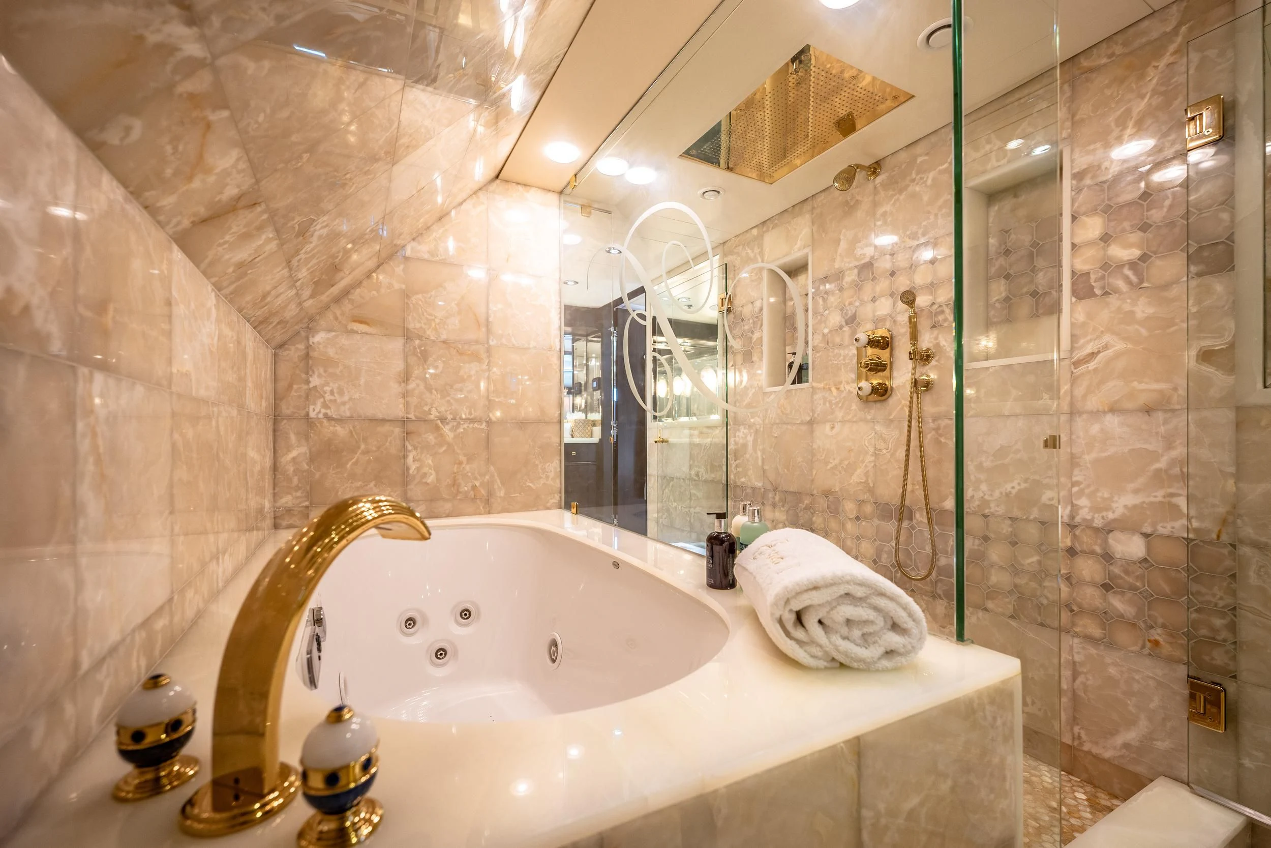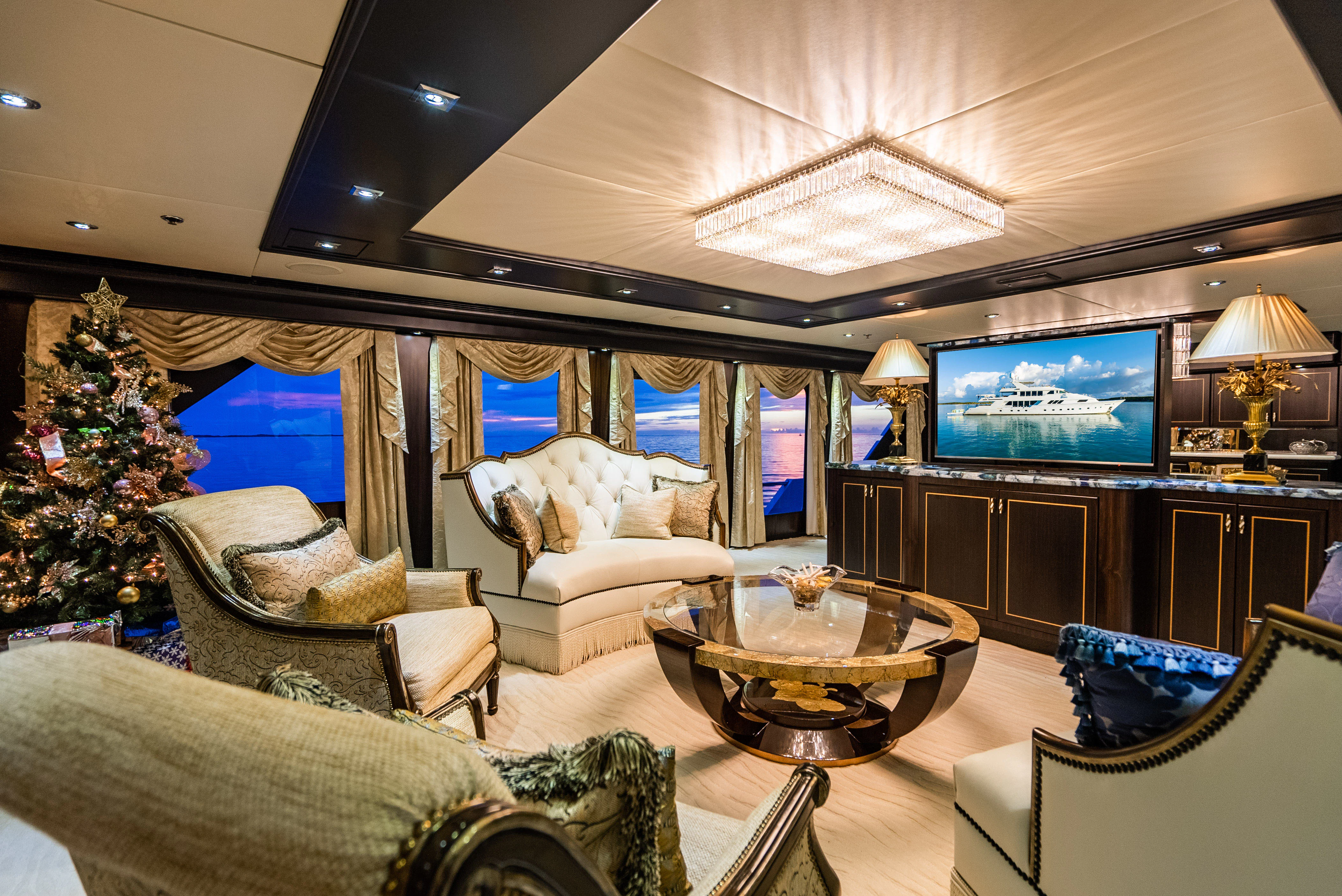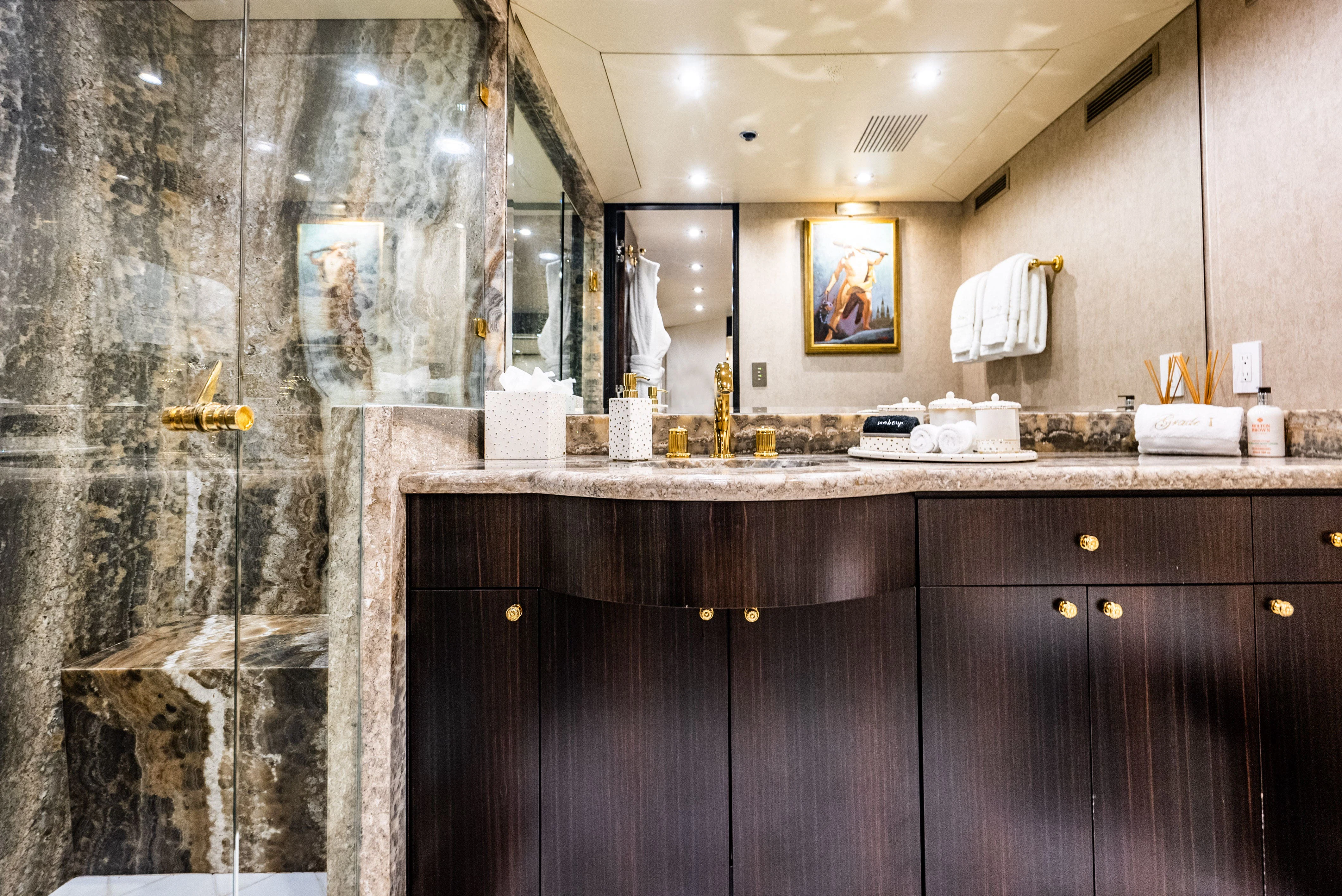 There are six well-appointed staterooms for GRADE I’s 12 guests including a beautiful full beam, main-deck master suite. The décor is sumptuous with lush fabrics in rich cream and gold, and glittering accessories. There is a separate office, his-and-hers en-suite bathroom with a Jacuzzi and huge central rain shower. On the lower deck GRADE I has an additional five staterooms, four with queen-size beds and one twin all of which feature beautiful en-suite bathrooms and state-of-the-art entertainment systems.