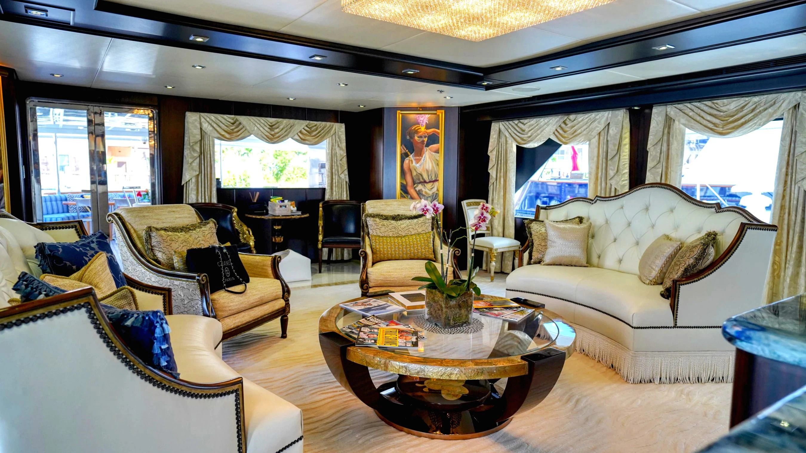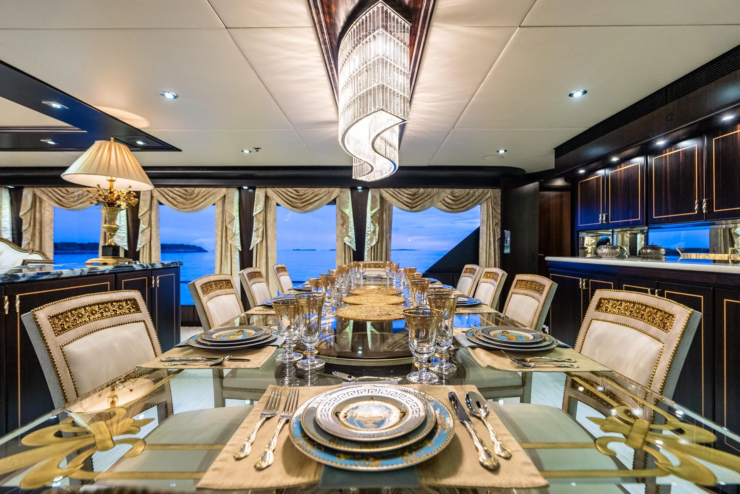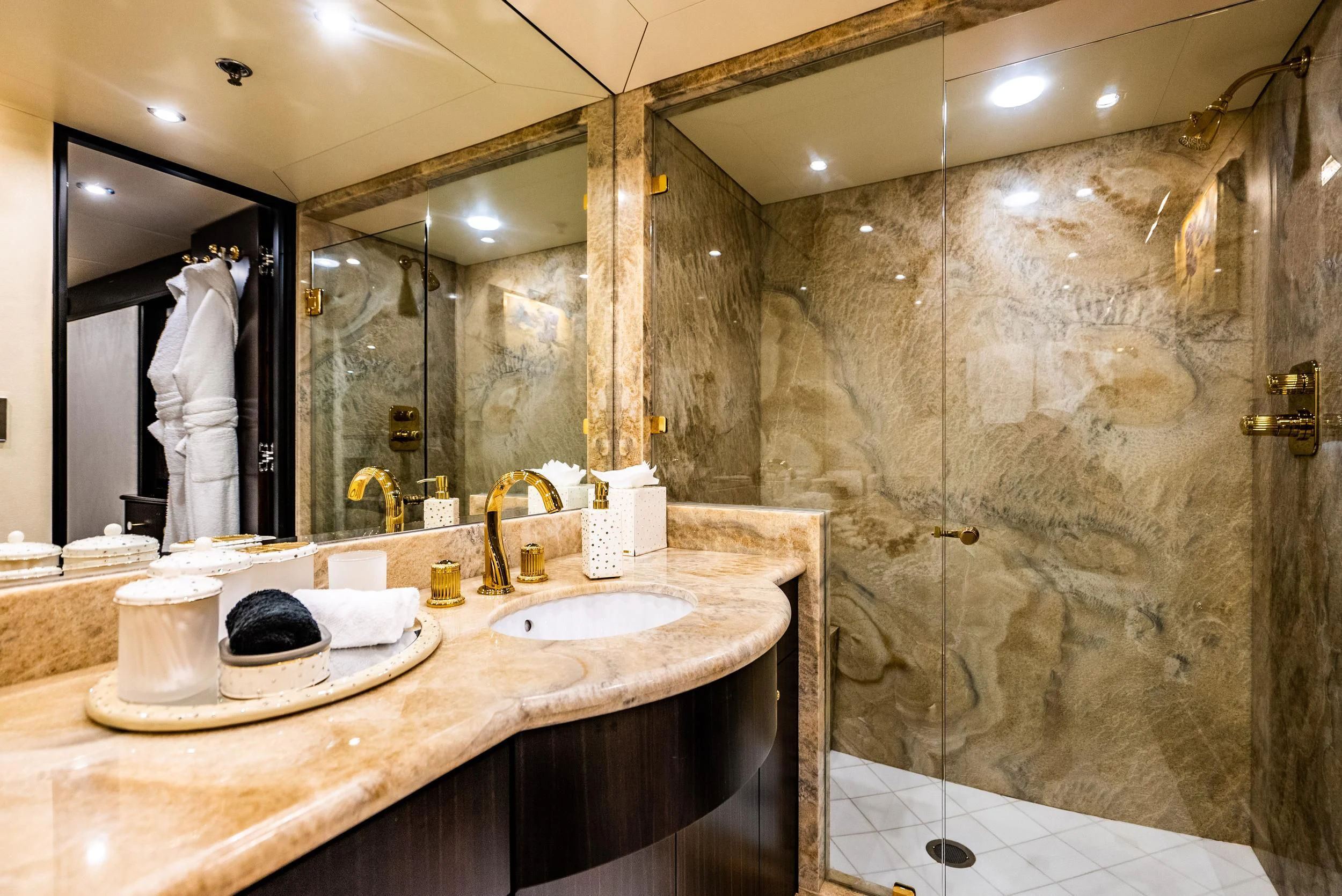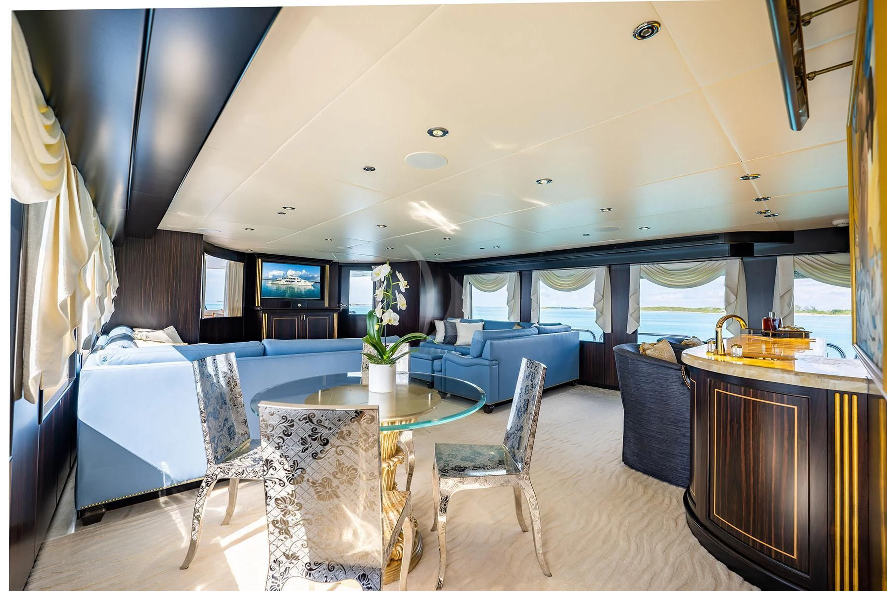 There are six well-appointed staterooms for GRADE I’s 12 guests including a beautiful full beam, main-deck master suite. The décor is sumptuous with lush fabrics in rich cream and gold, and glittering accessories. There is a separate office, his-and-hers en-suite bathroom with a Jacuzzi and huge central rain shower. On the lower deck GRADE I has an additional five staterooms, four with queen-size beds and one twin all of which feature beautiful en-suite bathrooms and state-of-the-art entertainment systems.