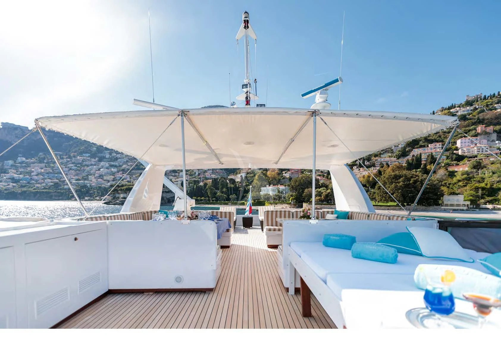 There is a myriad of choices for relaxing and dining outdoors across HEMILEA's two large decks. The exterior decor mirrors the interiors with striped upholstery in caramel and cream and cheerful aquamarine accents. On the main deck, is space for elegant alfresco dining with easy access to the full bar found in the salon. A few steps down is the swim platform, where guests can spend time relaxing by the water's edge and have easy access to charter yacht HEMILEA's arsenal of toys. The sundeck has been beautifully designed with built in seating, sunpads and sun loungers in addition to a table for casual lunches and dinners.