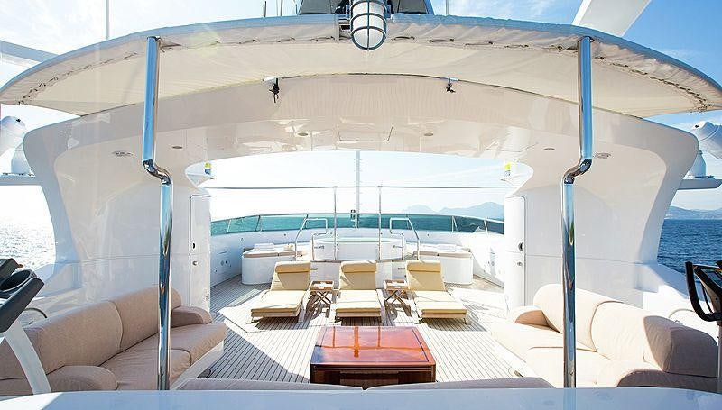 HOLIDAY’s generous exterior deck space has been thoughtfully designed for luxurious outdoor living. There are numerous places for entertaining, dining and soaking up the sun. the aft deck is a great place for relaxed conversation or curling up with a book as the beautiful scenery unfolds. There are comfortable sofas and chairs and space for casual dining. It will be hard to drag yourself away from the spacious sun deck. The large Jacuzzi is surrounded by sun pads and perfect for a relaxing dip and sunbathing. There are sun loungers and shaded sofas for relaxing, a bar for cocktails and a table for dining while cooled by the Mediterranean breezes. There’s also space for gym equipment for an open-air workout. One of HOLIDAY’s most spectacular spaces is the lounge area on the bow, accessed by side walkways from the main deck. There’s nothing better than watching the sunset here with glass in hand and beautiful horizons ahead.