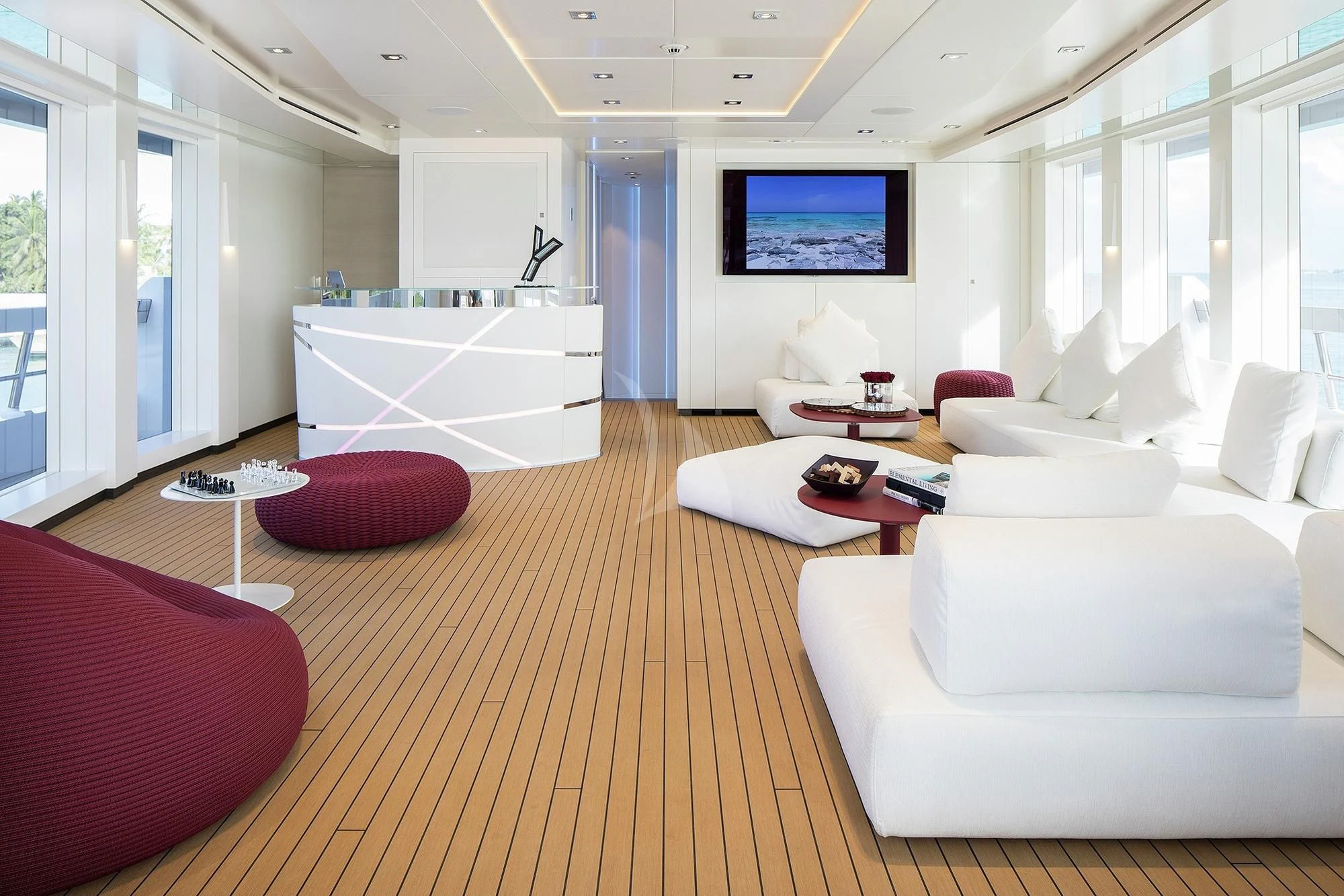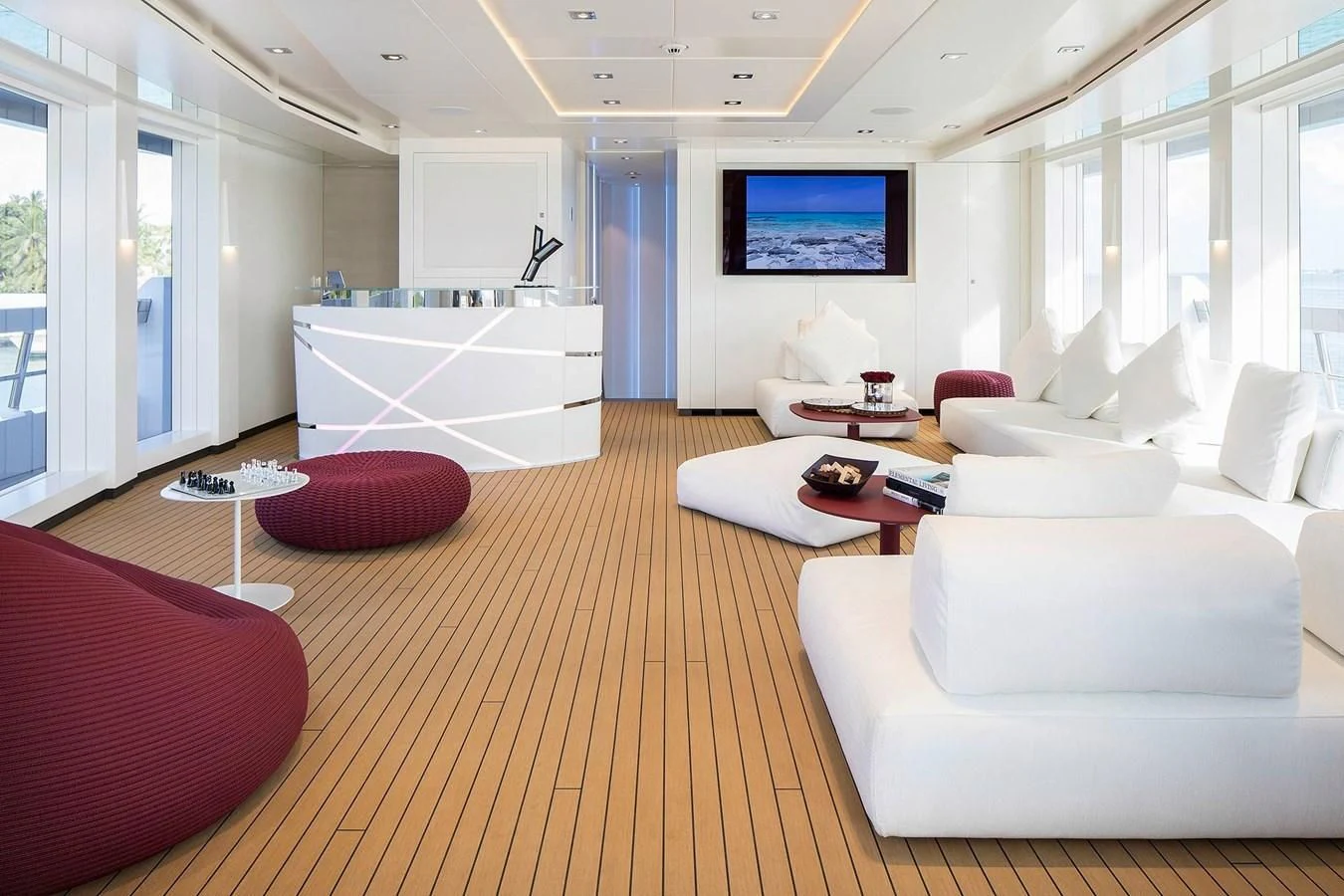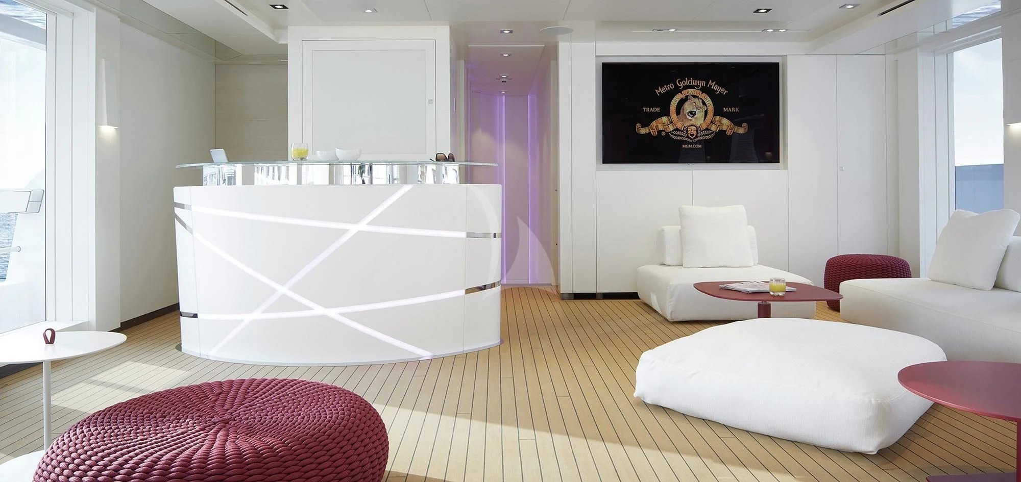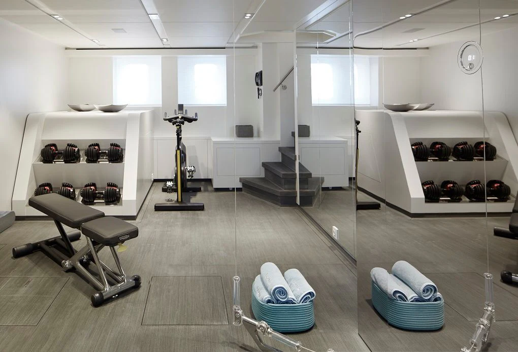 The interior spaces of HOME are sleek and contemporary. A light and airy color palette with modern furnishings, pops of color and unique art are found throughout the yacht. She is both elegant and comfortable. She offers a variety of entertainment amenities. For guests interested in staying fit while aboard, the yacht features a full gym on the lower deck.