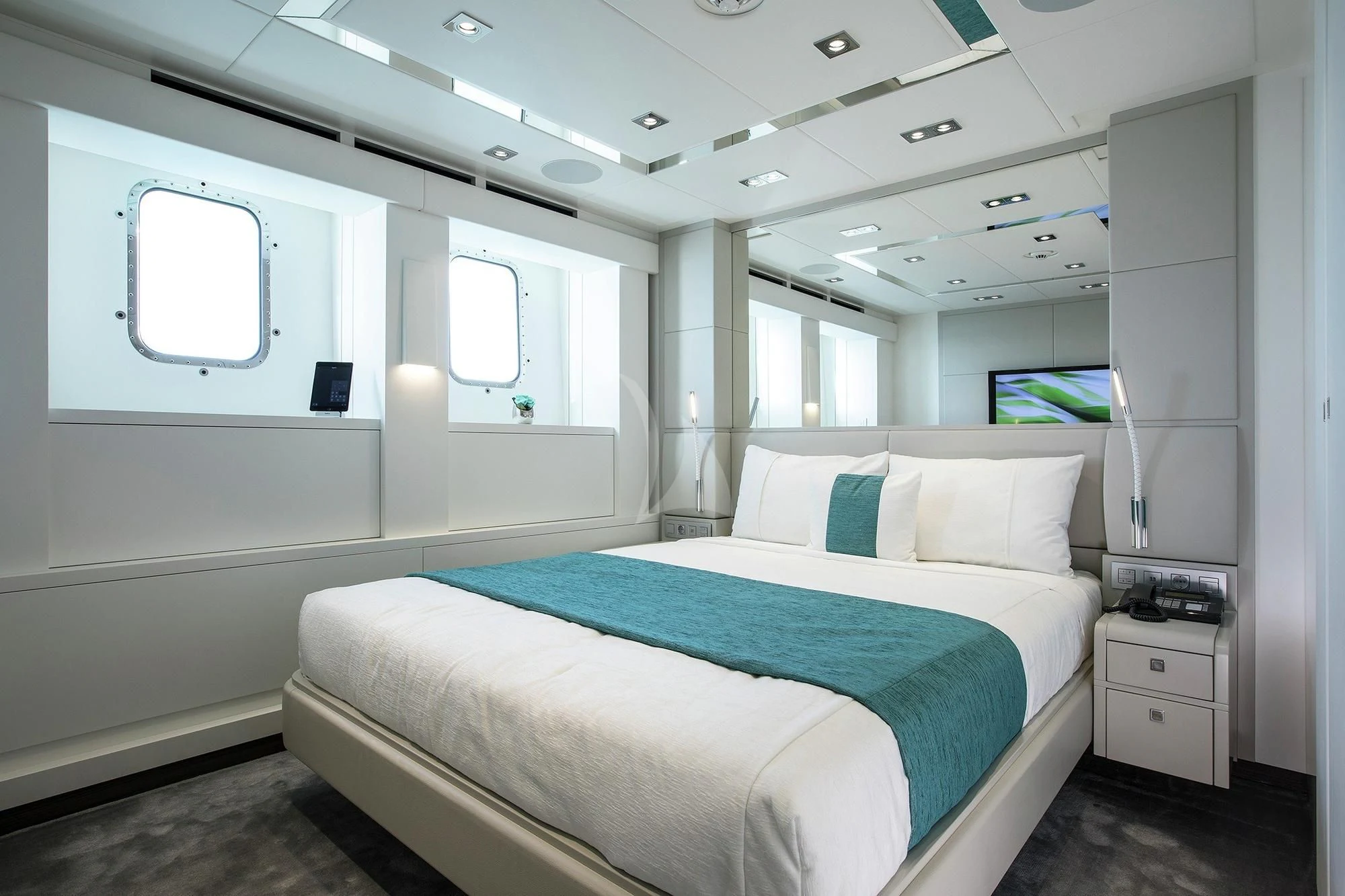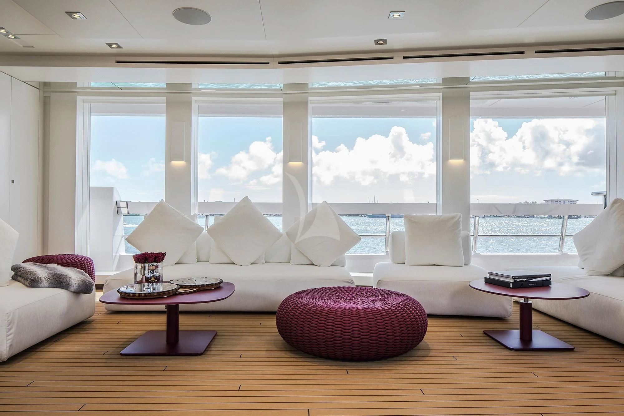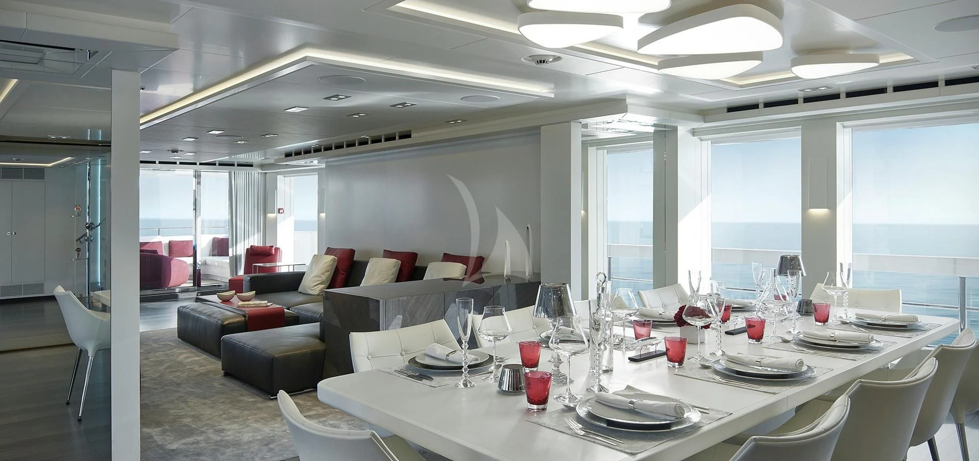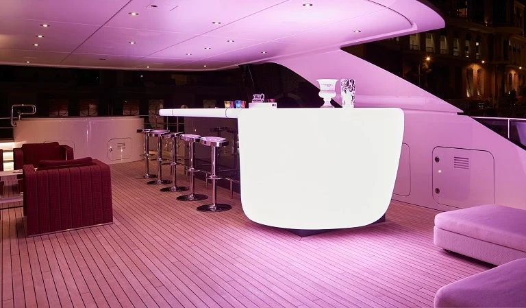 The interior spaces of HOME are sleek and contemporary. A light and airy color palette with modern furnishings, pops of color and unique art are found throughout the yacht. She is both elegant and comfortable. She offers a variety of entertainment amenities. For guests interested in staying fit while aboard, the yacht features a full gym on the lower deck.