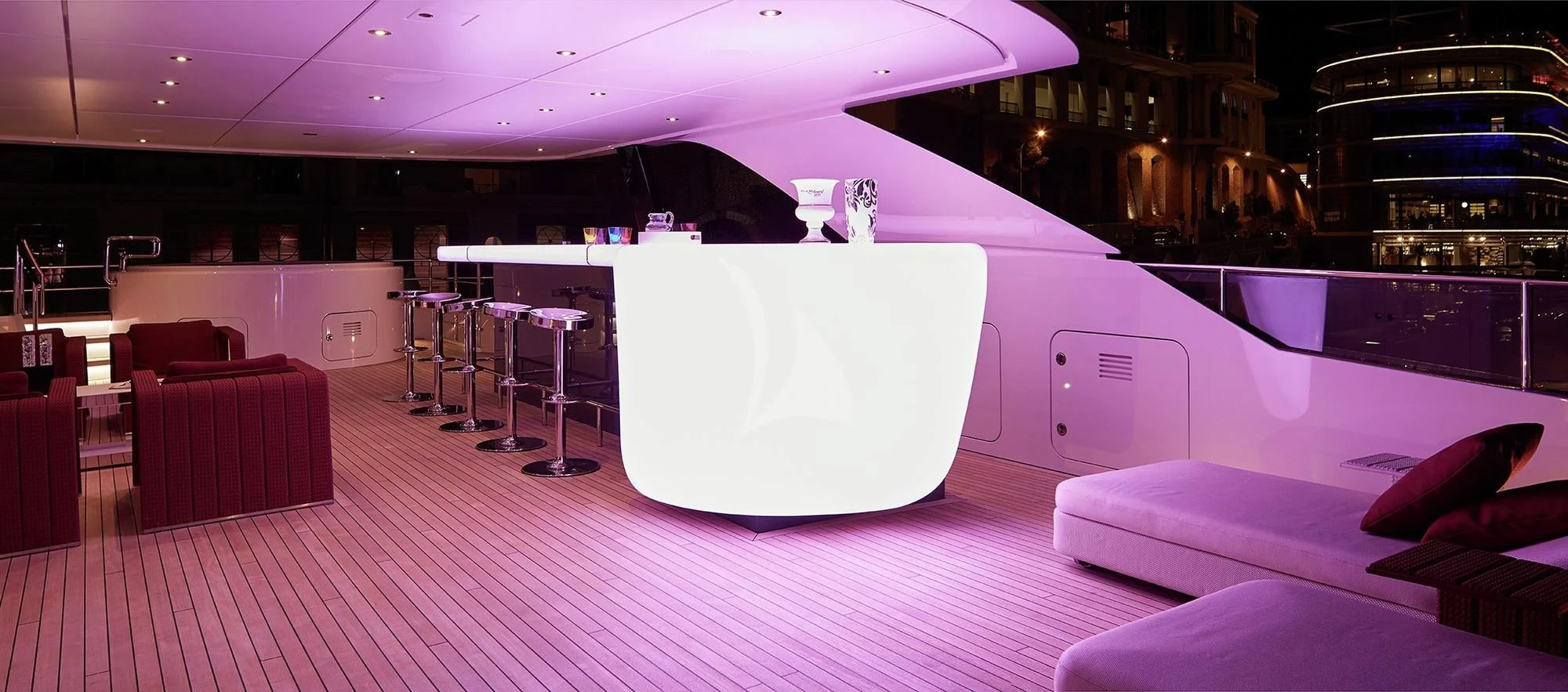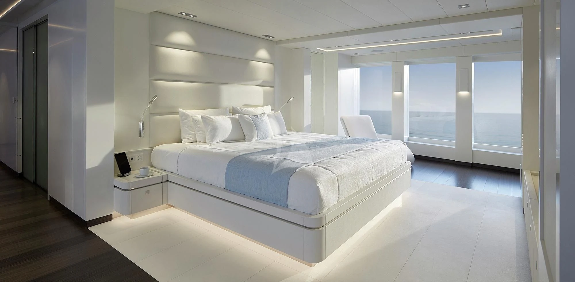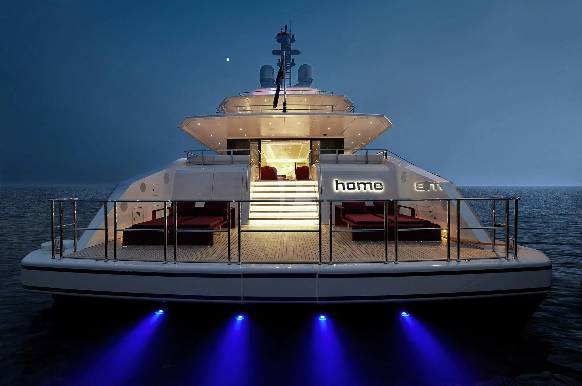 HOME welcomes up to 12 guests in six lavish staterooms. She has a full-beam master suite with an owner’s office, a VIP stateroom, two doubles and two twin cabins. Each stateroom features an en-suite bathroom and designer bath goods.