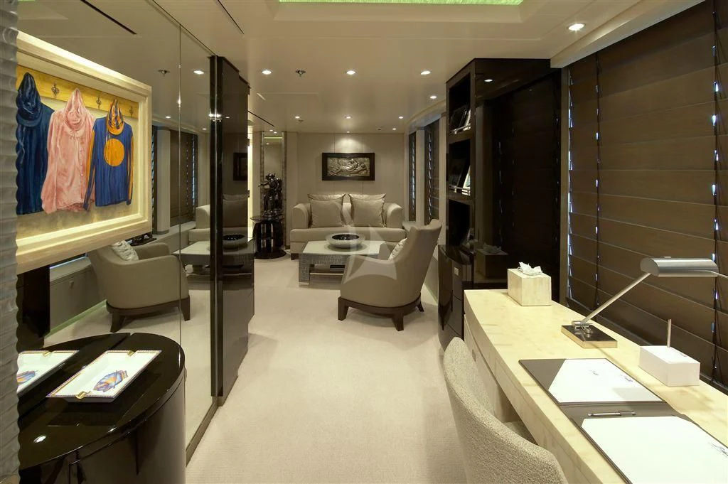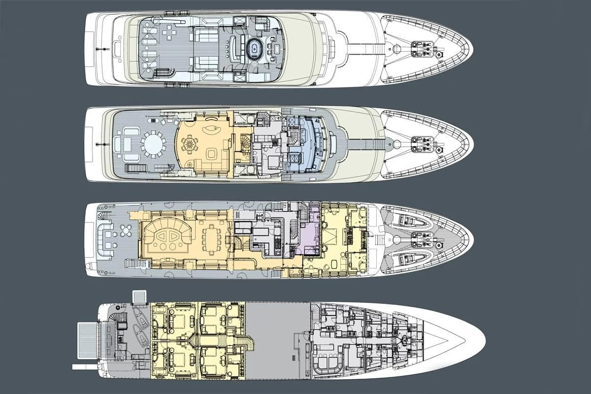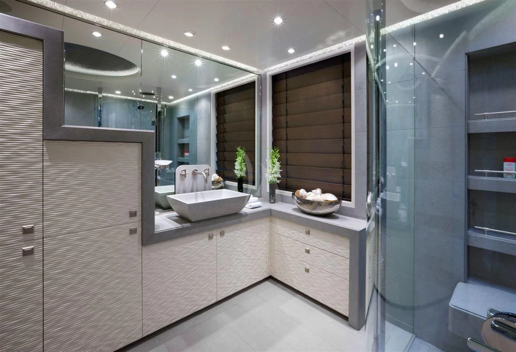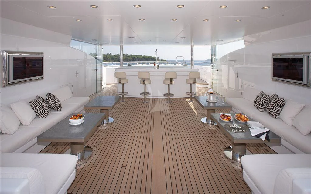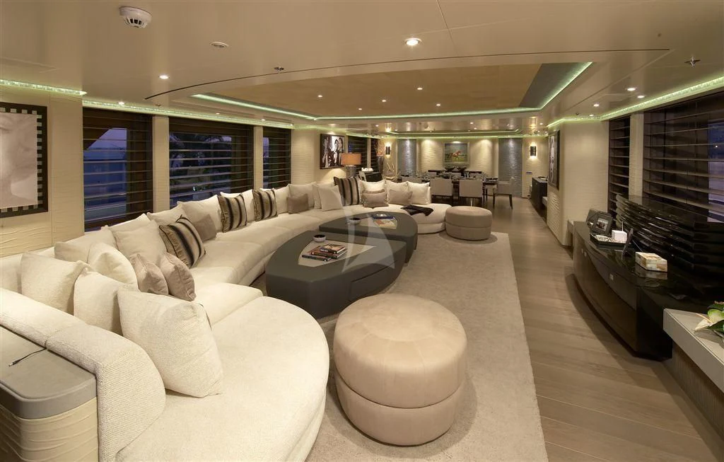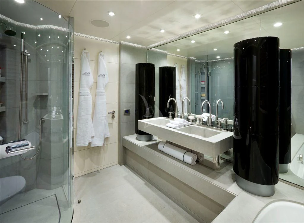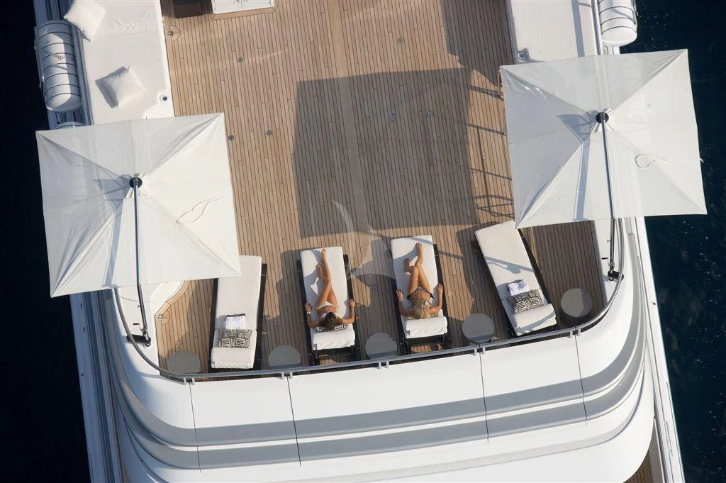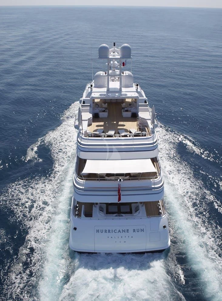 HURRICANE RUN’s interior is stylish and modern, featuring a timeless and sophisticated monochrome décor. Rich materials and textures combine to significant effect. She has vast curves of couches, elegant dining spaces, and multiple areas for relaxation. Her staterooms comprise a master, two doubles, two twins, and a single. Out on deck, the yacht offers an exceptional lifestyle in the sun. Relax in the Jacuzzi and enjoy the incredible views, or dive into the water from the drop-down swim platform.