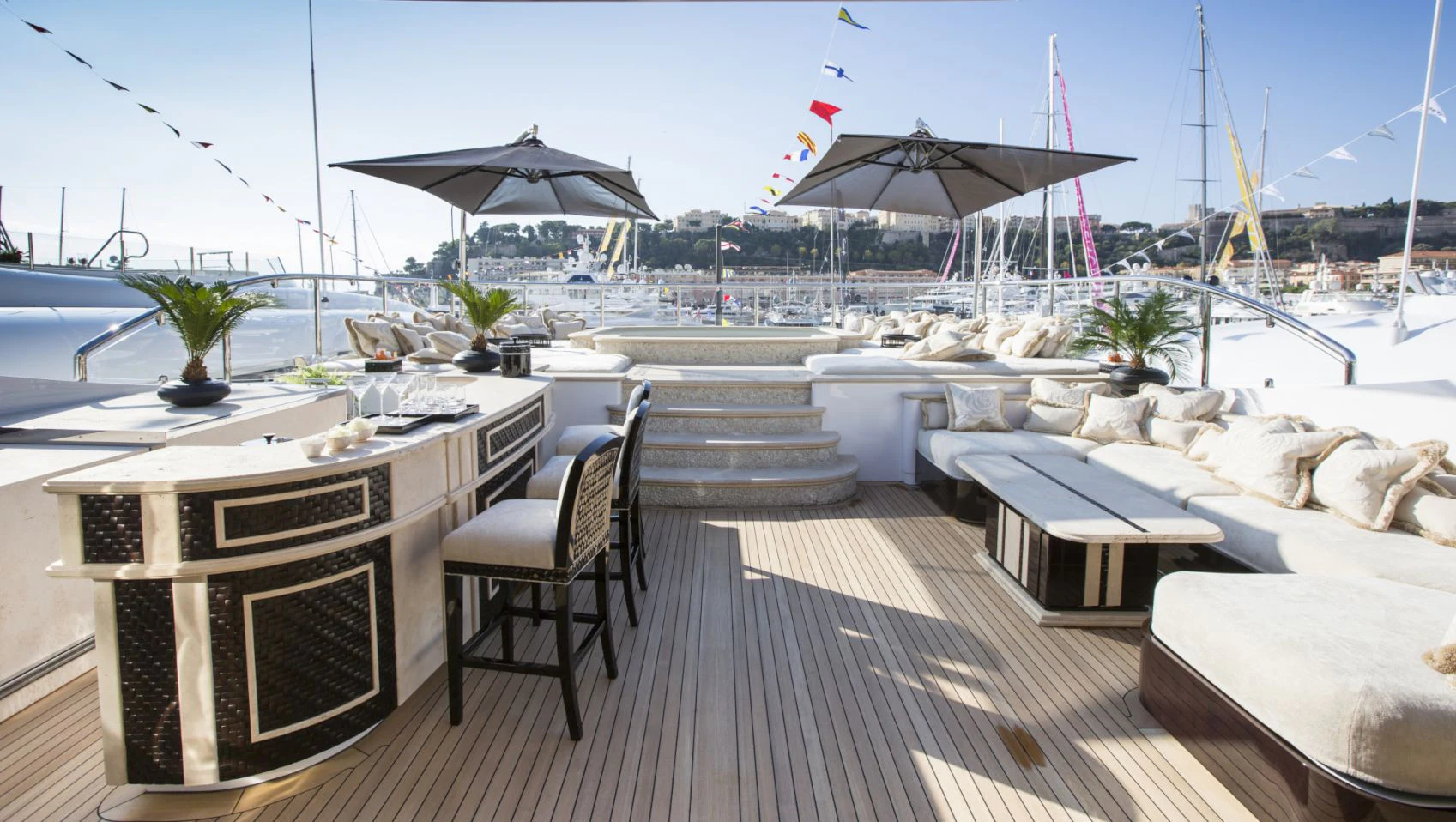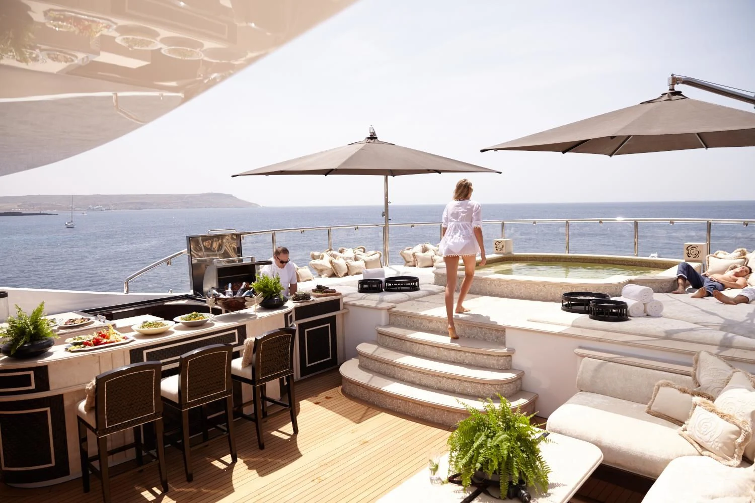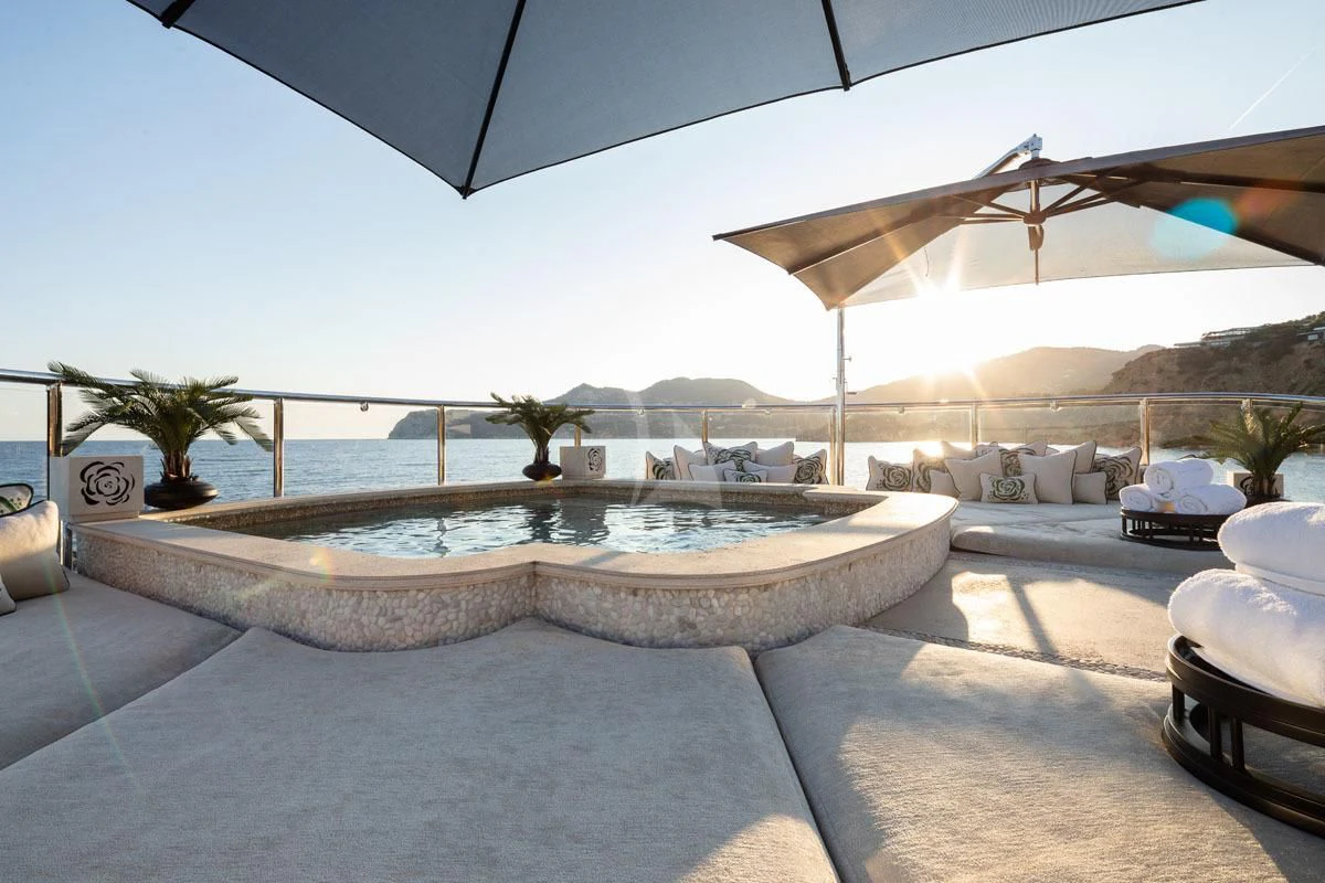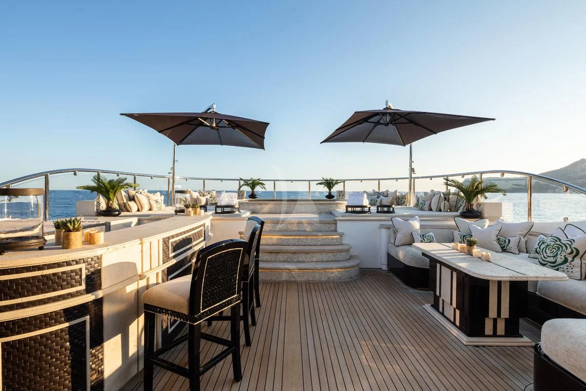 The luxury yacht’s alluring outdoor living areas will have charter guests relishing the alfresco lifestyle from dawn to well past dusk. ILLUSION V’s impressive, expansive sundeck offers unhindered views of the charter destination, a Jacuzzi flanked by sunpads, ample lounge seating, a bar and dining — which, with its clear doors, allows for dining in all weather conditions. Additionally, the sundeck can turn into a cinema for a movie under the stars. There also is alfresco dining found on the skylounge aft and an additional lounging area on the main deck aft. Furthermore, charter guests will enjoy the yacht’s wide array of water toys and lounging by the water’s edge at the beach club.