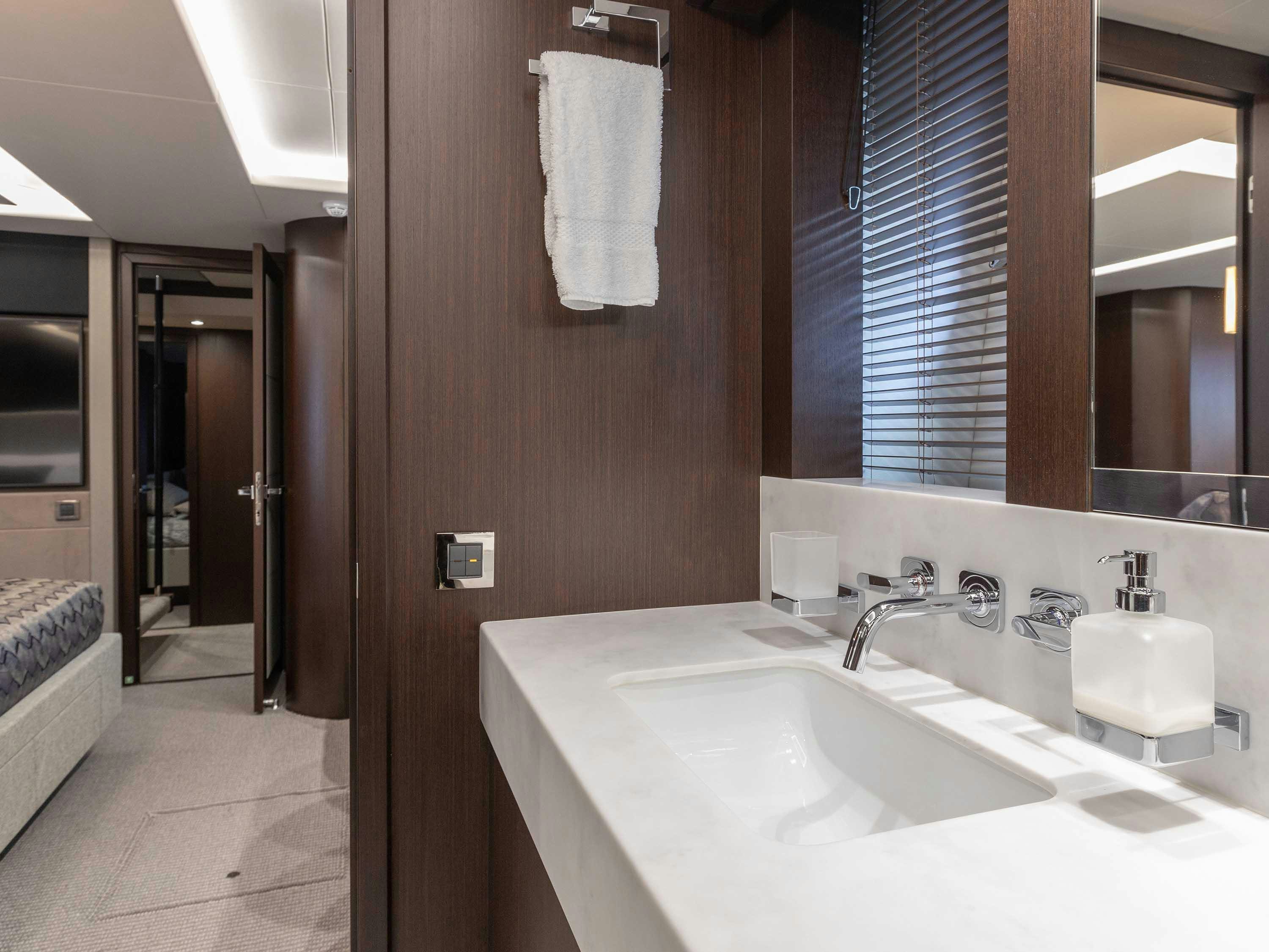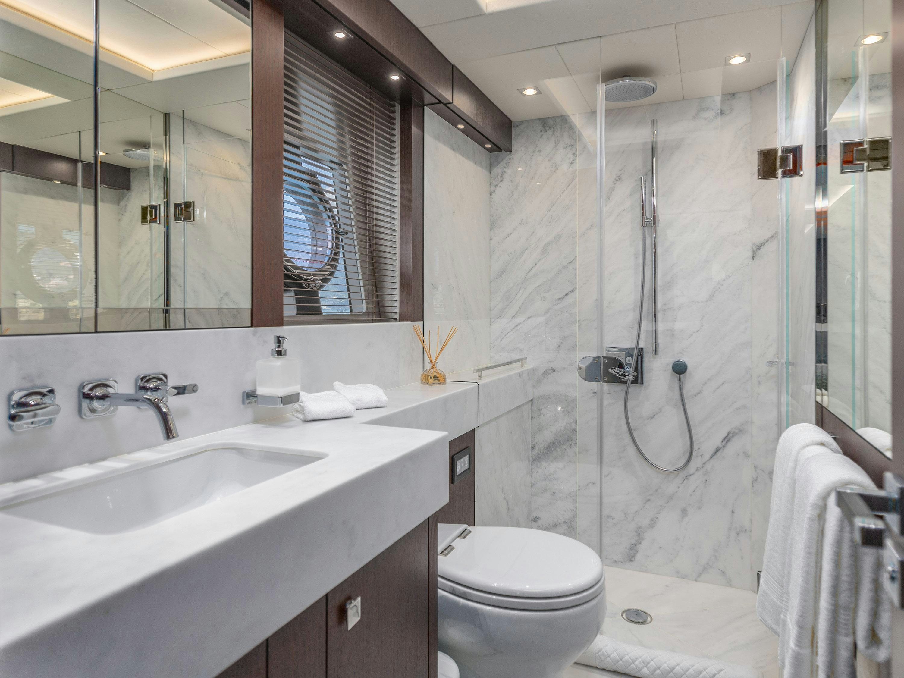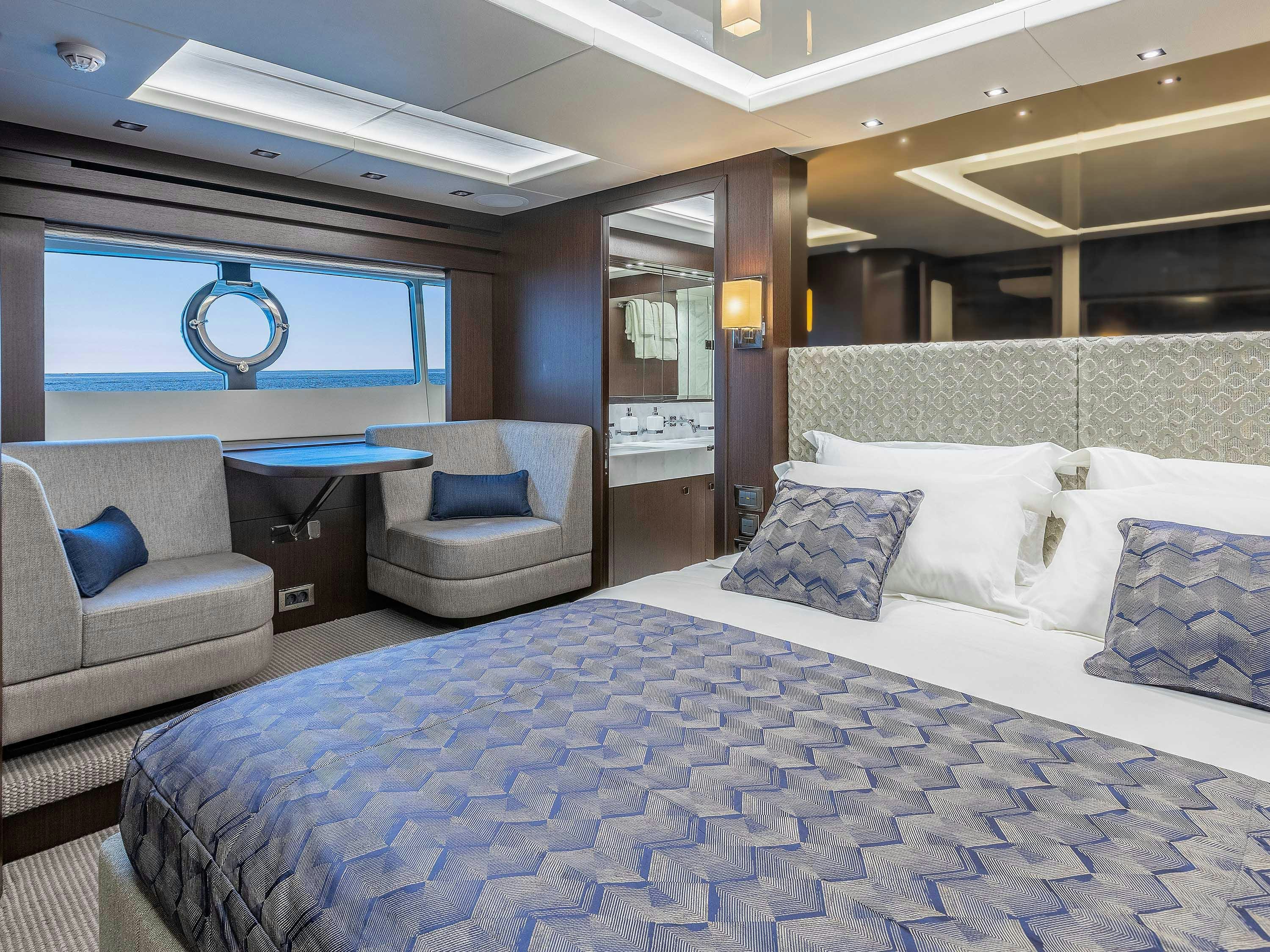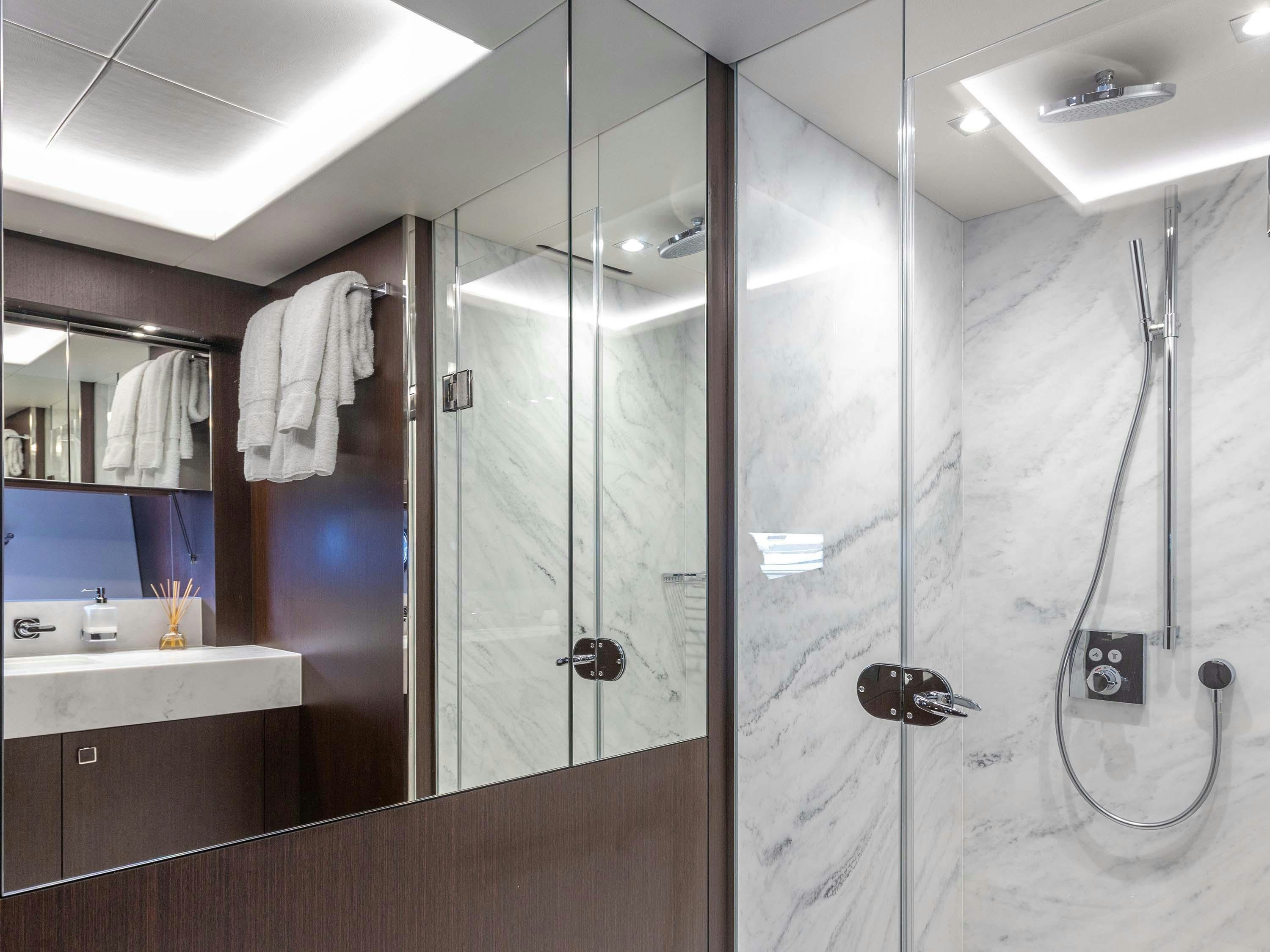 The charter yacht can host up to eight guests in four beautiful staterooms. INSOMNIA’s guests can expect restful nights in the comfort of the finest furnishings and linens. The master stateroom features a king-size bed, walk-in wardrobe and a small seating area and vanity. The VIP cabin can be observed as a second master because of the king-size bed and similar spaciousness to the master suite. On the lower deck sit two twin cabins in which the single beds can be pushed together to form a double bed when necessary. All of INSOMNIA’s staterooms are complemented by en-suite bathrooms and state-of-the-art entertainment systems. A dedicated crew of four ensures each guest’s stay onboard is to their exact liking, from the meals prepared to the activities arranged.