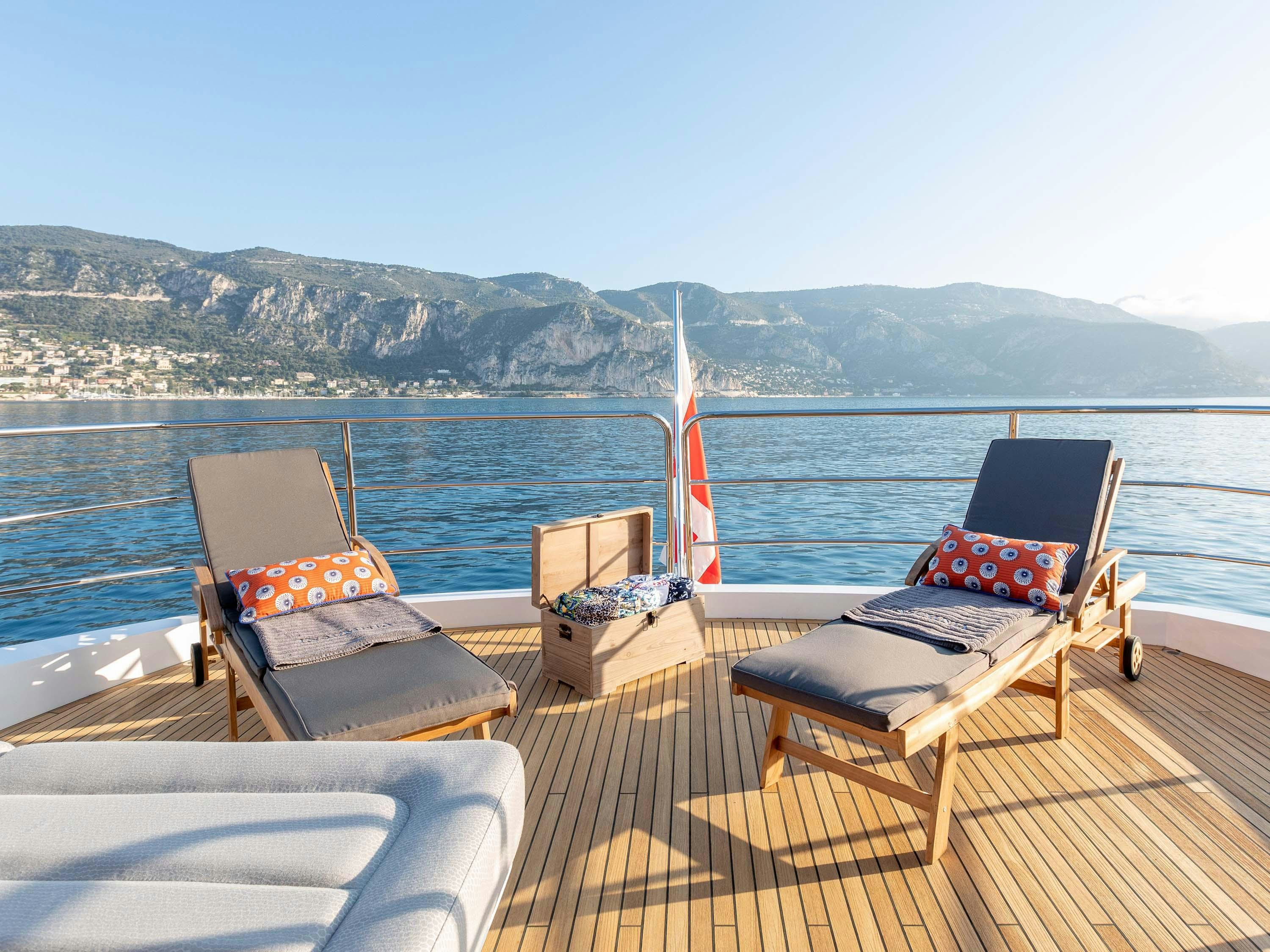 INSOMNIA’s exterior is made up of solid and clean lines giving her a sophisticated but speedy look. The aft deck offers a casual space to enjoy meals when guests prefer to dine alfresco. The sundeck is the social hub of the yacht with a large wet bar and Barbeque. The seating area forward gives guests the ultimate unobstructed view of the destination ahead. For sunbathers, the oversized sunbed offers uninterrupted relaxation. Whether the inflatable slide or Seabobs, guests who charter onboard INSOMNIA will never be without entertainment.