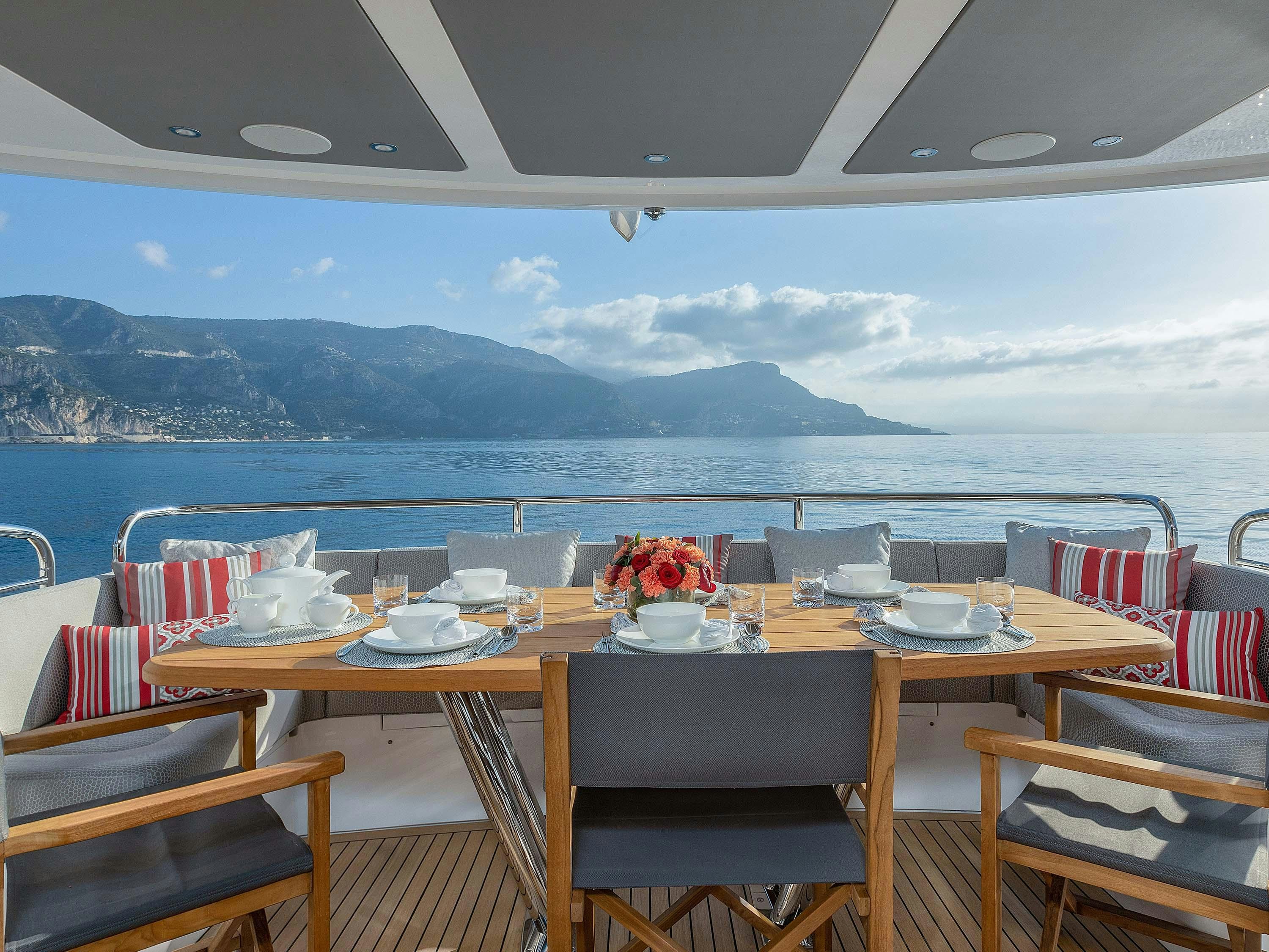 The main salon is an open space, generously engulfed by natural light courtesy of the massive windows. When indoor dining is desired, the interior formal dining area can seat eight guests comfortably. Forward on the main deck is a well-equipped galley and more seating, making for an excellent space to socialize over a coffee or cocktail.