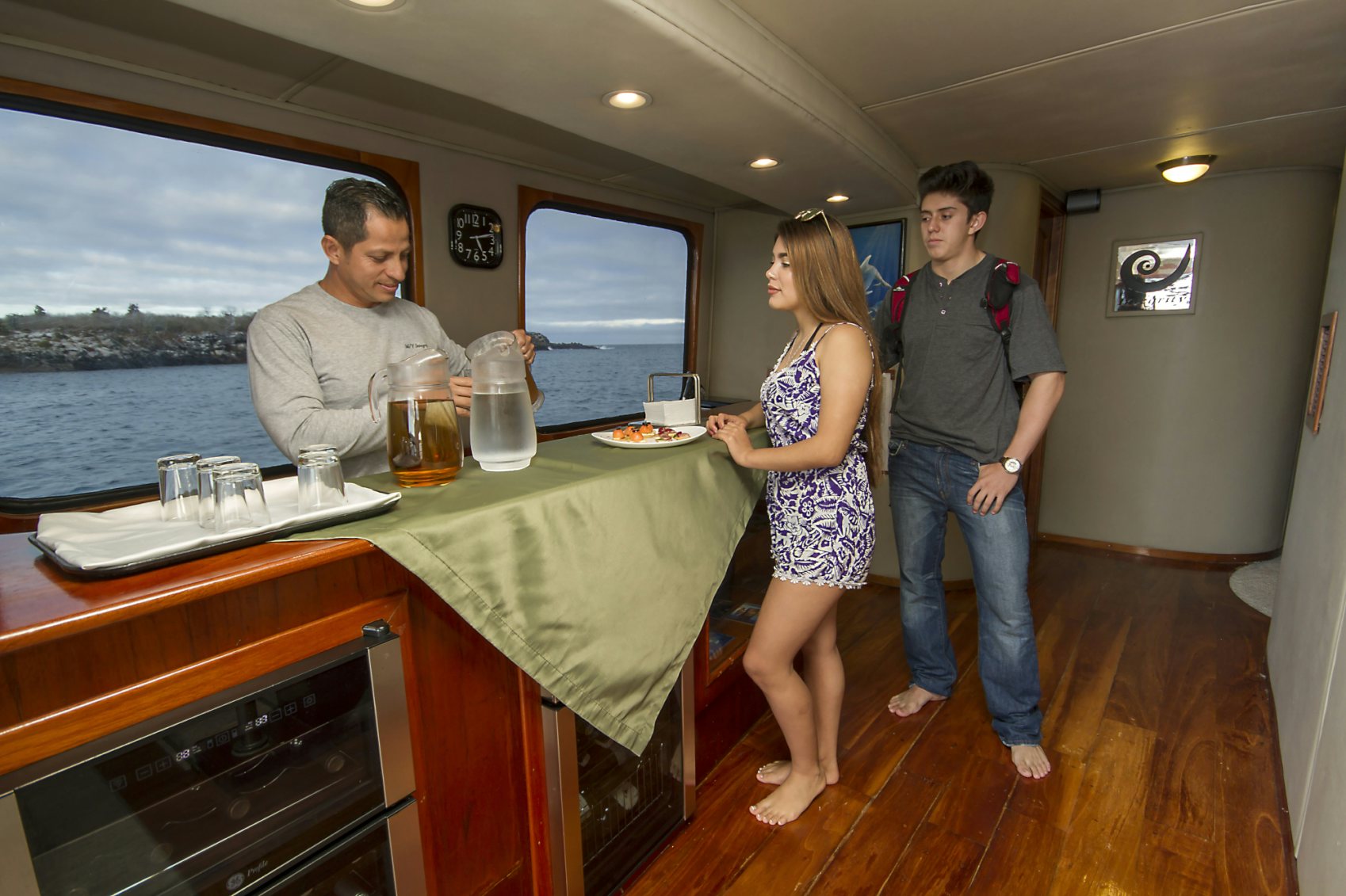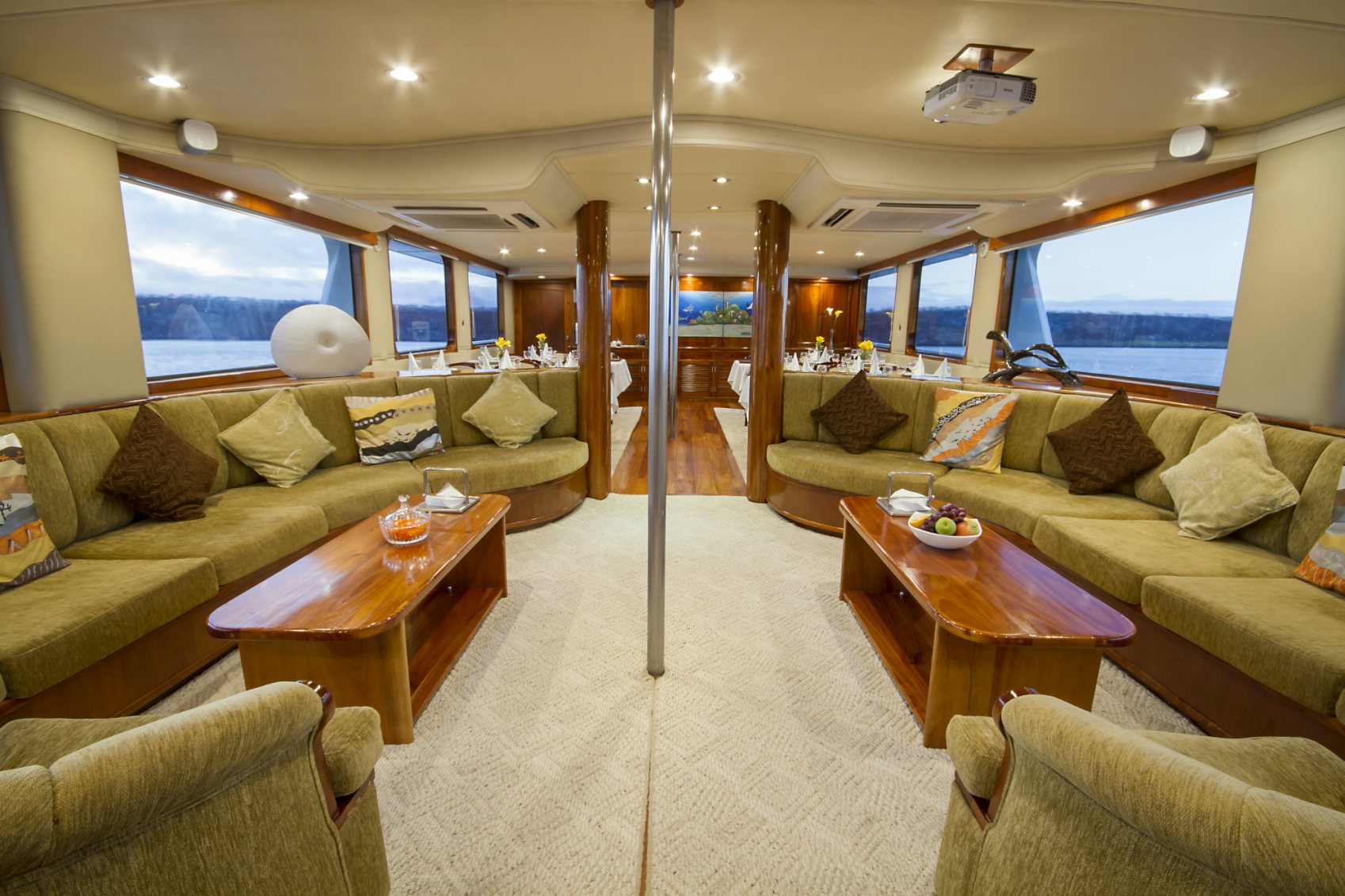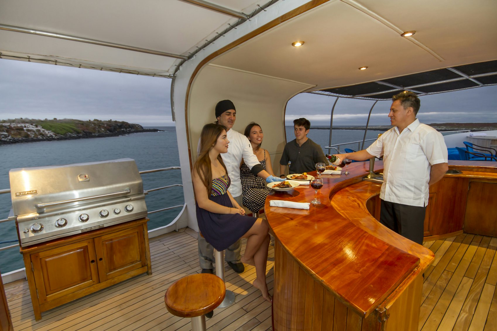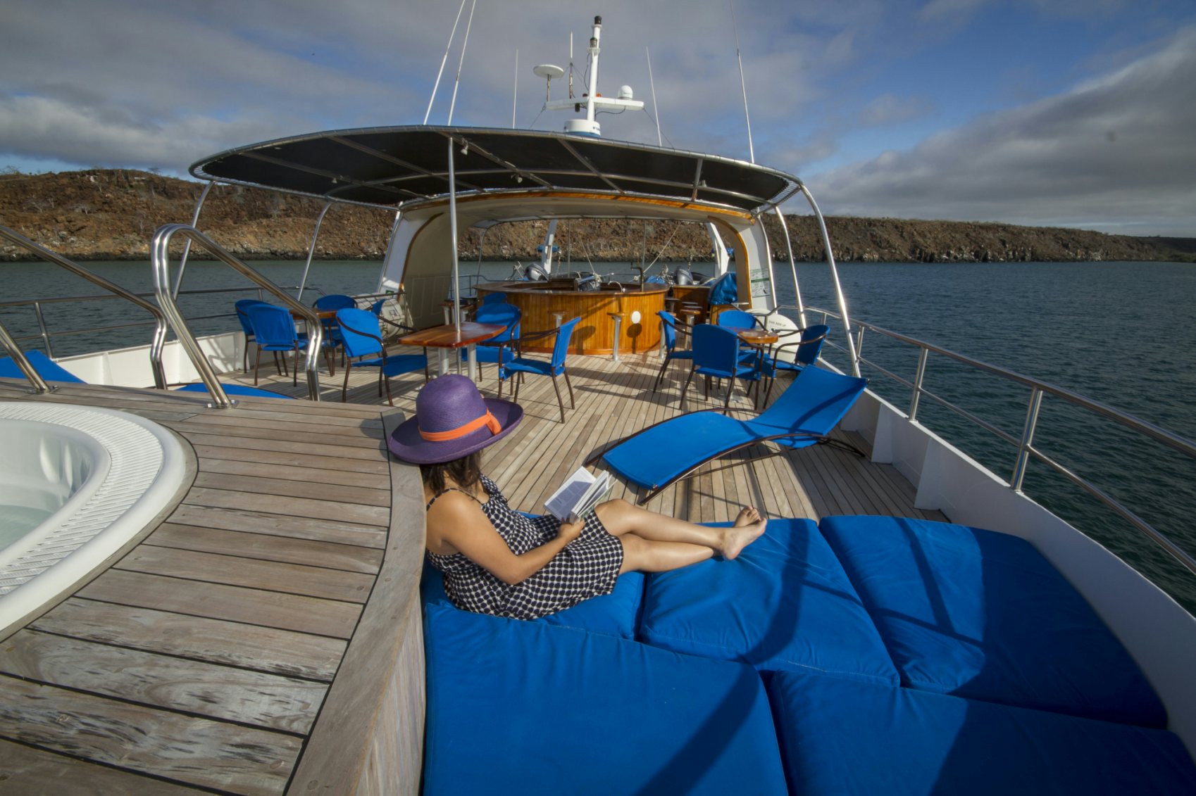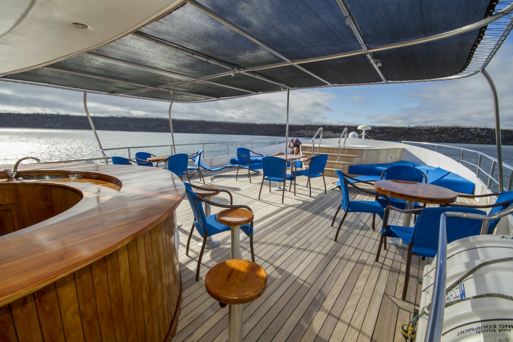 Nine guests cabins comfortably accommodate 16 guests in the stunning Galapagos Islands. Pop off the swim platform and get into one of yacht INTEGRITY’s eight two-person kayaks to get up close and personal with some of the incredible wildlife in the area. You’ll have a front-row seat to see whales, dolphins, fur seals, marine iguanas, and frigate birds from INTEGRITY yacht’s sun deck, complete with Jacuzzi and covered bar area.