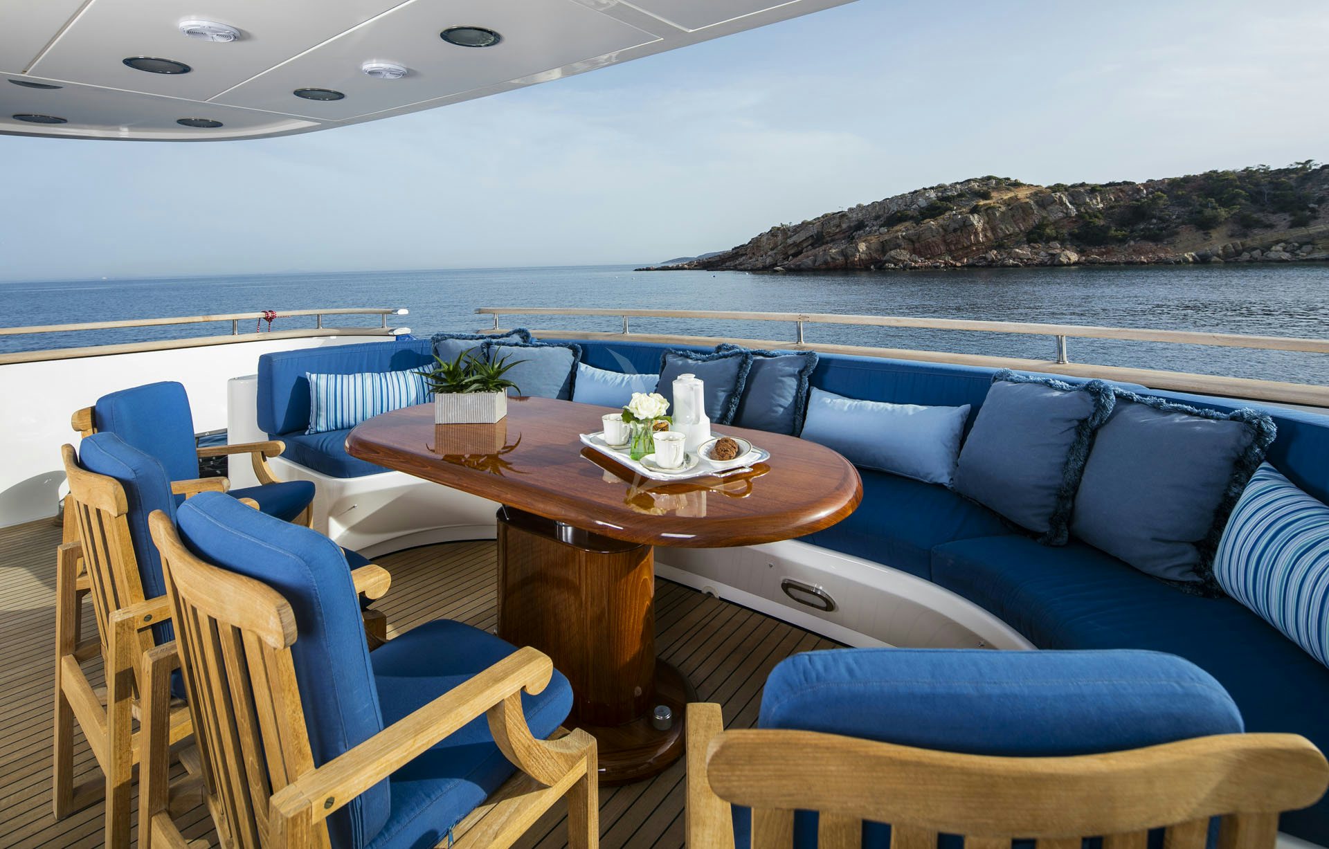 The 138-foot (42.06m) JAAN was a collaboration between Intermarine SPA and Italy’s Studio Giorgio Vafiadis. She is a GRP-hulled semi-displacement yacht, built in 1997, that welcomes up to 12 guests on board for luxury charters in the East Mediterranean. As well as the popular islands and coastline of Greece and Turkey, she also travels to Croatia and Montenegro where guests can enjoy some of the most scenic landscapes and idyllic waters while enjoying every comfort and luxury on board. Regular refits over the years have left JAAN in excellent condition. Her most recent updates came in 2017 and 2018 when audio-visual equipment, water toys and some of the carpets and upholstery were replaced.