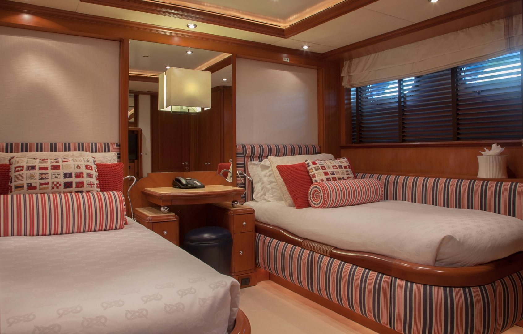 Renowned interior designer François Zuretti has used neutral tones combined with limed oak and cherry wood to create warm, elegant, understated spaces with a contemporary feel. Fabulous living areas are the epitome of comfort and sophistication. The accommodations are luxurious with curved lines, soft lighting and rich fabrics from the likes of Mulberry, Burberry, Ralph Lauren, Roche et Bobois and Versace. JO sleeps up to 12 in six exceptional staterooms including the impressive full-beam master stateroom with a private office and opulent his-and-hers en-suite. There are a further two double staterooms and two twins, as well as a multipurpose games room on the upper deck that can be converted into a double stateroom with an en-suite shower if required.