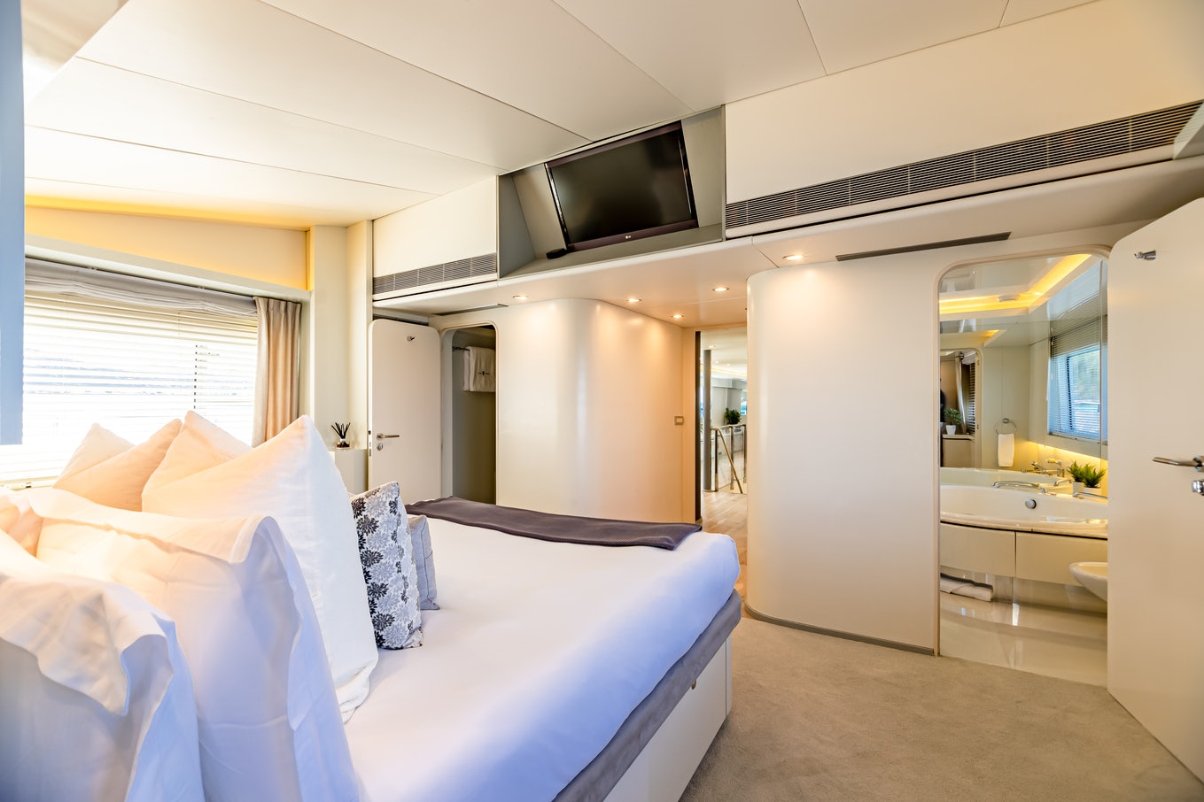 Launched in 1987 by her renowned Dutch builder, LIONSHARE features traditional exterior lines, but her welcoming interior is contemporary and beautiful thanks to a multitude of refits throughout her life. Her most recent in 2022 reinvigorated this stunning motor yacht for charter. This refit radically revolutionized her interior spaces. The main salon was further reconfigured to open up and maximize her space. The yacht’s floors were redone with soft light-grey wood, her headliners were replaced and the walls were re-painted ensuring a completely refreshed atmosphere. The 50-inch pop-up TV was moved to starboard to optimize the flow of the space. Luxury charter yacht LIONSHARE received further updates in 2022 with all new light, bright and contemporary furnishings. Her neutral color palette features bright pops of blue that pay homage to her cruising grounds. LIONSHARE’s new 10-person dining salon configuration is excellent for enjoying mouthwatering meals onboard.