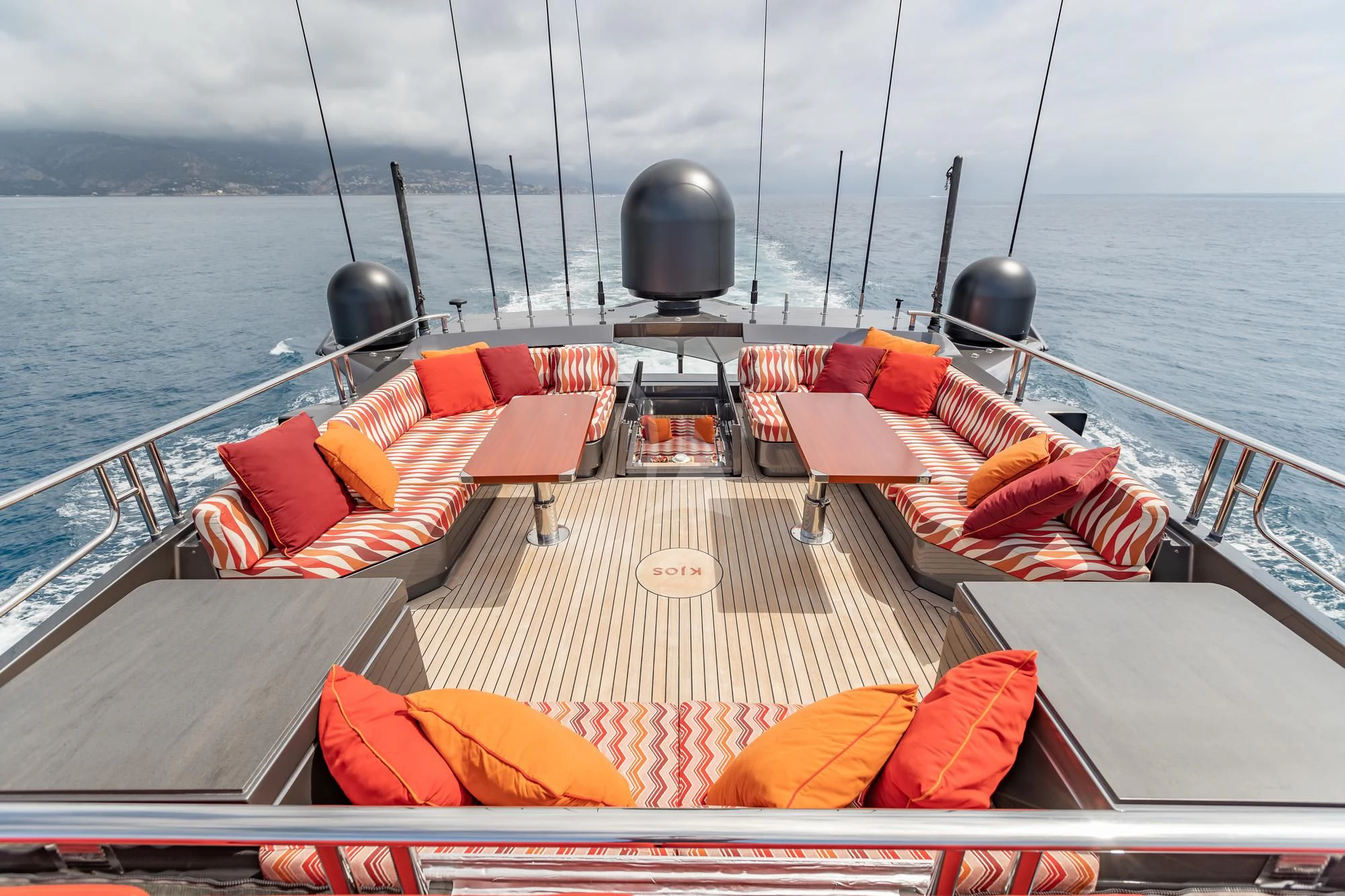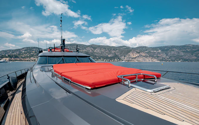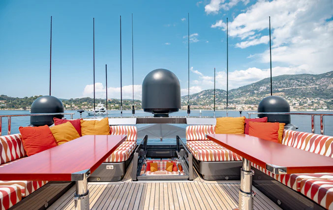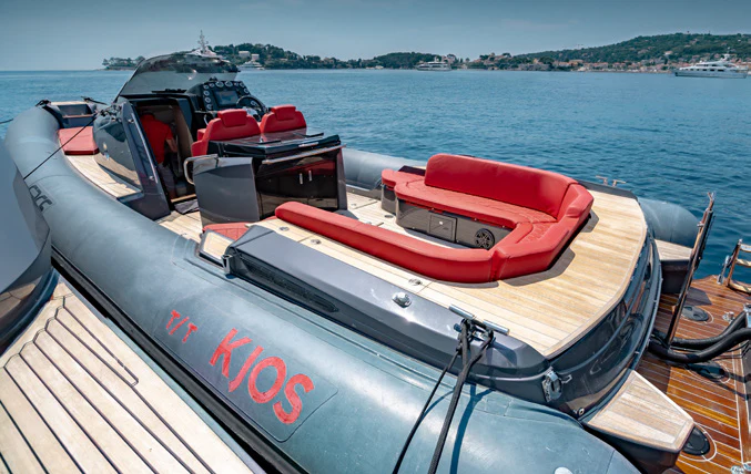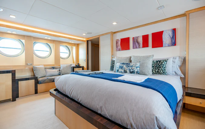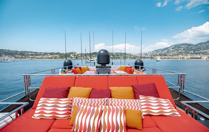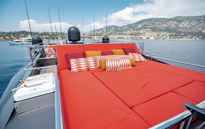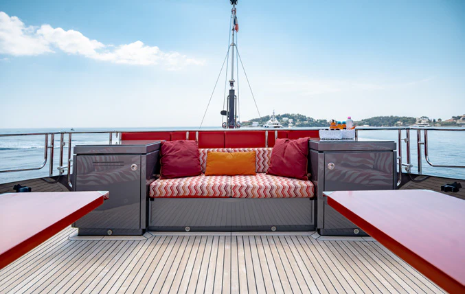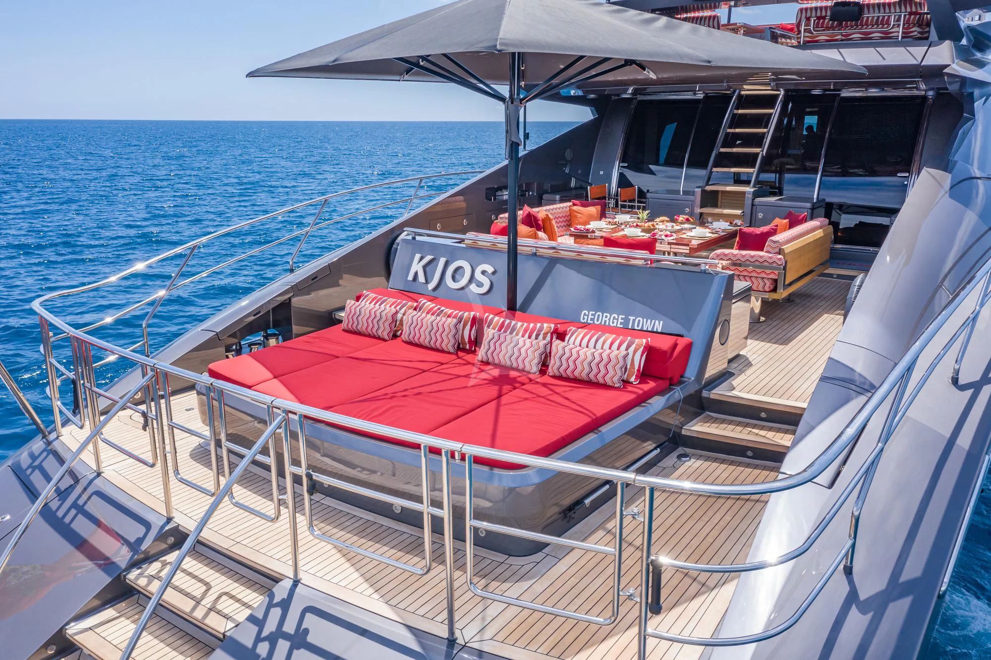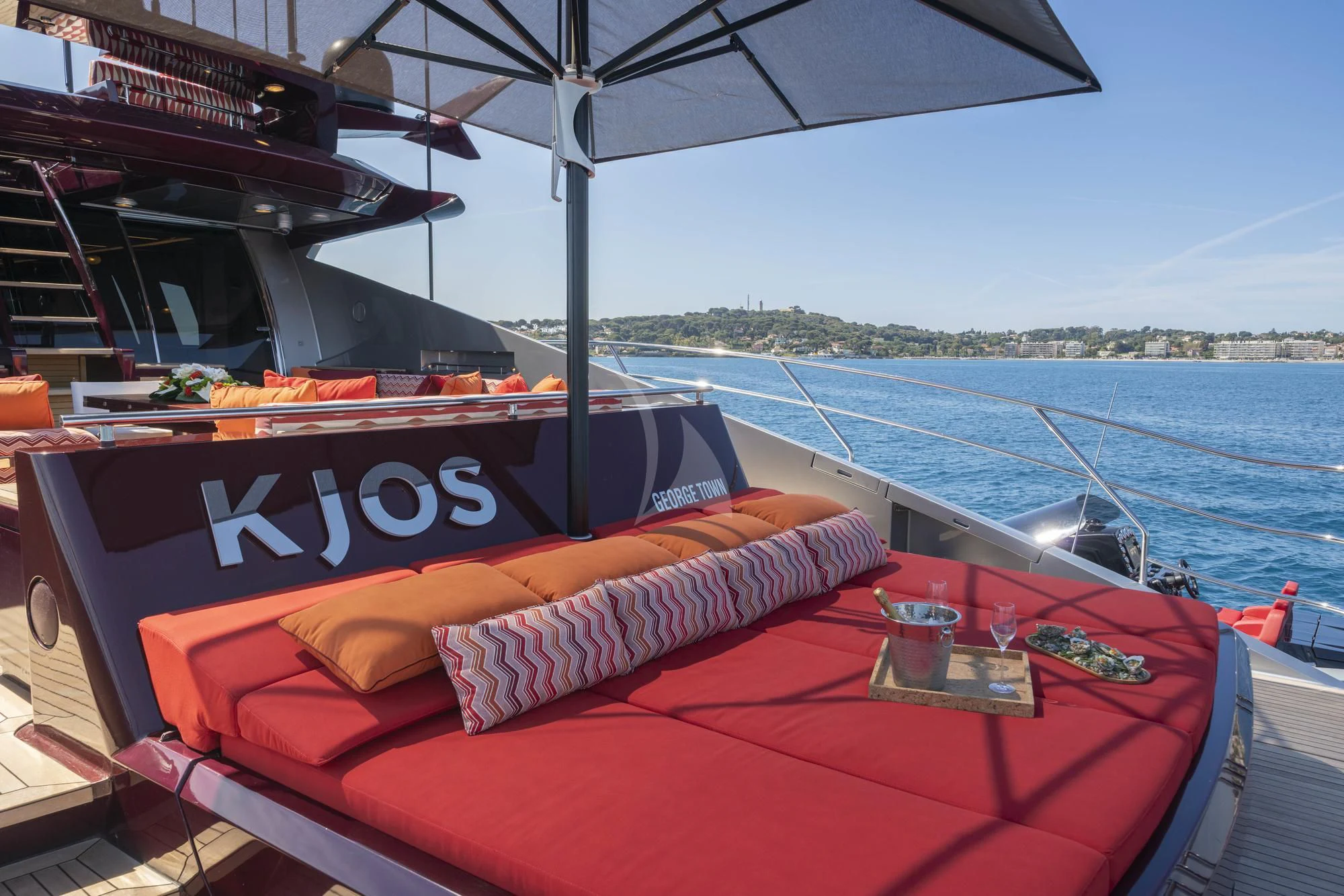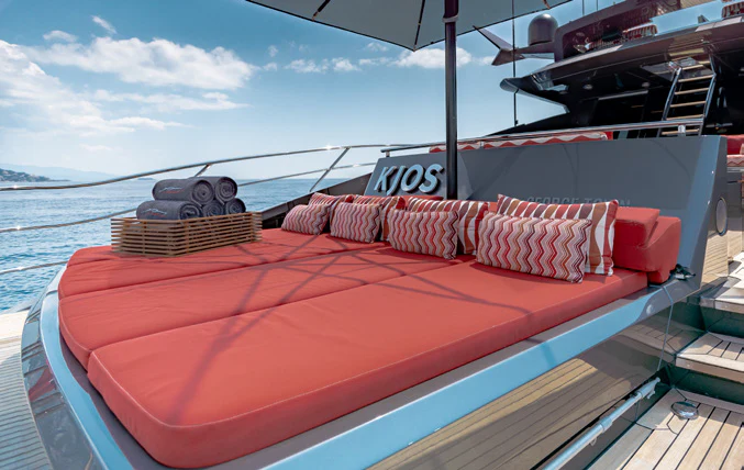 KJOS outdoor living areas are perfectly designed to take full advantage of the surrounding scenery. The flybridge is the best spot to take in the landscape with its birds-eye views, two large built-in sofas and large sunpad. Catching sunshine all day long, the yacht’s foredeck is a sunbather’s paradise. As the social hub of the yacht, charter guests will love the aft deck with its large aft-facing sunpad, three sofas and a fold-out table. The space also has informal alfresco dining. The vibrant red cushions throughout the outdoor furnishings provide a playful ambiance. A few steps down from the aft deck is a large swim platform, which allows charter guests to easily dive into the sea and enjoy KJOS selection of water toys.