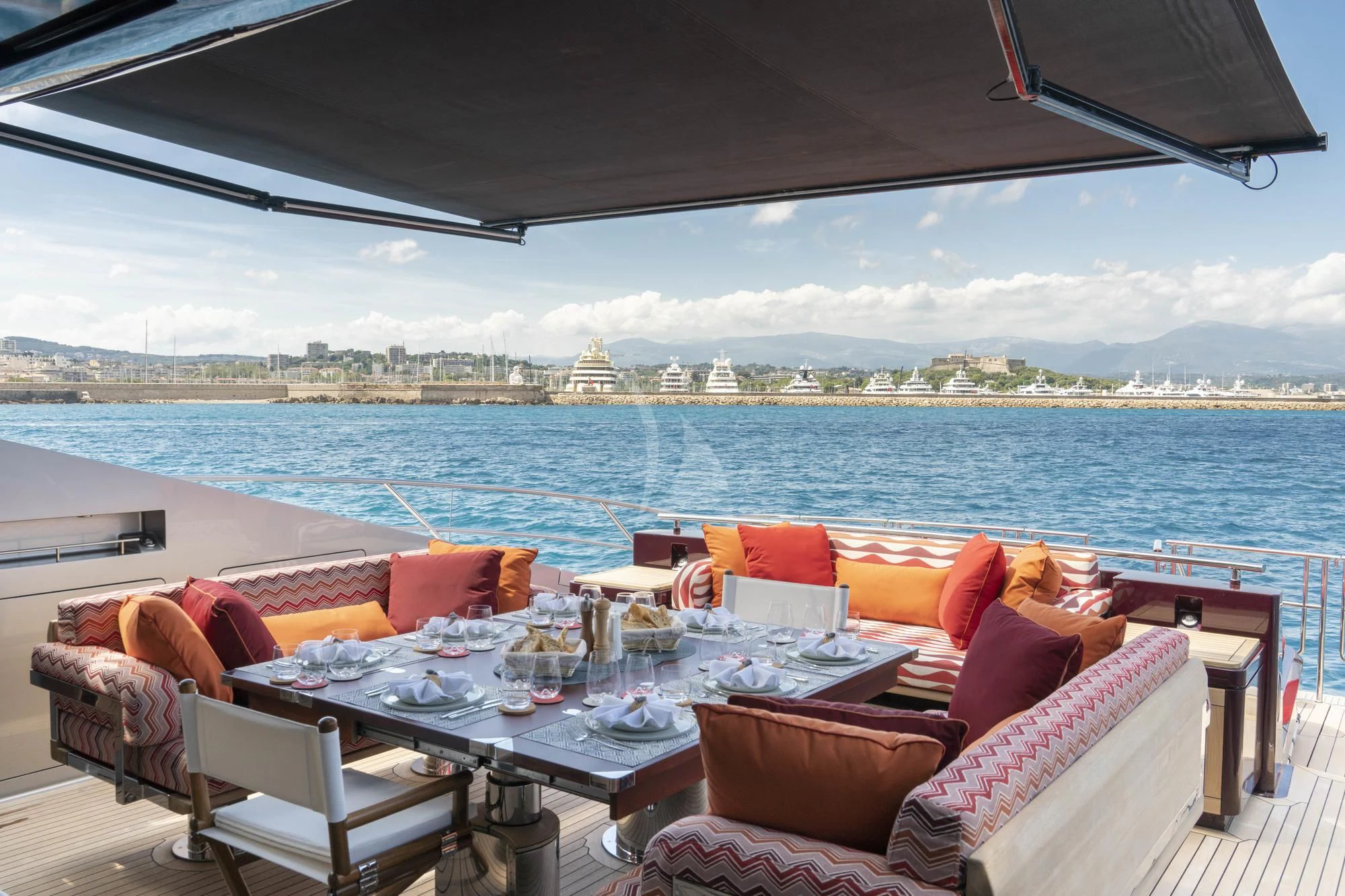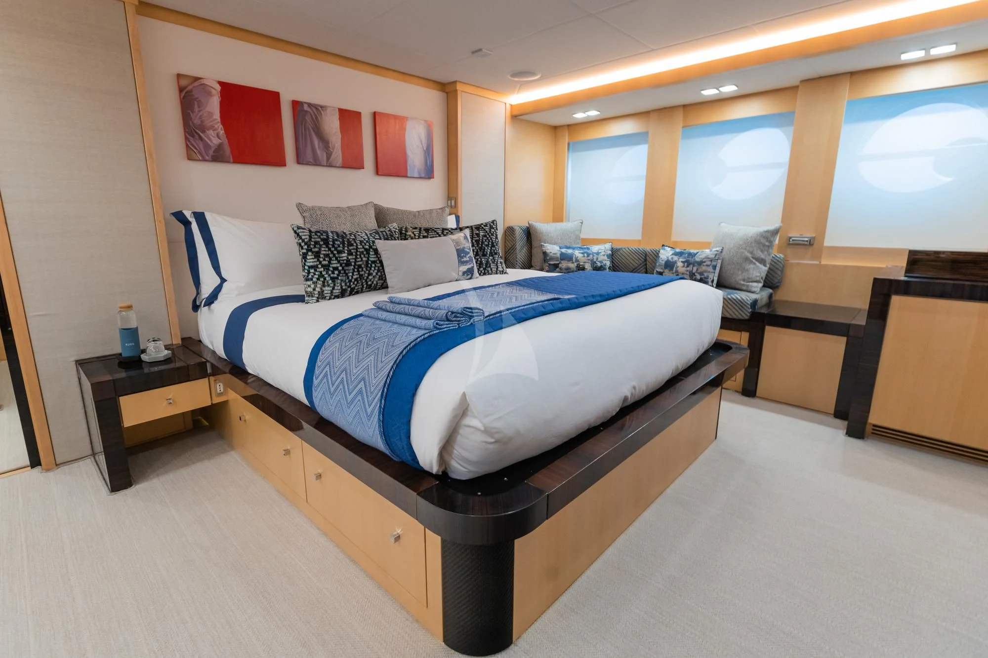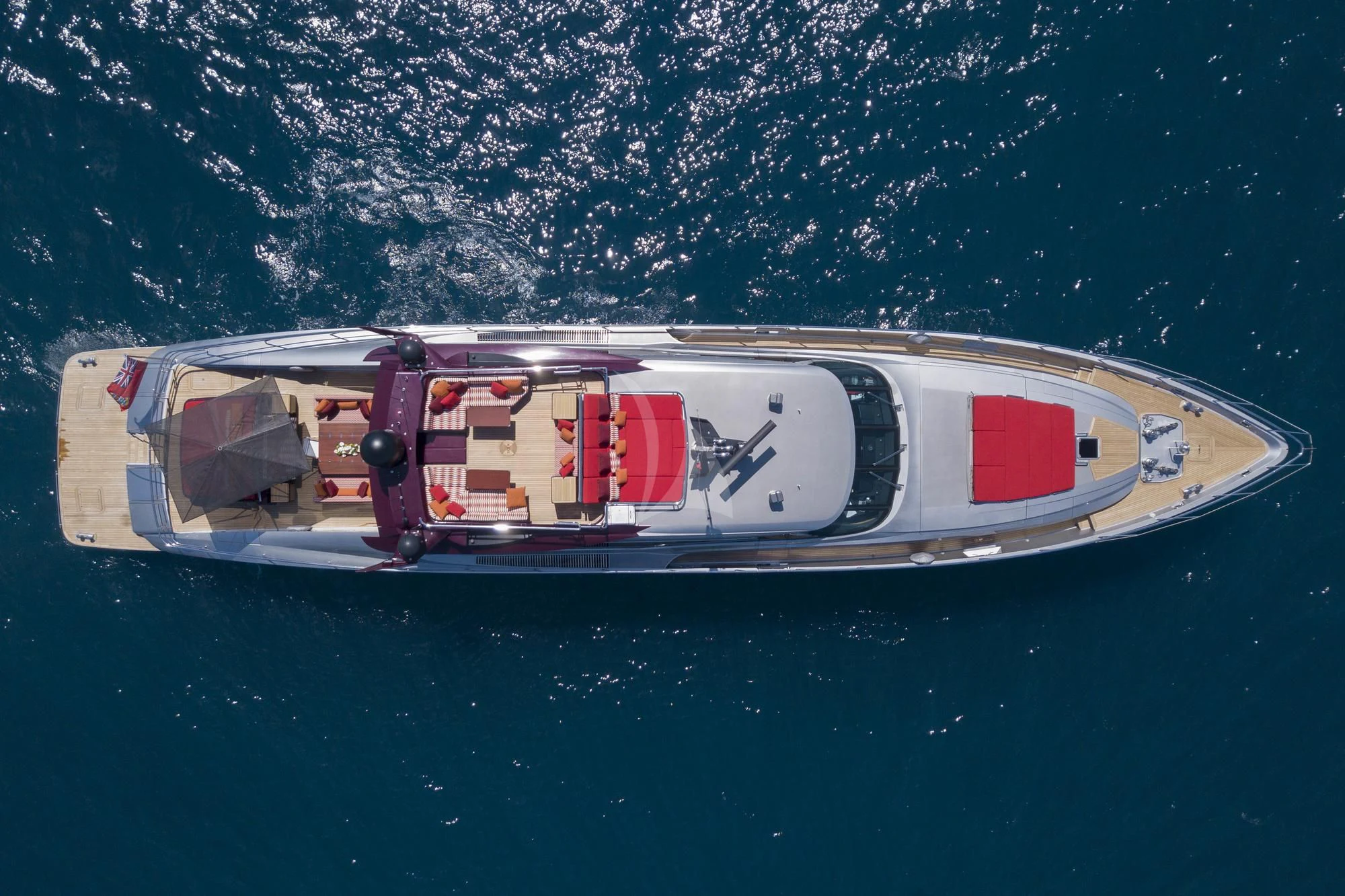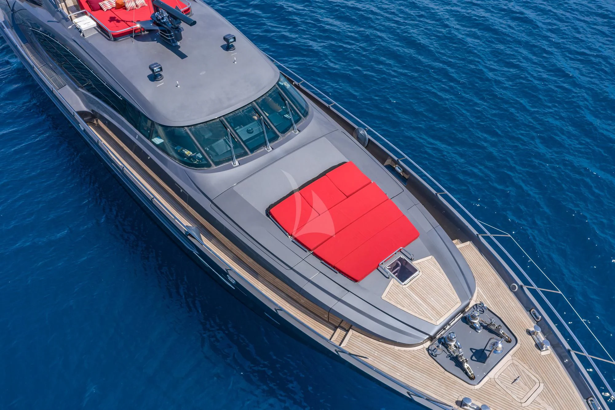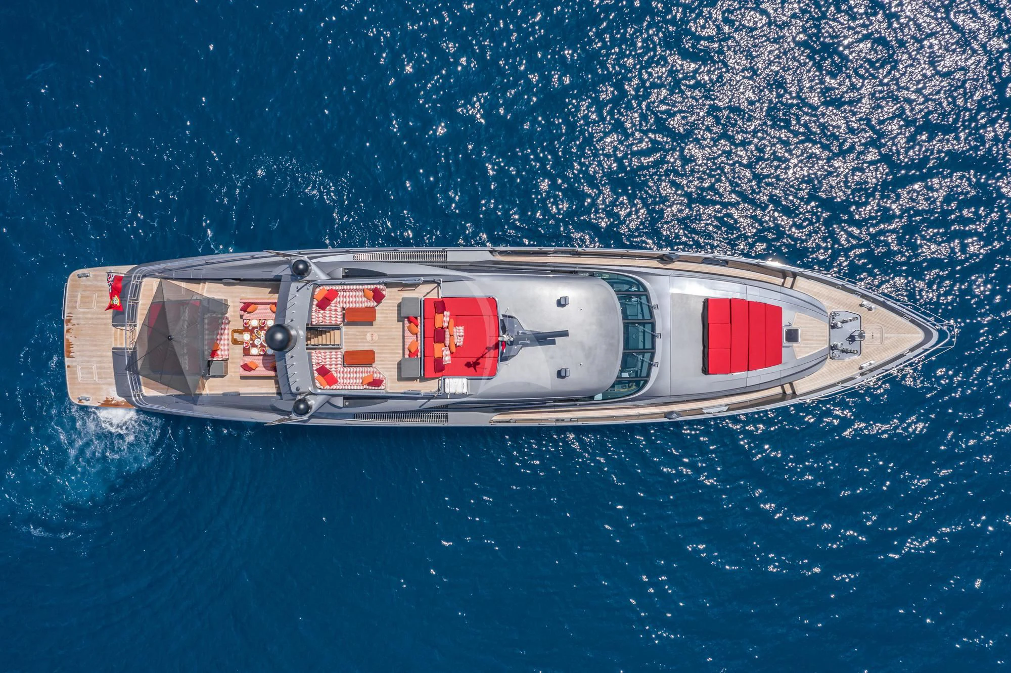 KJOS outdoor living areas are perfectly designed to take full advantage of the surrounding scenery. The flybridge is the best spot to take in the landscape with its birds-eye views, two large built-in sofas and large sunpad. Catching sunshine all day long, the yacht’s foredeck is a sunbather’s paradise. As the social hub of the yacht, charter guests will love the aft deck with its large aft-facing sunpad, three sofas and a fold-out table. The space also has informal alfresco dining. The vibrant red cushions throughout the outdoor furnishings provide a playful ambiance. A few steps down from the aft deck is a large swim platform, which allows charter guests to easily dive into the sea and enjoy KJOS selection of water toys.