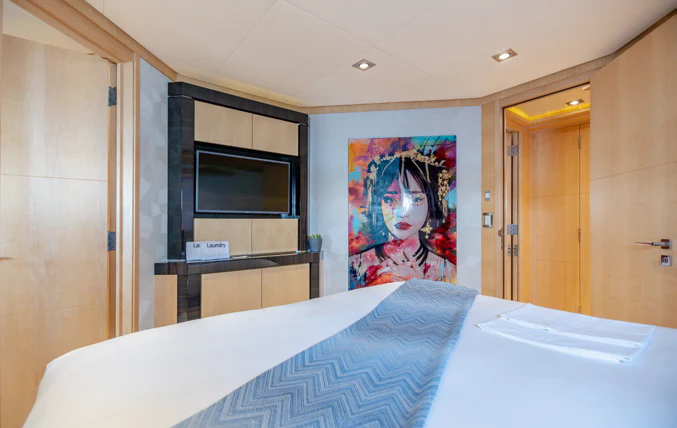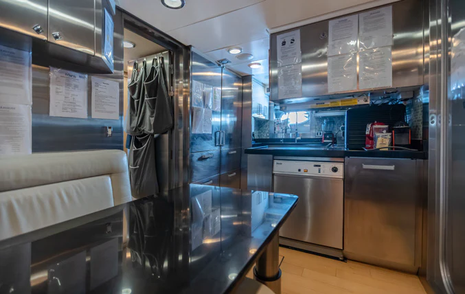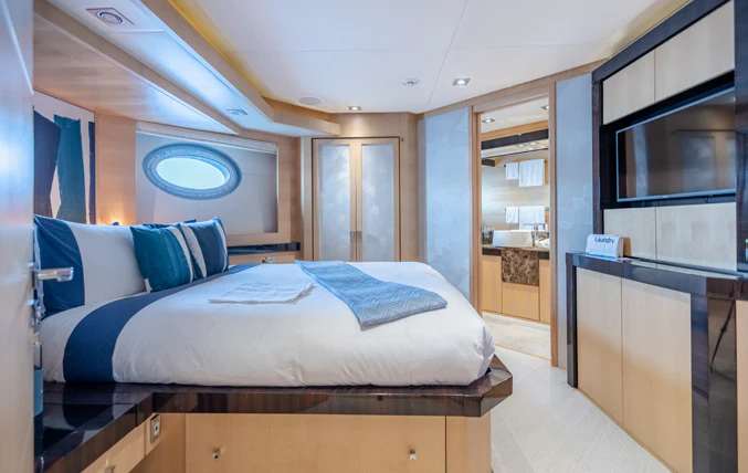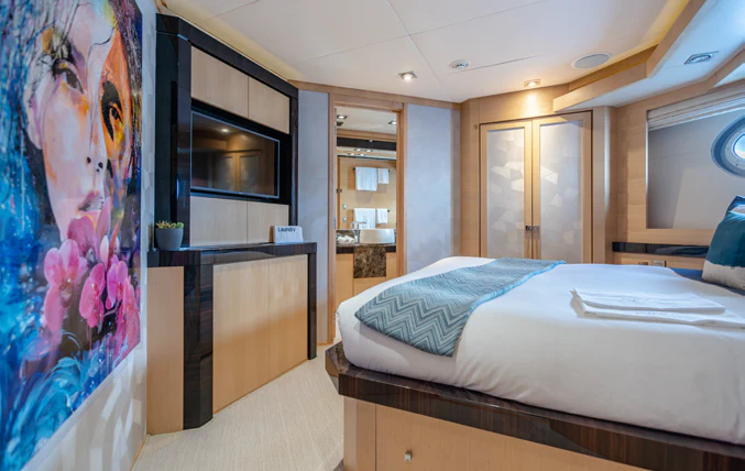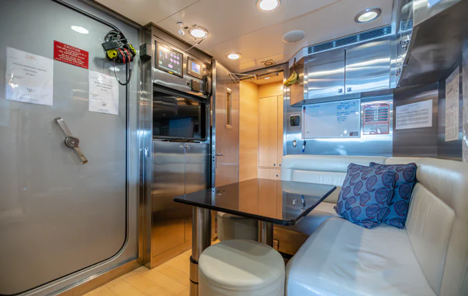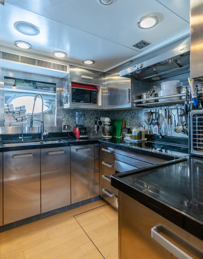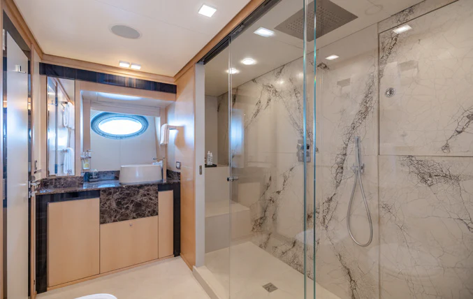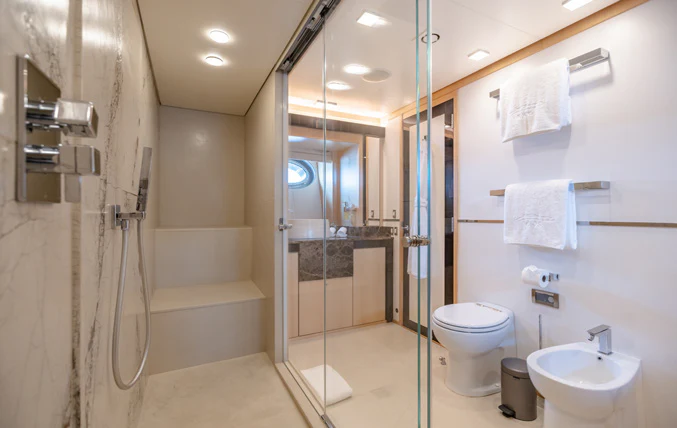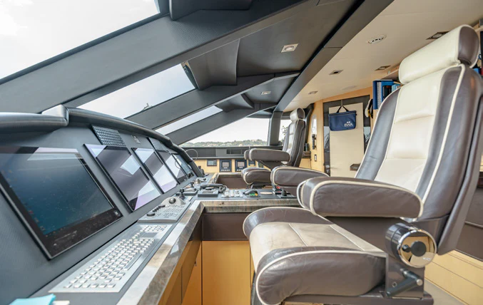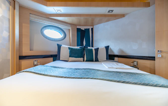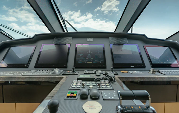 KJOS provides eight guests with the utmost comfort in four divine staterooms. Plush and tranquil, the yacht’s master stateroom showcases a double bed, a built-in seating area and en-suite bathroom with his-and-her sinks and a large shower. Equally as impressive, are two double-bed staterooms with en-suite bathrooms. The fourth stateroom is equipped with twin beds and has its own dedicated en-suite shower room. It can also be used as a private salon or TV room.