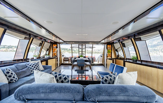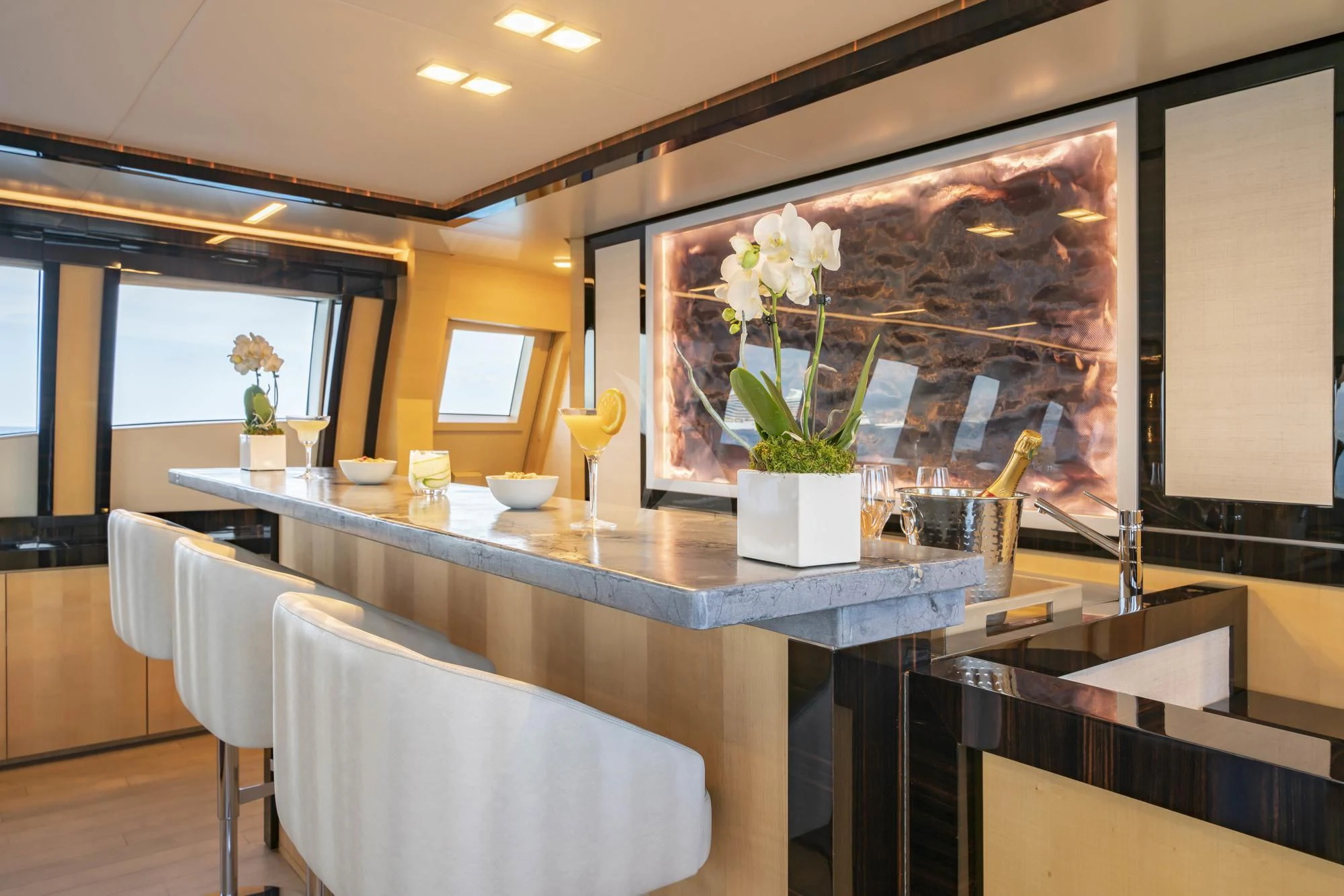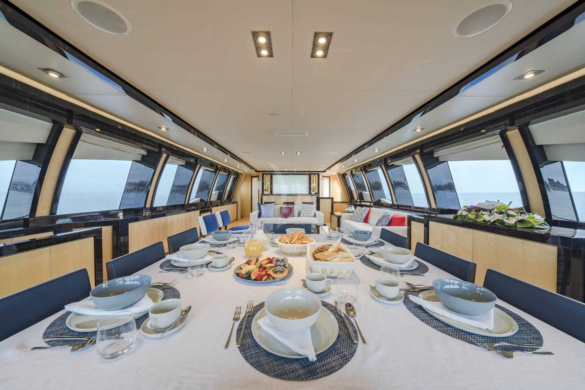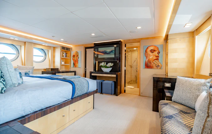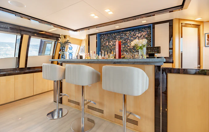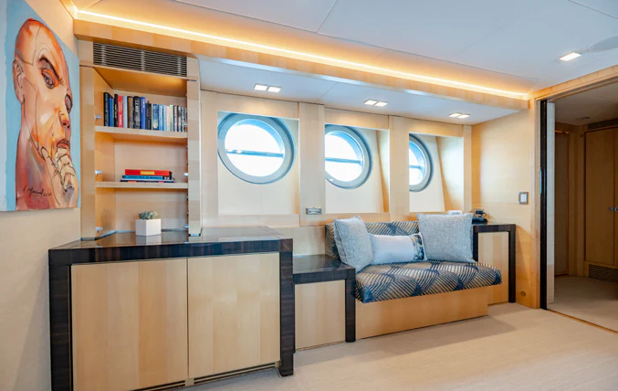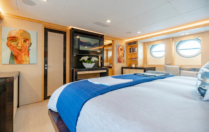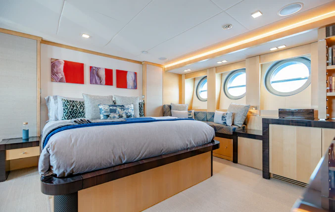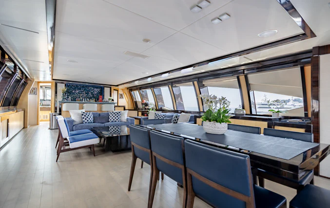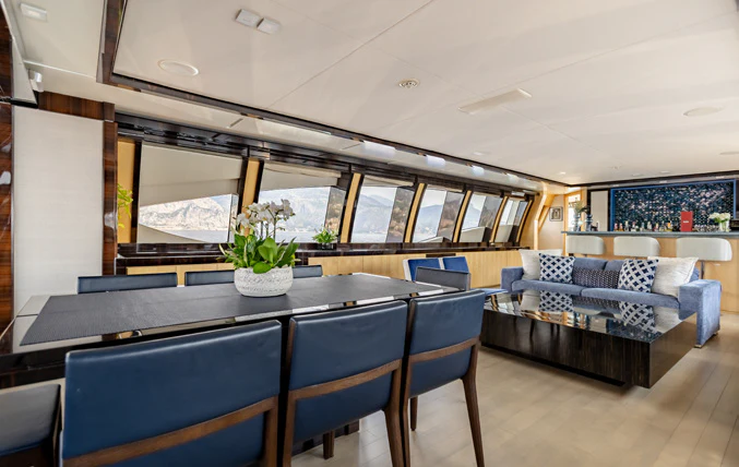 Large sliding glass doors from the main deck aft welcome charter guests into KJOS spacious and contemporary styled interior. Oversized windows span the length of the interior, flooding the space with natural light and providing never-ending views while lounging in comfort. The charter yacht’s formal dining is located aft, giving guests impressive views while enjoying delicacies prepared by the chef. The superyacht’s main salon is the perfect space for socializing and unwinding with its ample seating and bar.
