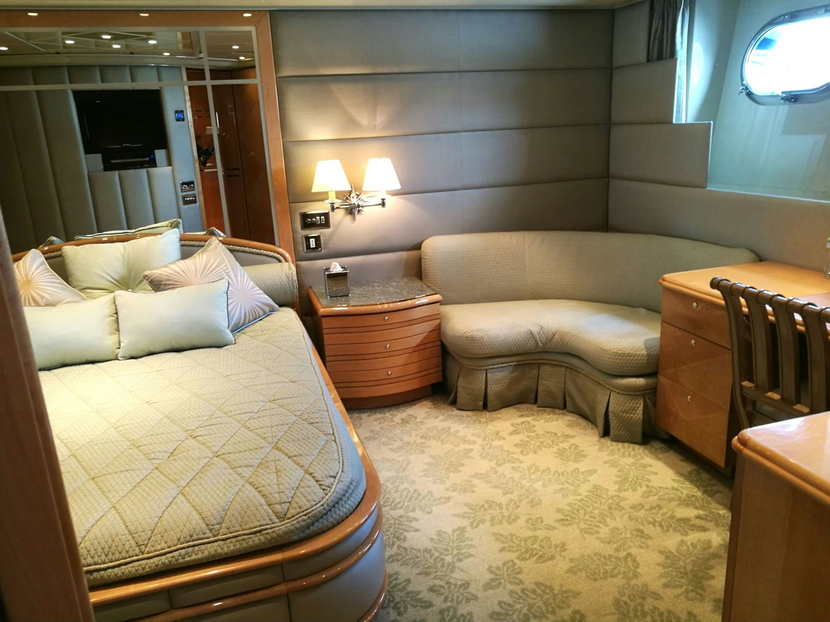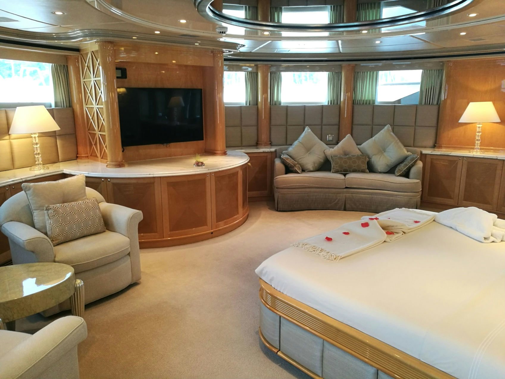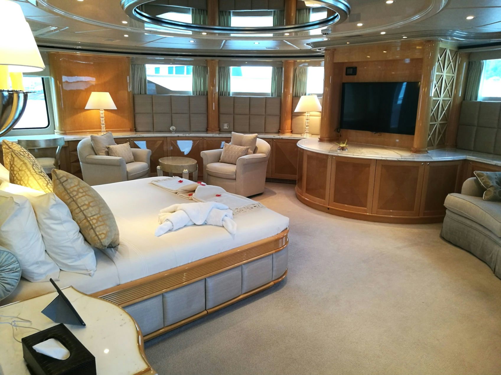 After a day of fun in the sun, be entertained by a movie in the yacht’s home cinema in the sky lounge or have a relaxing time lounging on the fly bridge.