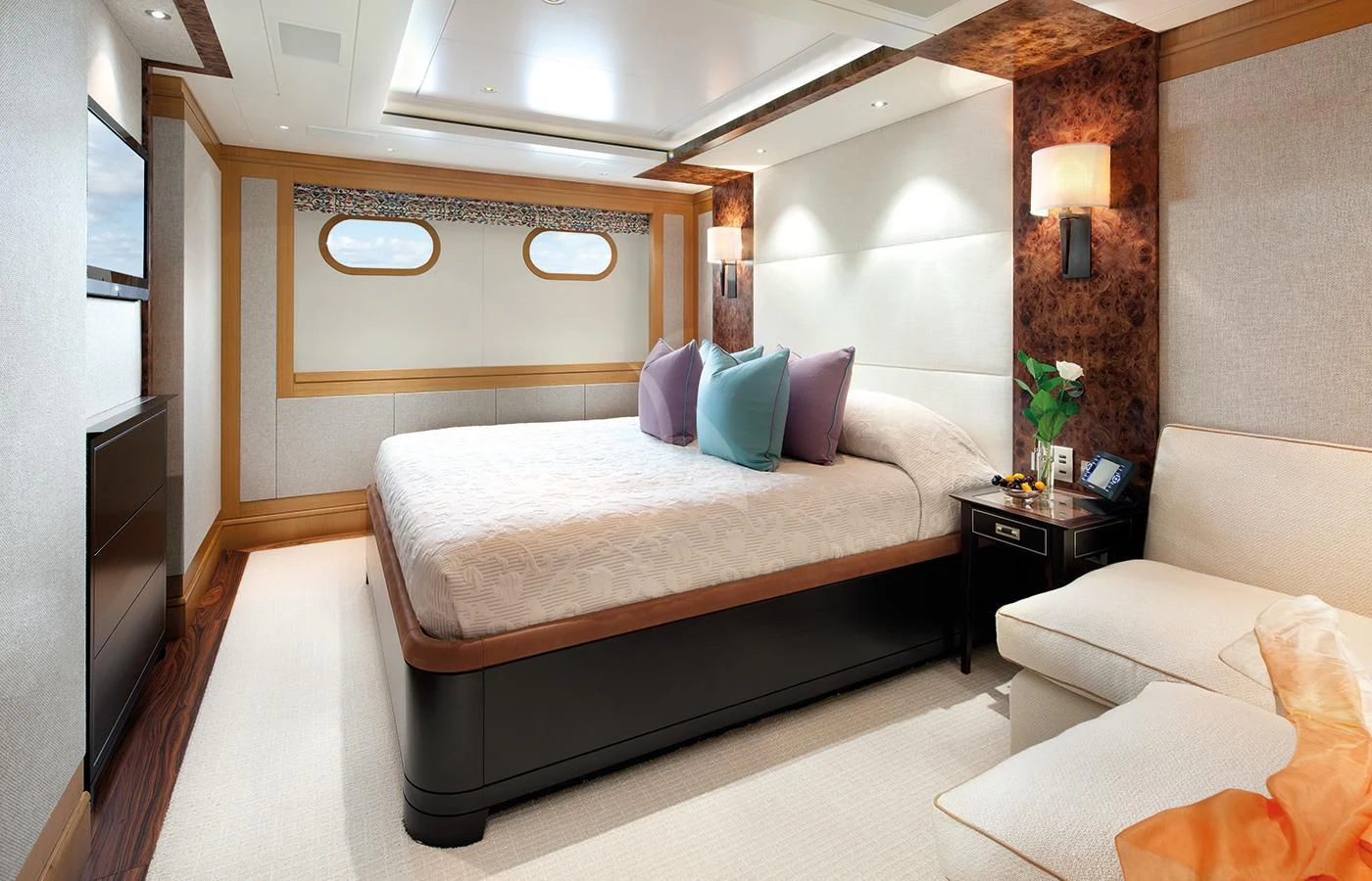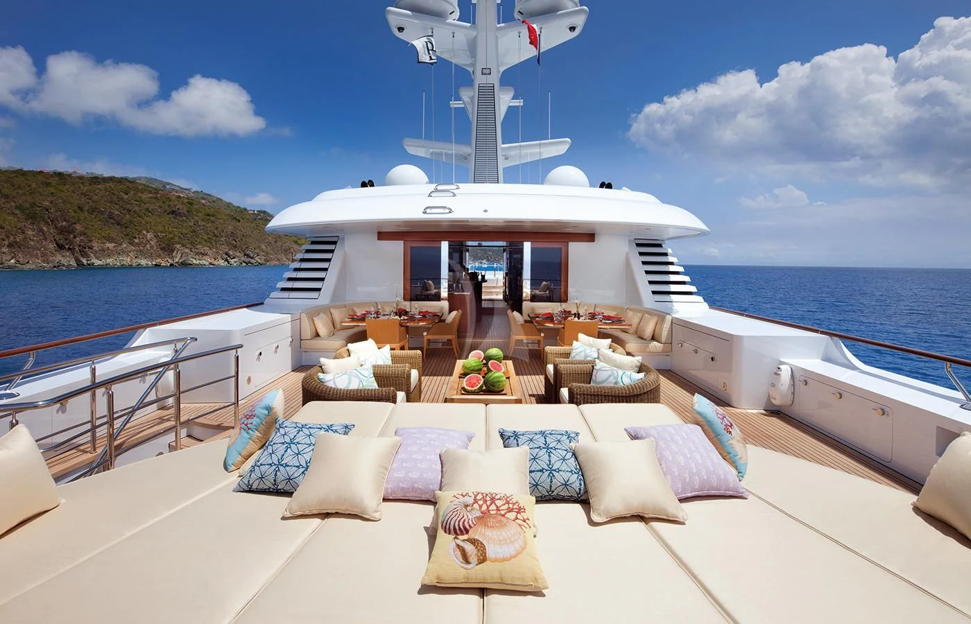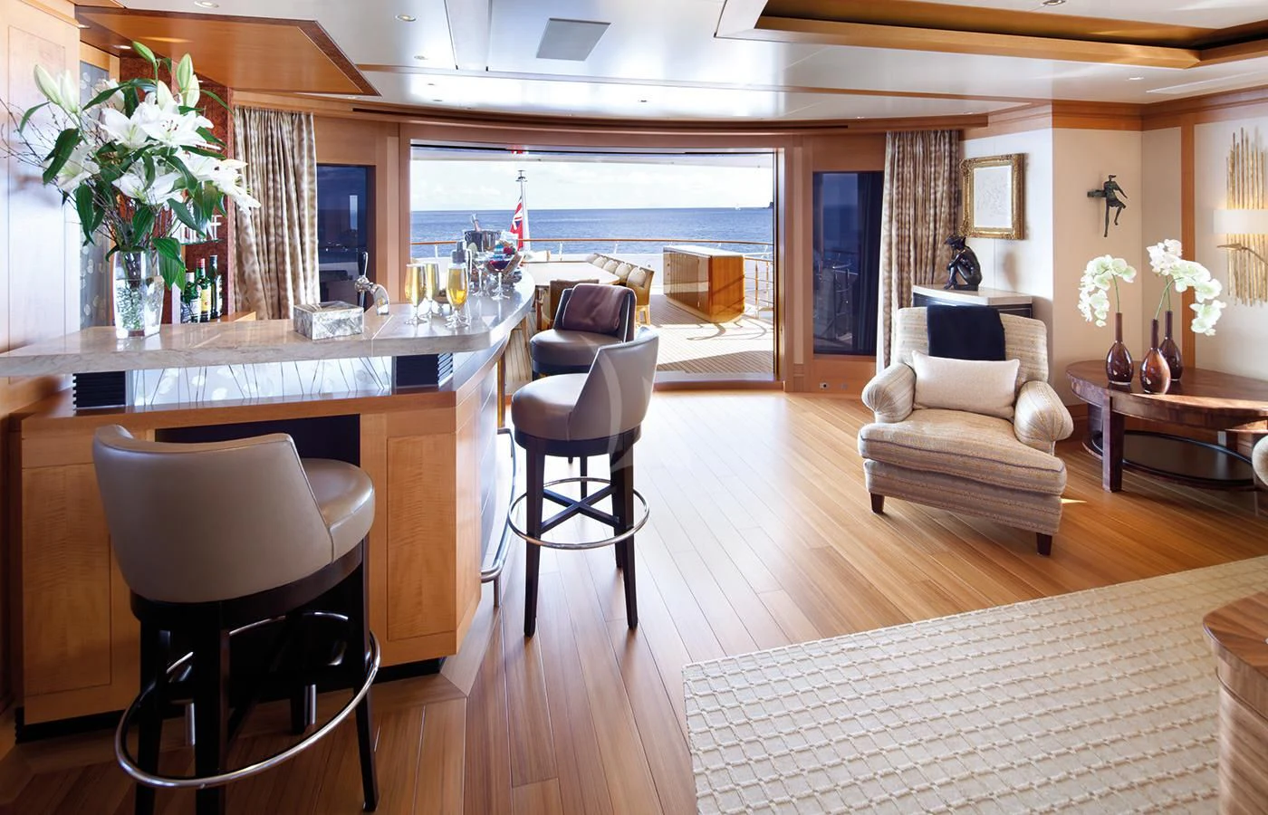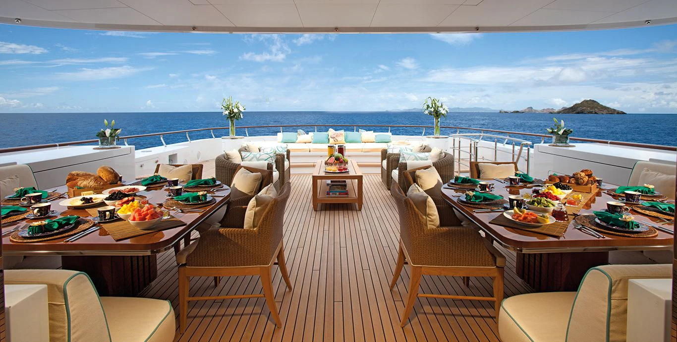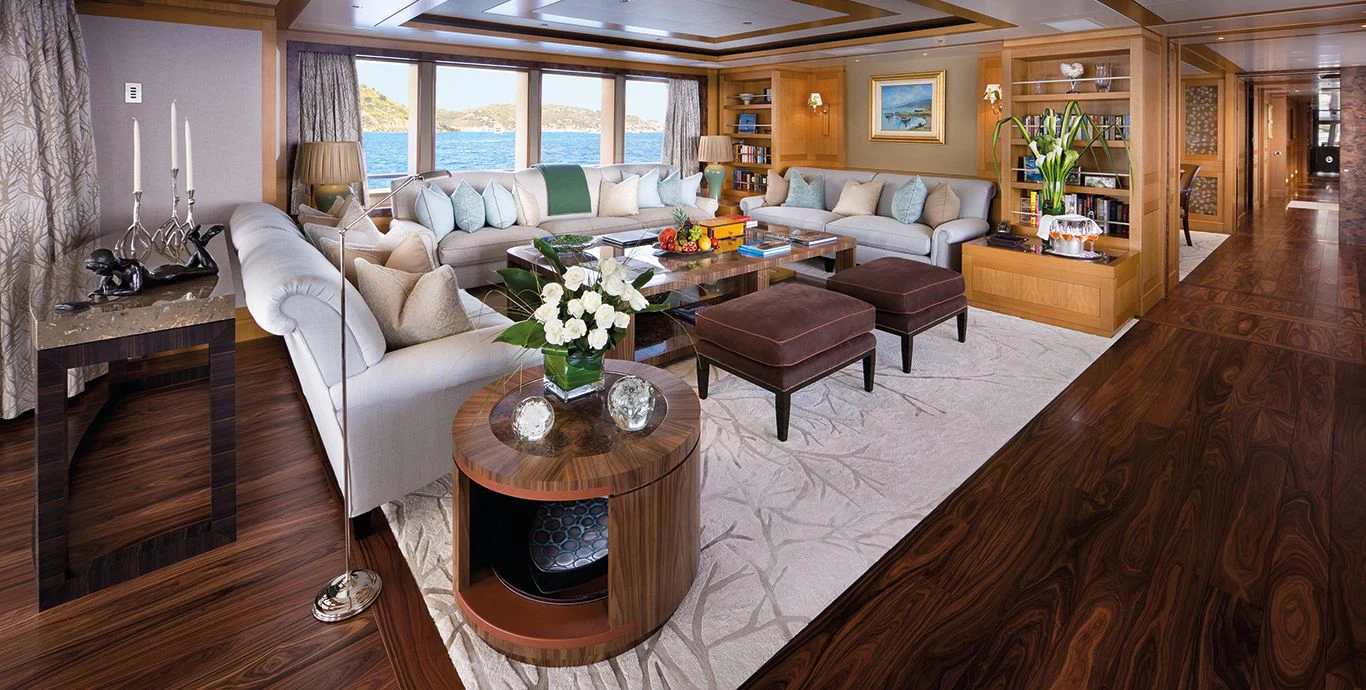 LADY BRITT’s classic contemporary interior combines New York apartment style with a hint of Scandinavian design. A large upper deck salon features a comfortable seating area, small games table and sit up bar, while the main salon offers a sumptuous lounge set up and separate formal dining salon. Her flexible accommodation can be converted to suit charter guests’ needs. Her main-deck master suite is complemented by six guest staterooms, all located on the lower deck. Two of these can be transformed into a full-width VIP.