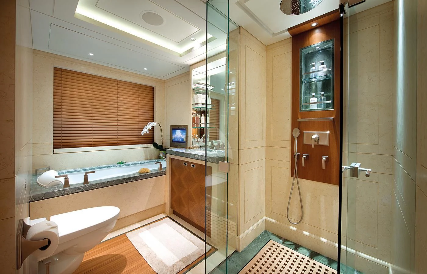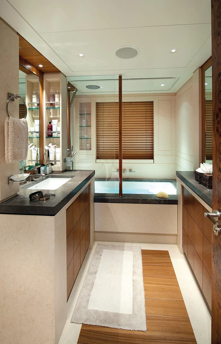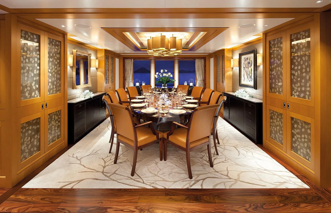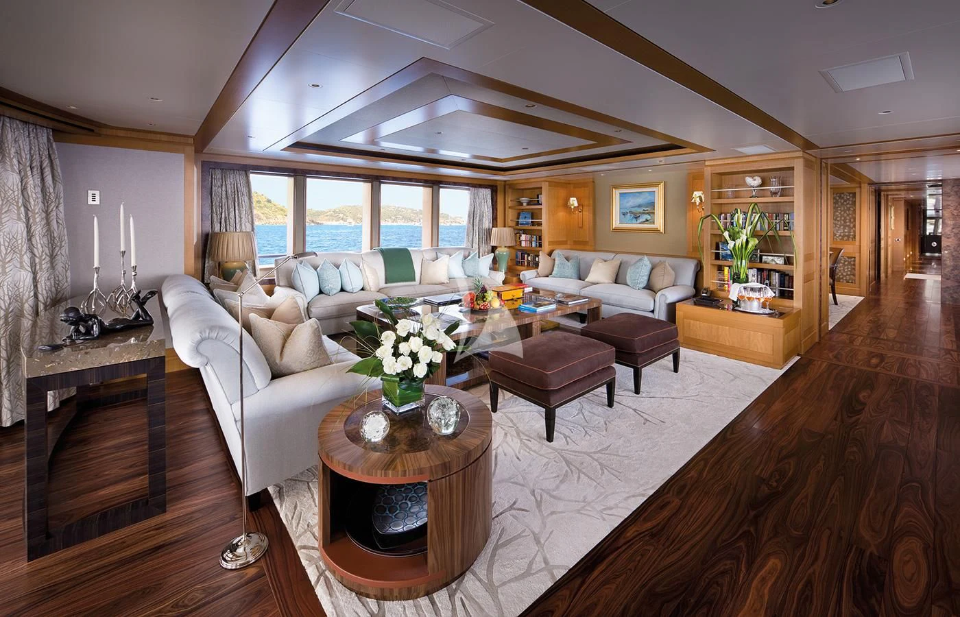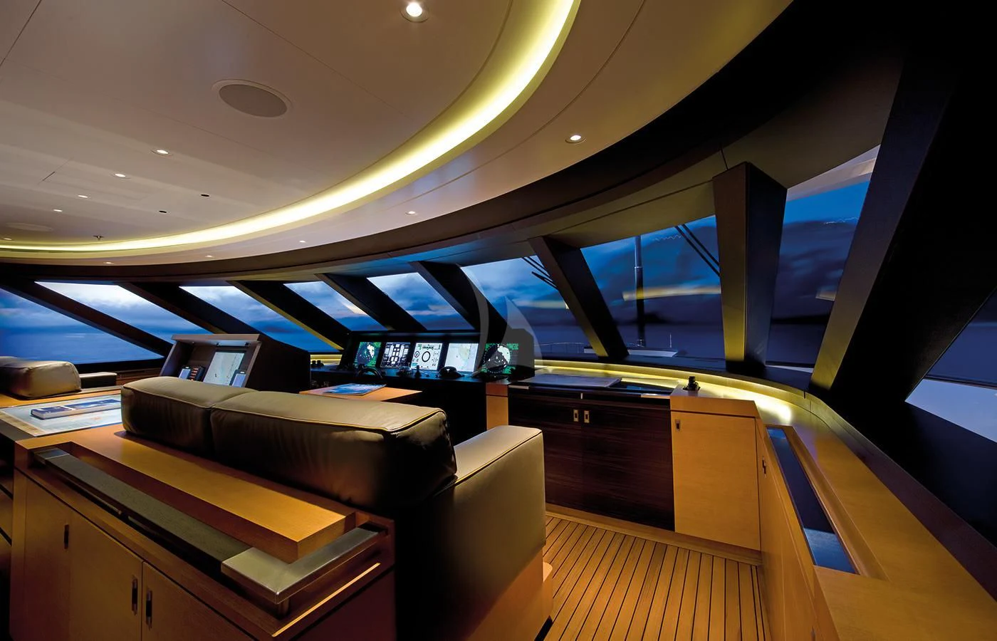 LADY BRITT’s classic contemporary interior combines New York apartment style with a hint of Scandinavian design. A large upper deck salon features a comfortable seating area, small games table and sit up bar, while the main salon offers a sumptuous lounge set up and separate formal dining salon. Her flexible accommodation can be converted to suit charter guests’ needs. Her main-deck master suite is complemented by six guest staterooms, all located on the lower deck. Two of these can be transformed into a full-width VIP.