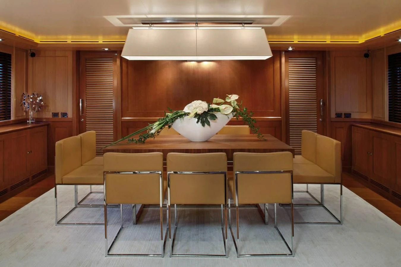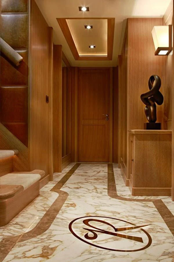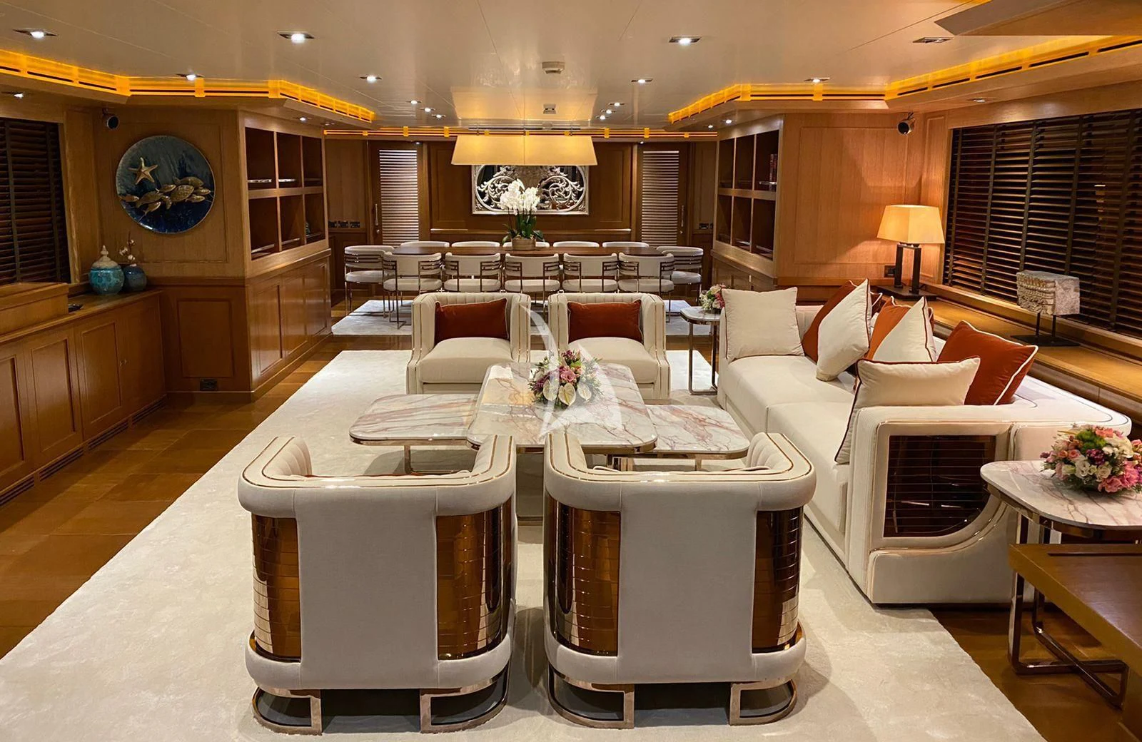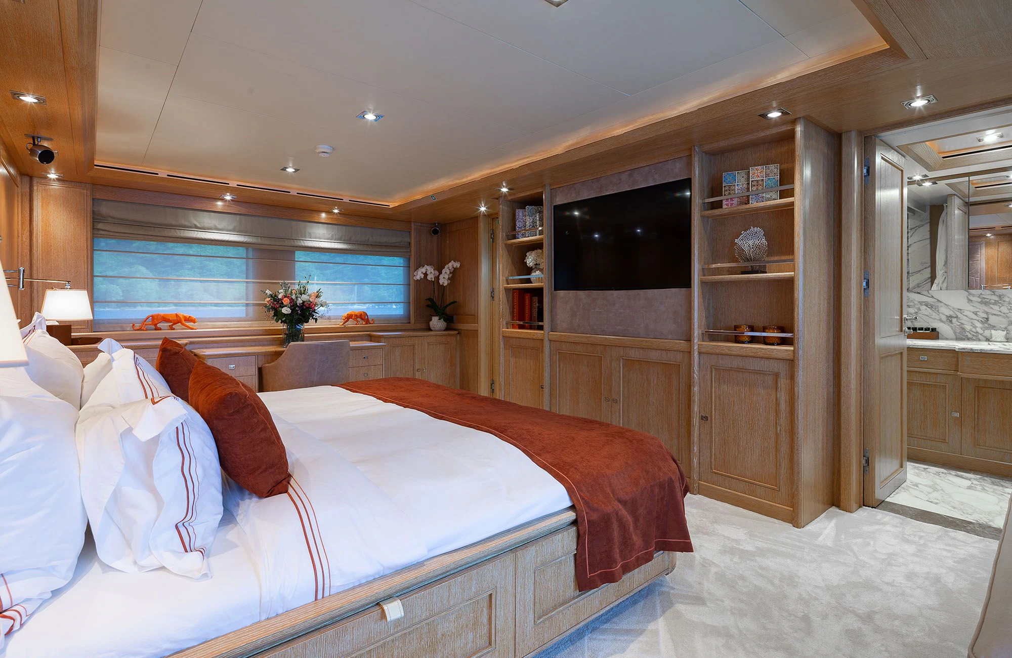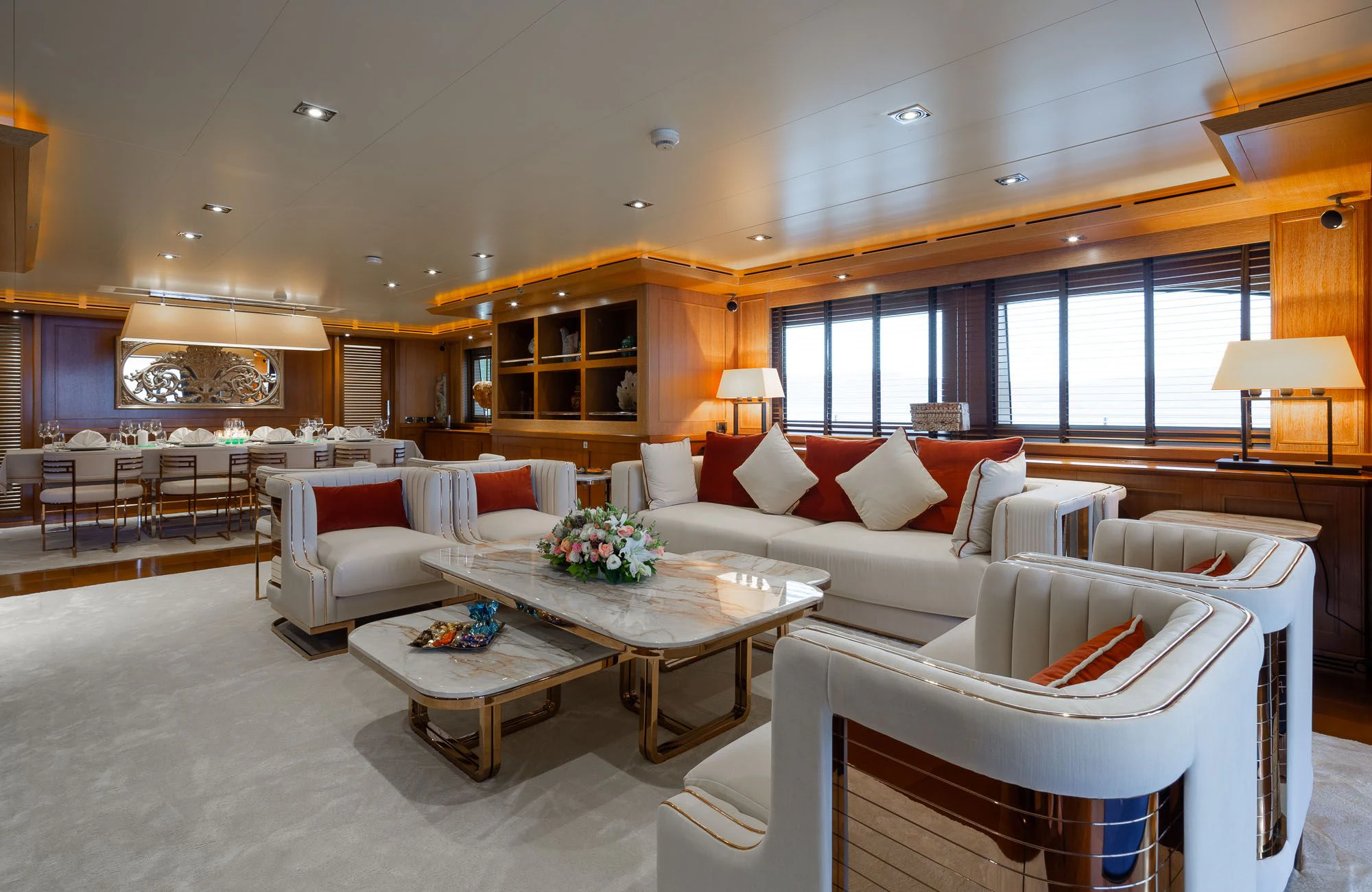The interiors on LADY I are sophisticated and modern with a stylish art deco sensibility. Zuccon International Project made lavish use of warm-toned walnut paneling and cabinets, striped oak flooring, supple leather, cream marble and sleek metallic detailing throughout to create inviting spaces to relax, entertain, and socialize. The main salon is a stunning open-plan space with plenty of natural light from the surrounding panoramic windows. The aft doors open to a sumptuous lounge with gorgeous bucket armchairs and a deep-cushioned sofa in cream leather and shiny rose gold. There are stunning nested coffee tables topped in white marble with pink-hued veining making this an elegant and inviting space to sip cocktails and share conversation before dinner at the elegant dining table further forward. Seating 12 in beautiful art déco inspired chairs in rose gold and cream leather, this is the perfect spot for elaborate celebration dinners prepared by LADY I’s a talented chef. A more relaxed vibe can be found in LADY I’s stylish upper deck skylounge where there’s a sit-up bar for cocktails and nightcaps, a games table for cards and a huge sofa for nestling back and watching a movie on the widescreen TV.